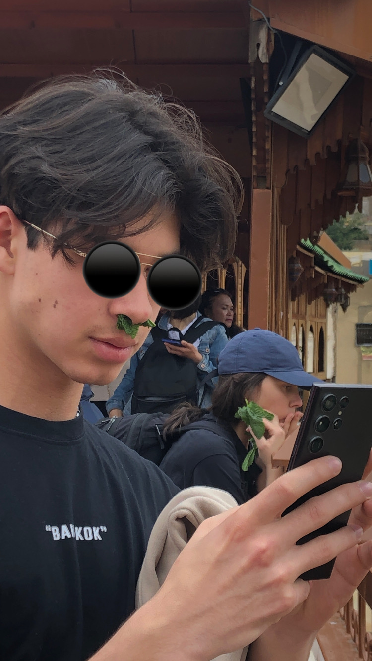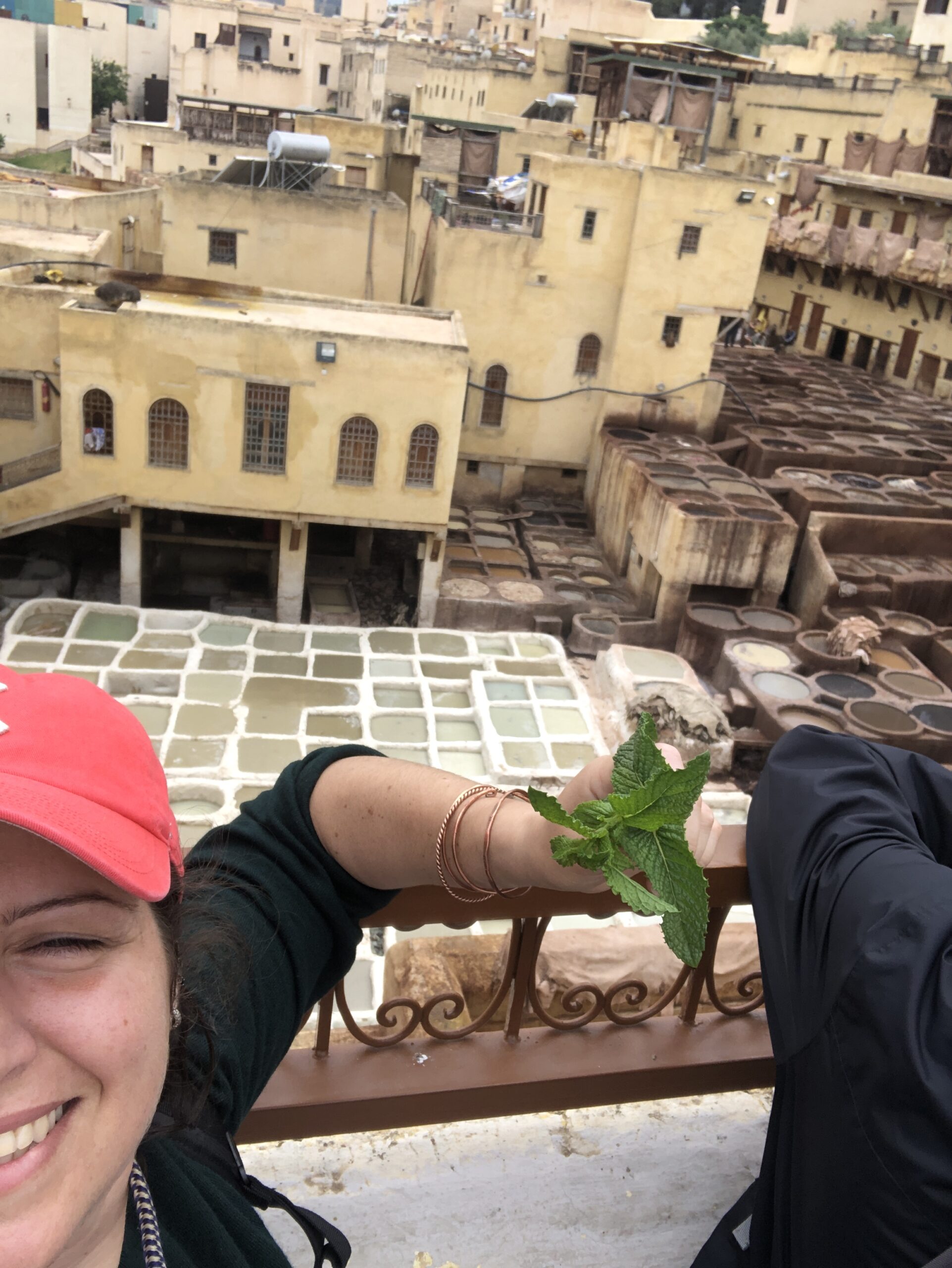 La terrazza dal quale si affacciano tutti i turisti (come noi) fa parte di un negozio di abbigliamento (ovviamente in pelle) e valigeria. Ce ne sono diversi che permettono di ammirare le vasche dall’alto e sono i proprietari stessi che vanno in cerca di stranieri per strada offrendo loro ramoscelli di menta, speranzosi di concludere a fine visita almeno una vendita. Con noi il titolare dell’esercizio commerciale casca male anzi, malissimo, siamo così squattrinati che quasi quasi ci viene in mente di conservarci la menta per un cocktail pomeridiano. (Ovviamente non lo facciamo, sarebbe stato un po’ troppo anche per noi il mojito con lime, zucchero di canna e caccole.)