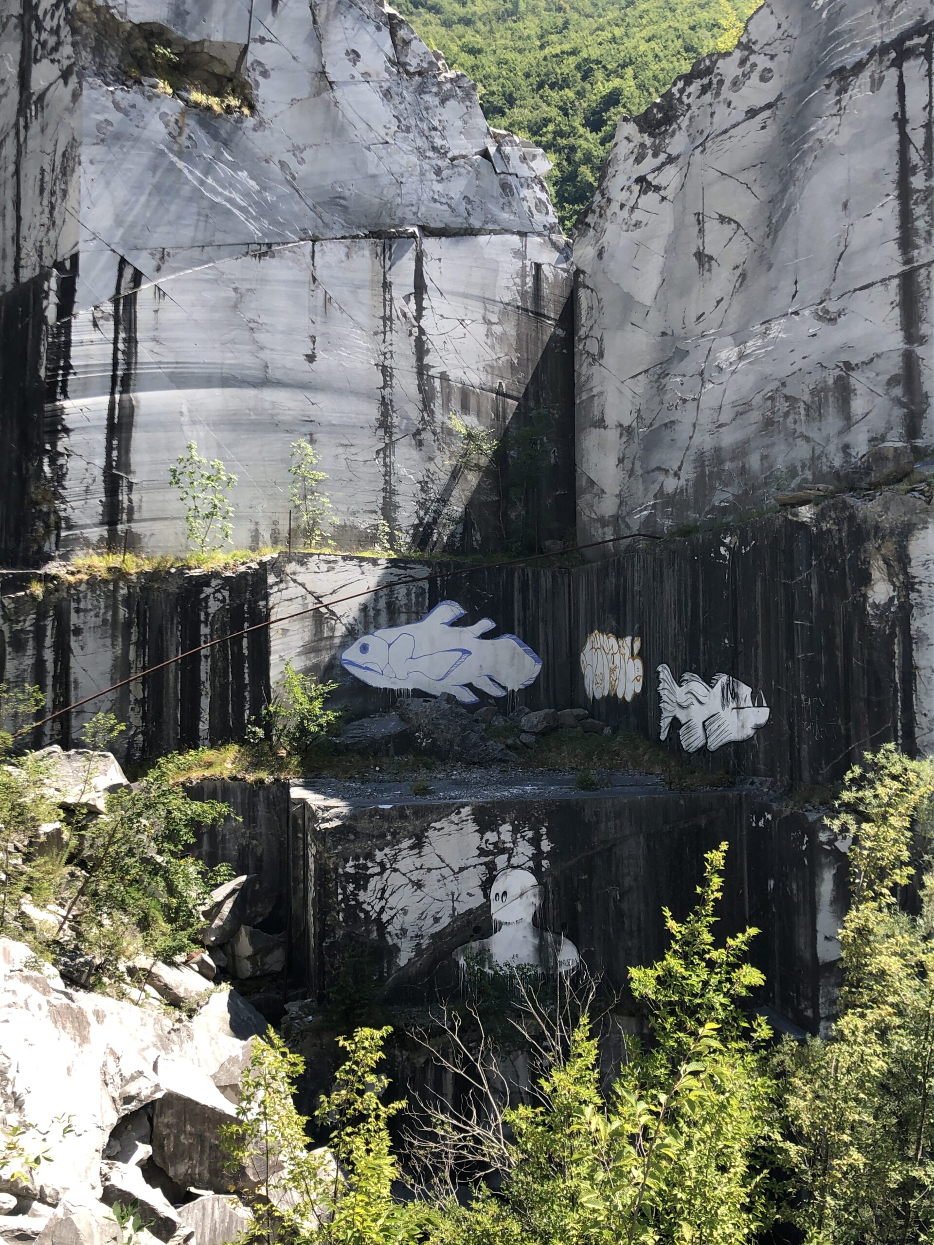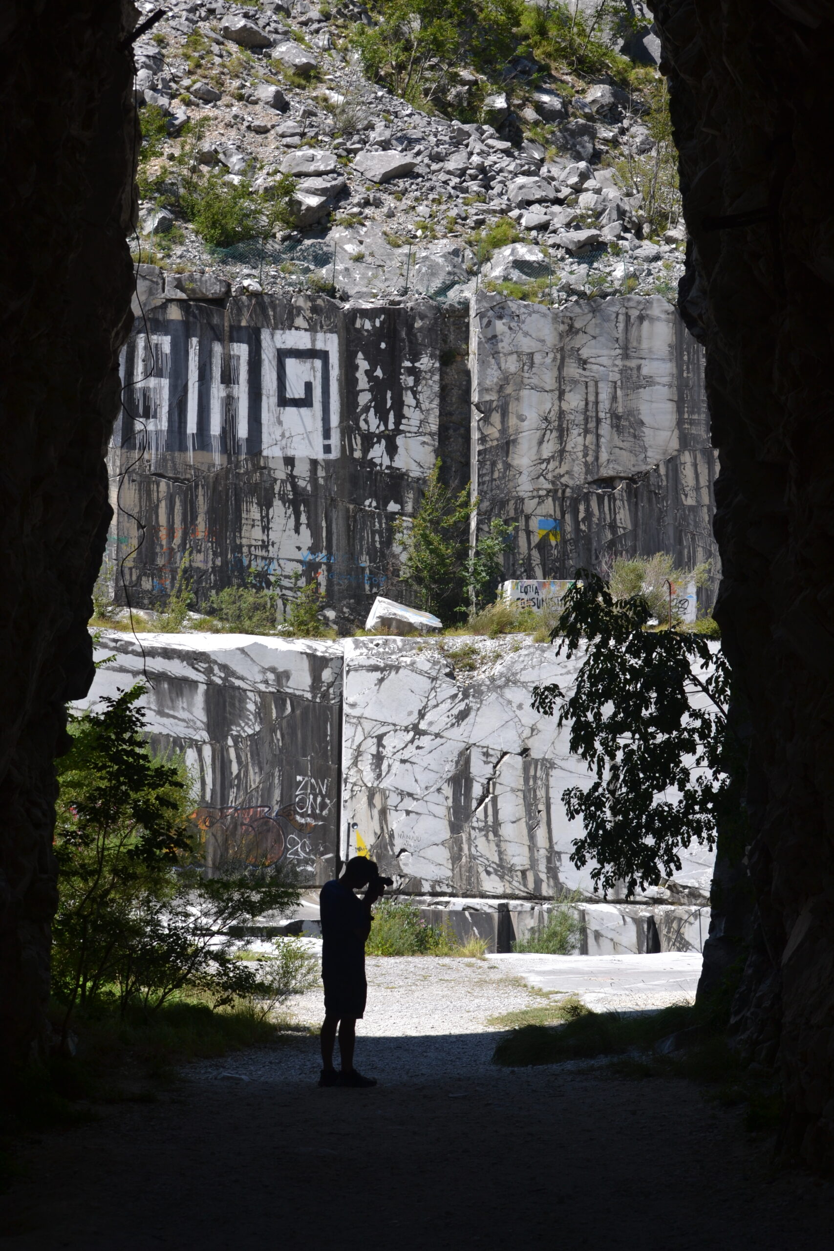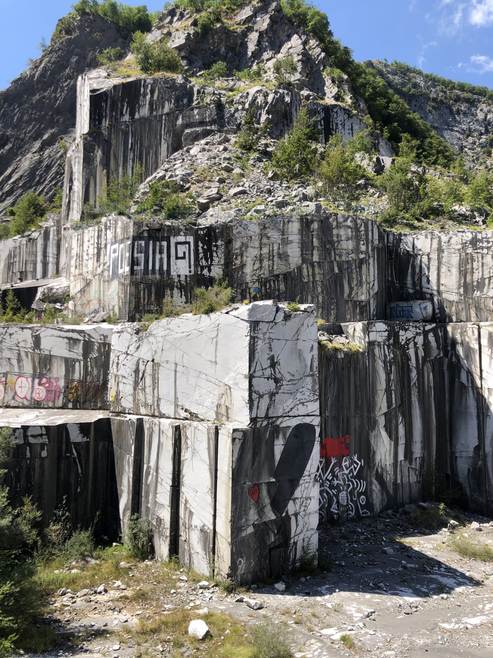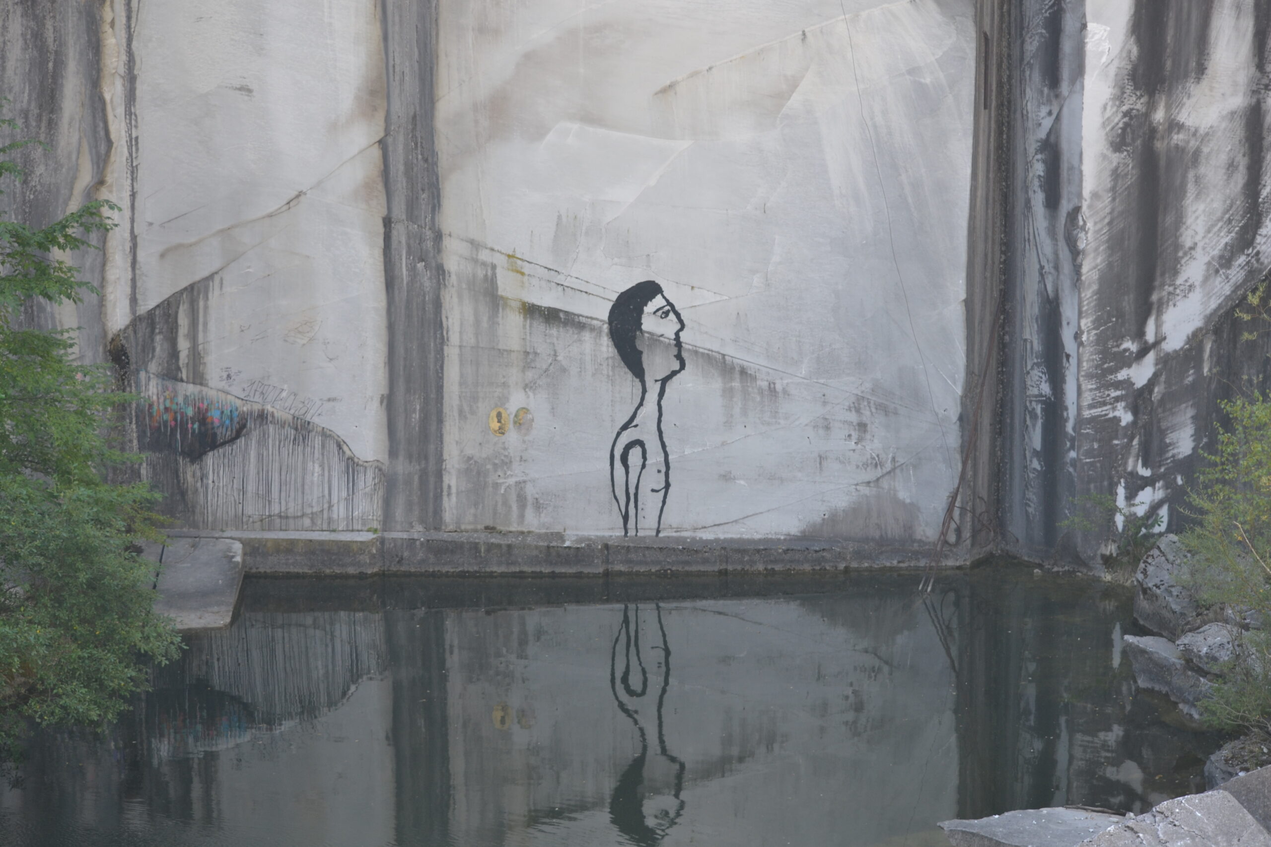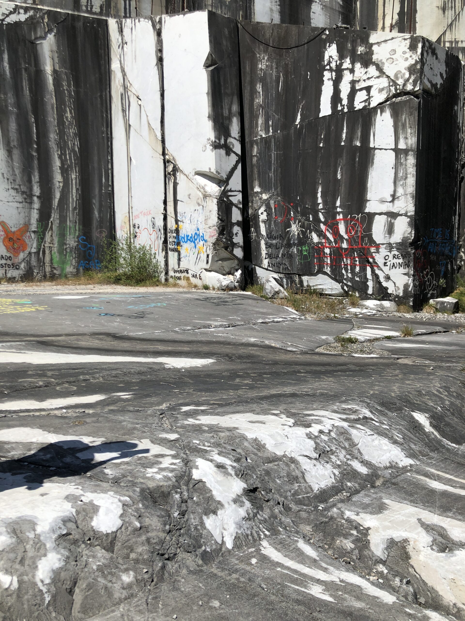 Avendo già visitato altre cave, mi aspettavo un ambiente più geometrico e freddo. Gli arbusti verdi che stanno rivendicando il loro spazio hanno stemperato quell’atmosfera austera e nuda che ci si aspetta da una zona di scavi del marmo. Resta il silenzio a dominarla e l’incertezza della vita in un luogo che appare morto. I murales, che pare siano la particolarità di questo luogo, non sono molti e non sono nemmeno delle grandi opere lo ammetto. É l’insieme che crea il contesto, il sole rende la pietra di risulta incandescente, ma il marmo lisciato dagli ultimi tagli è invece fresco al tatto, nonostante i raggi s’infrangano su di esso.
