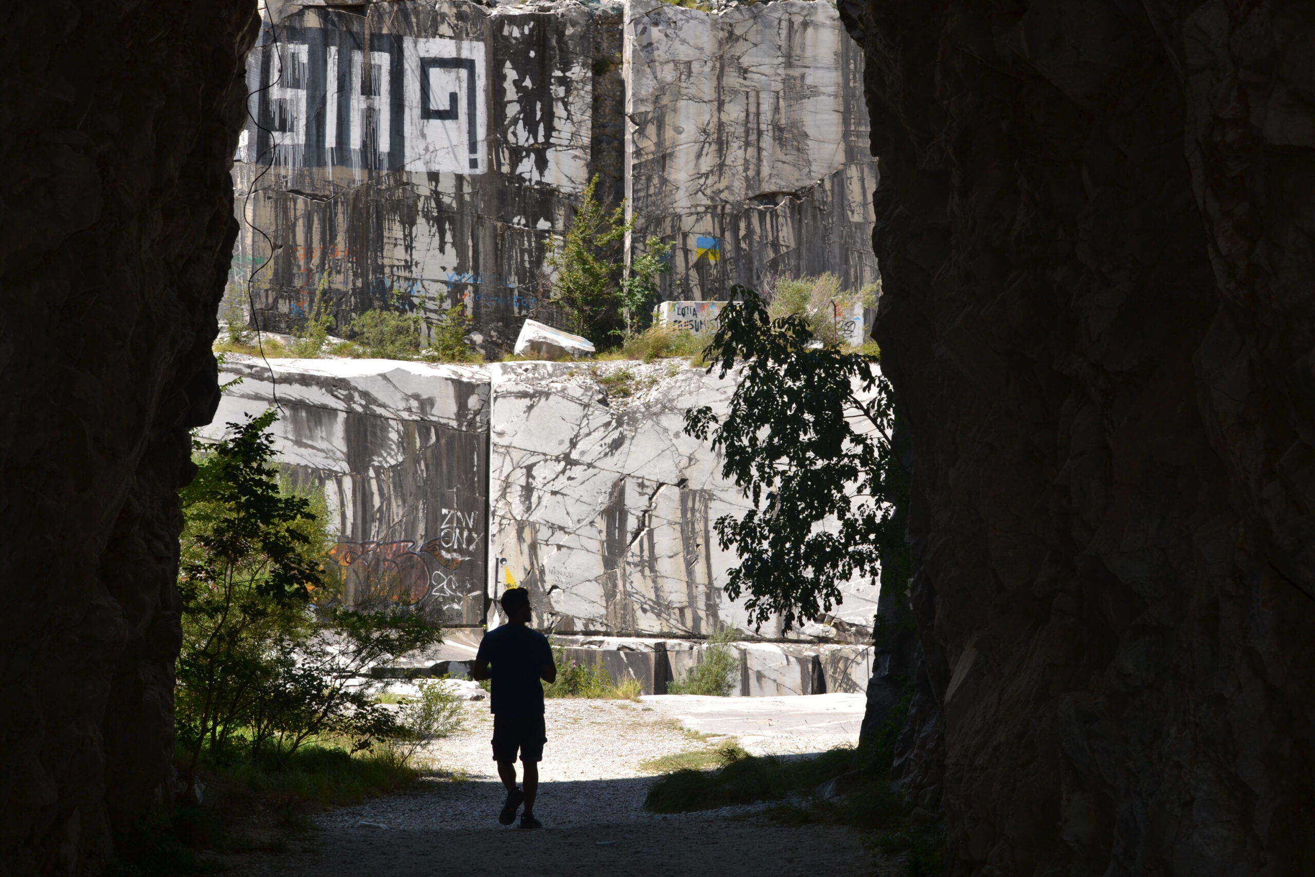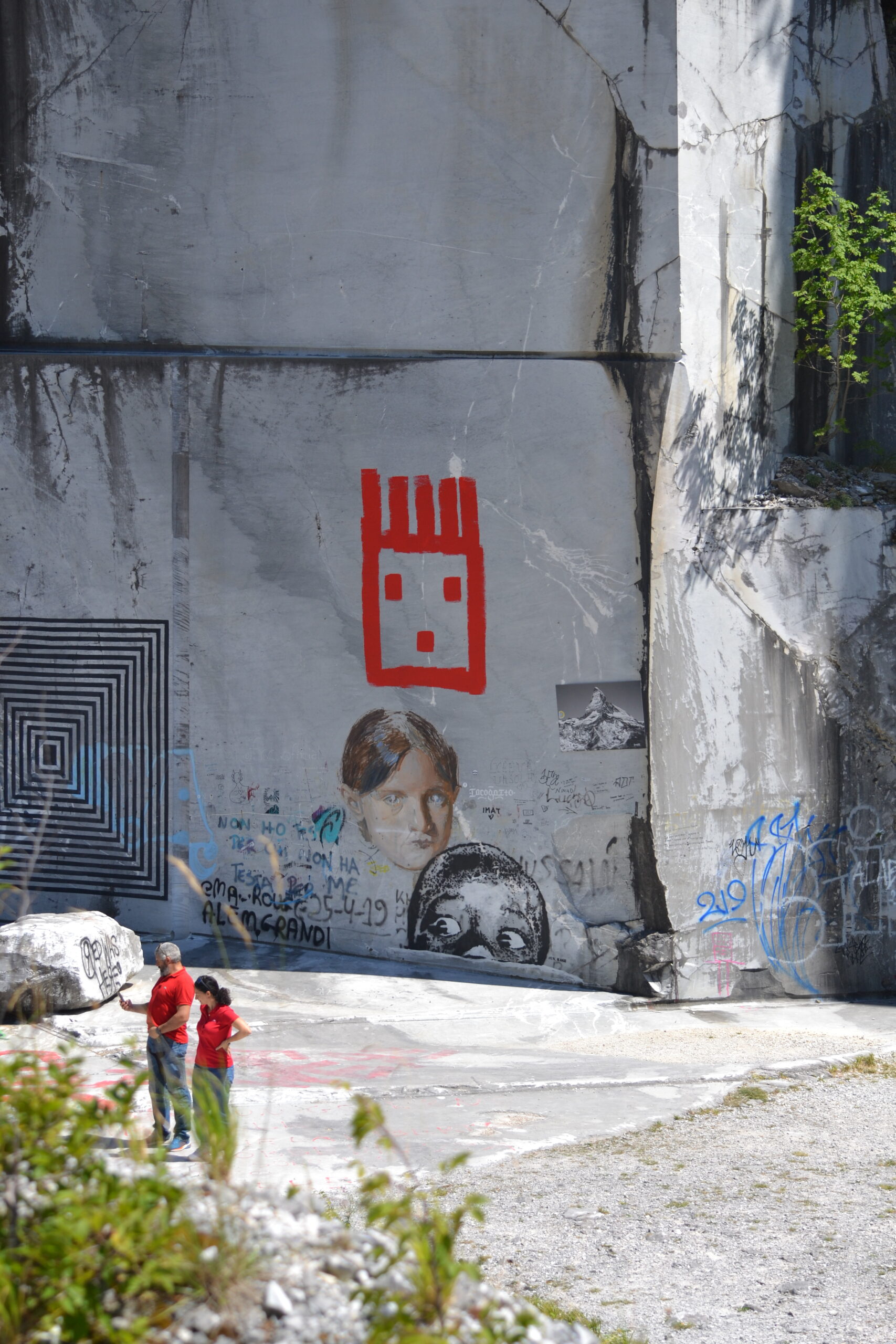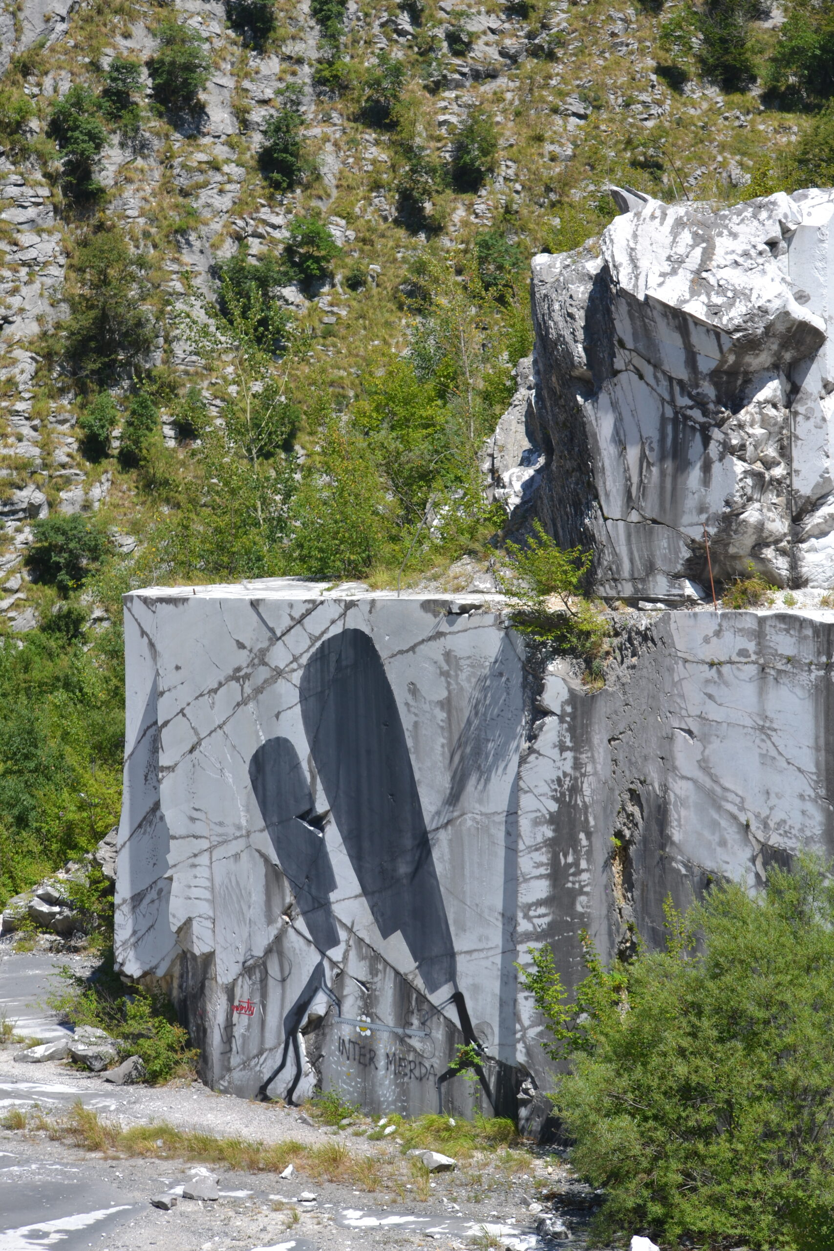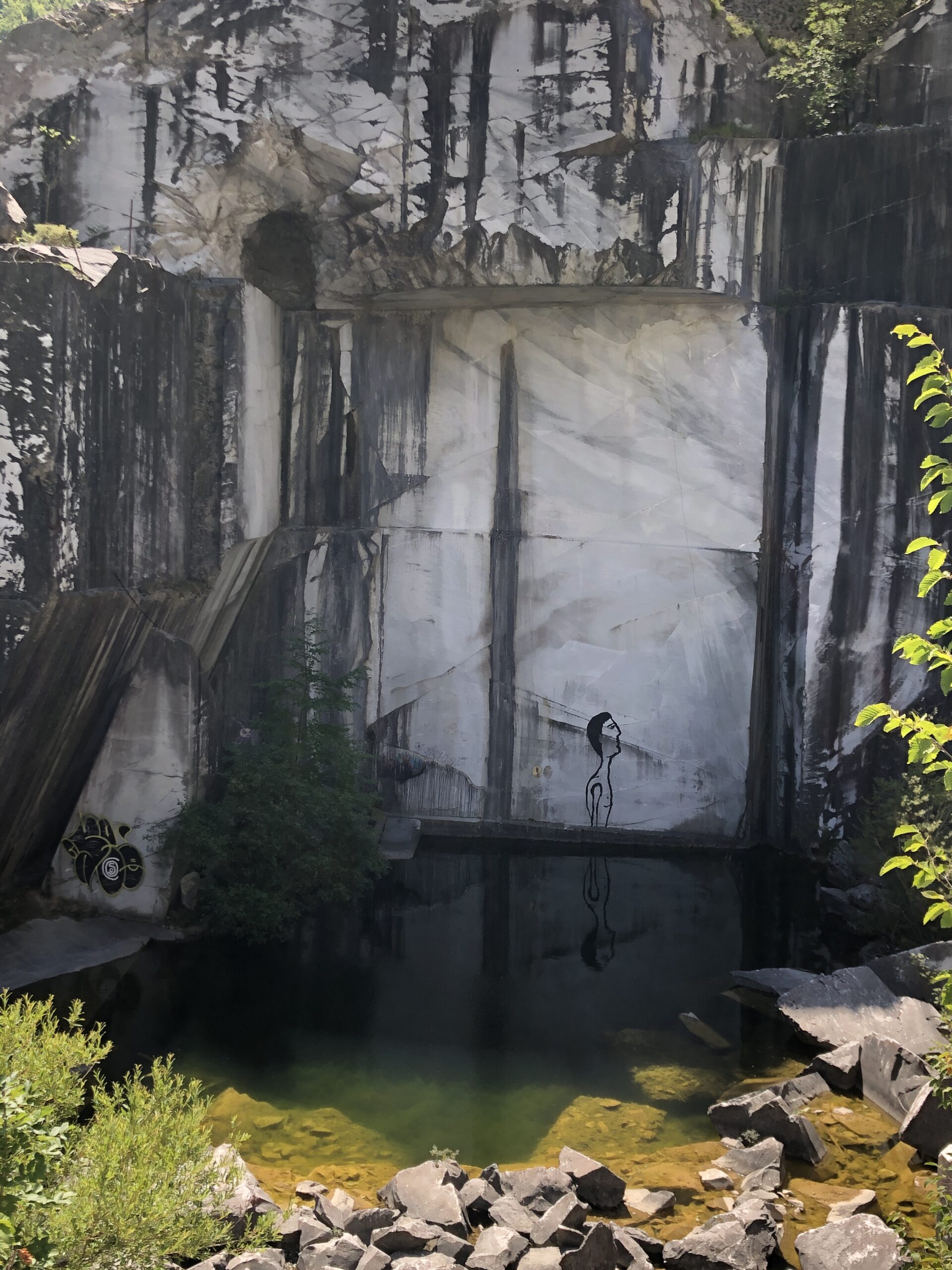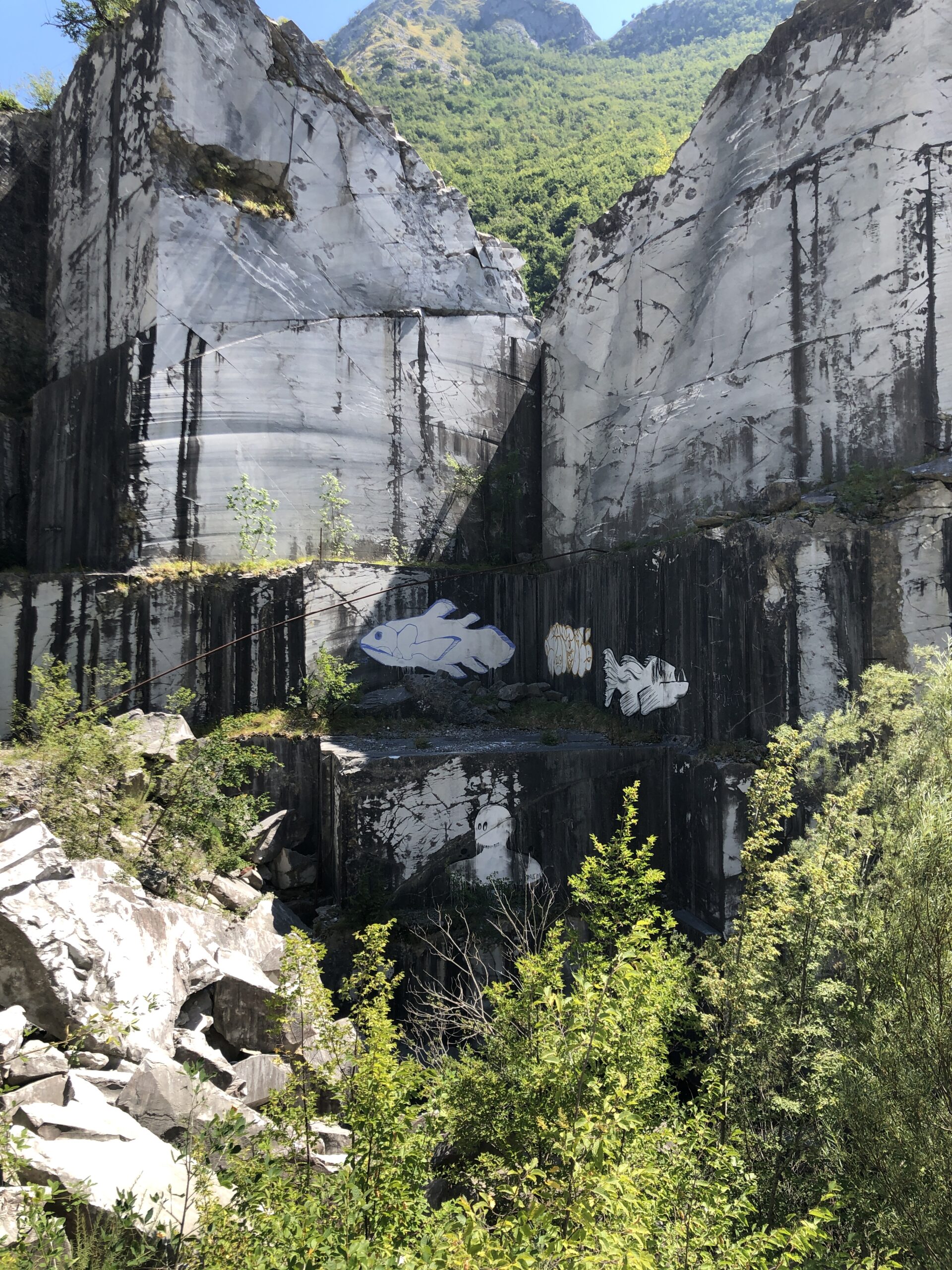 Avendo già visitato altre cave, mi aspettavo un ambiente più geometrico e freddo. Gli arbusti verdi che stanno rivendicando il loro spazio hanno stemperato quell’atmosfera austera e nuda che ci si aspetta da una zona di scavi del marmo. Resta il silenzio a dominarla e l’incertezza della vita in un luogo che appare morto. I murales, che pare siano la particolarità di questo luogo, non sono molti e non sono nemmeno delle grandi opere lo ammetto. É l’insieme che crea il contesto, il sole rende la pietra di risulta incandescente, ma il marmo lisciato dagli ultimi tagli è invece fresco al tatto, nonostante i raggi s’infrangano su di esso.