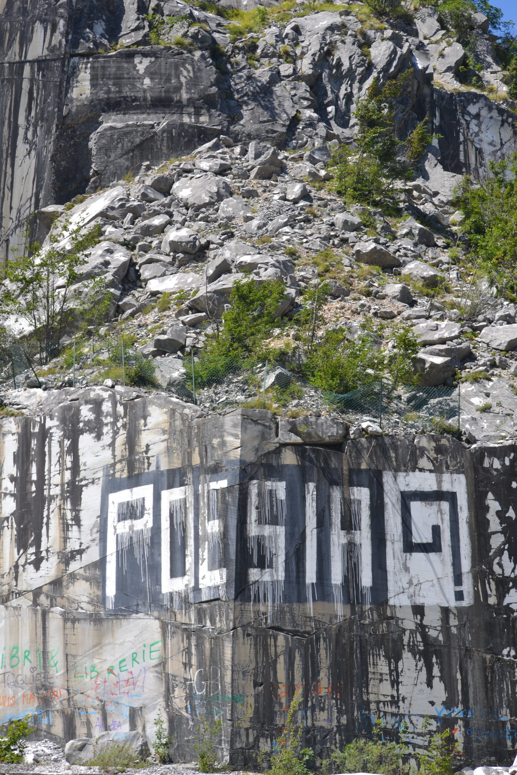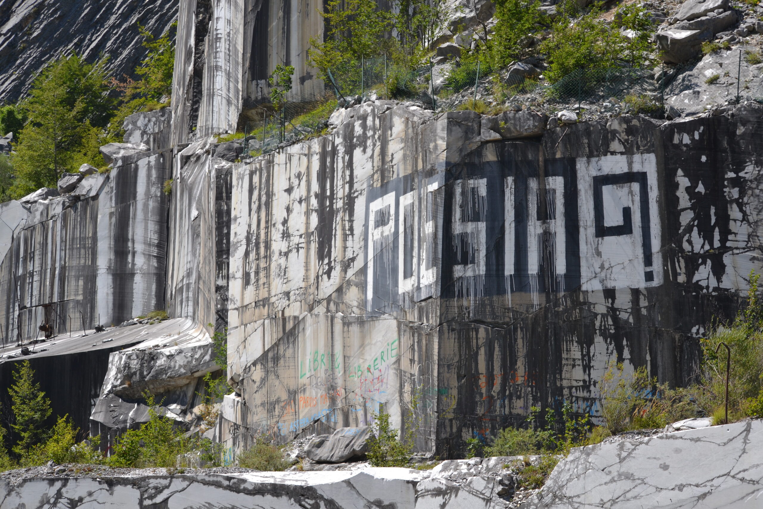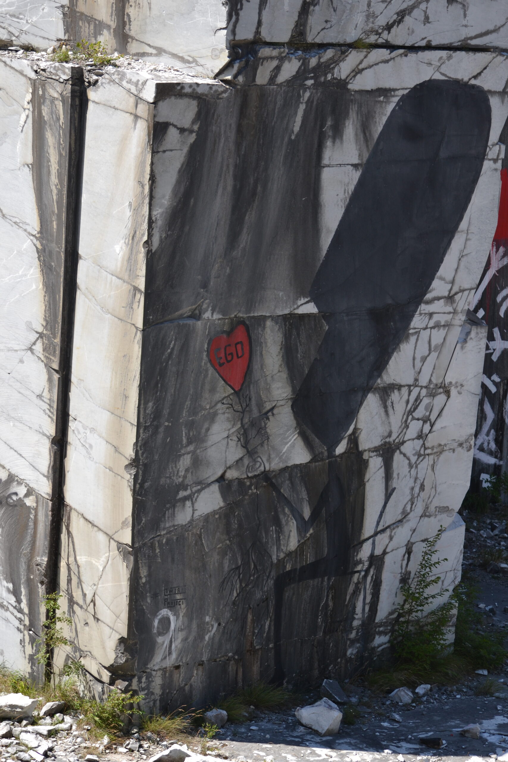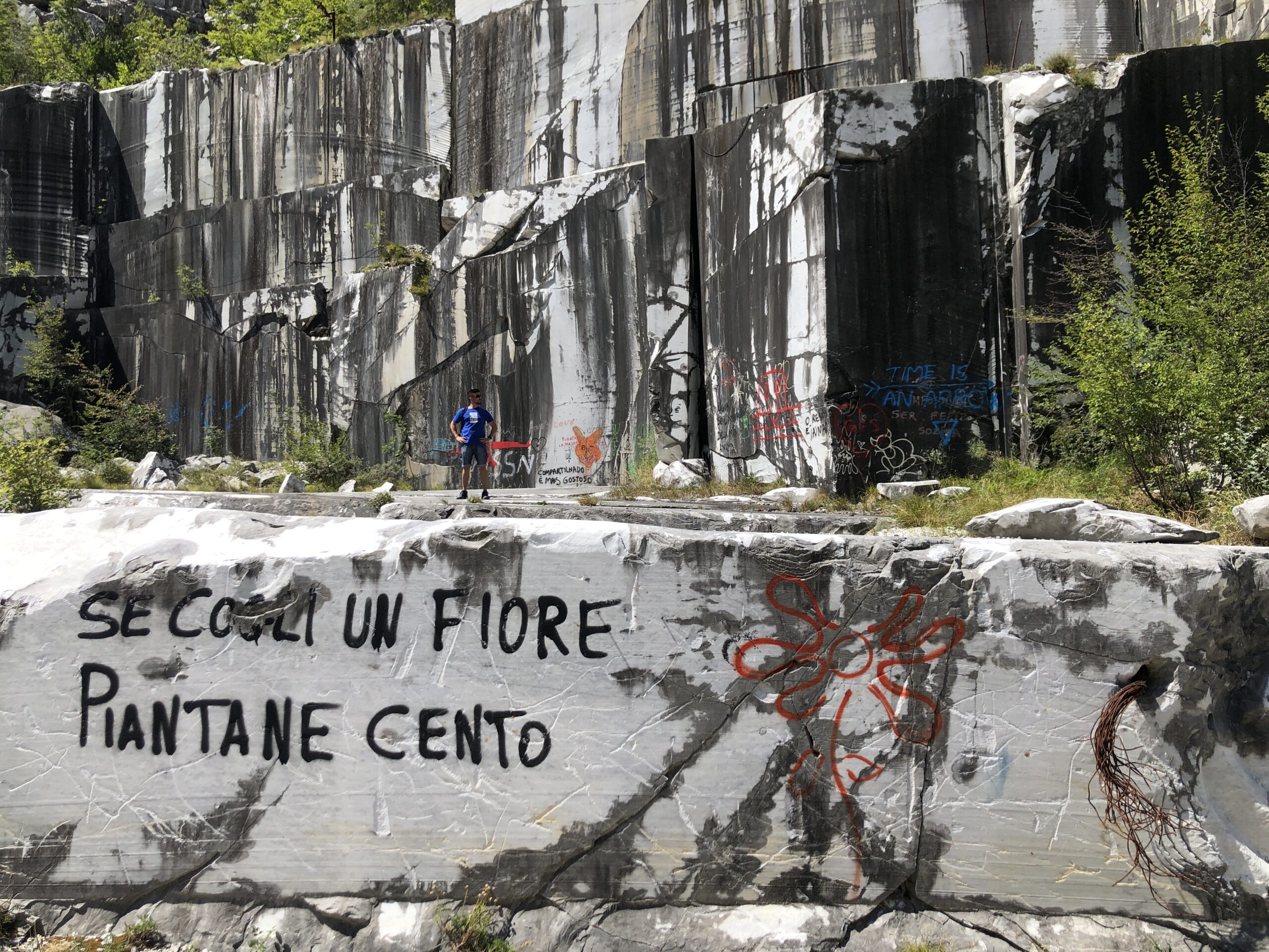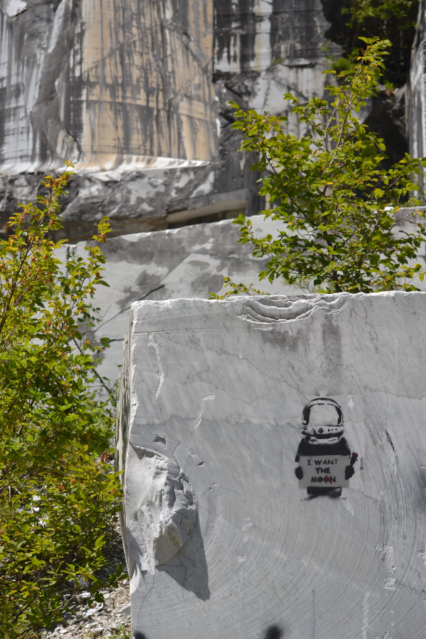 Avendo già visitato altre cave, mi aspettavo un ambiente più geometrico e freddo. Gli arbusti verdi che stanno rivendicando il loro spazio hanno stemperato quell’atmosfera austera e nuda che ci si aspetta da una zona di scavi del marmo. Resta il silenzio a dominarla e l’incertezza della vita in un luogo che appare morto. I murales, che pare siano la particolarità di questo luogo, non sono molti e non sono nemmeno delle grandi opere lo ammetto. É l’insieme che crea il contesto, il sole rende la pietra di risulta incandescente, ma il marmo lisciato dagli ultimi tagli è invece fresco al tatto, nonostante i raggi s’infrangano su di esso.