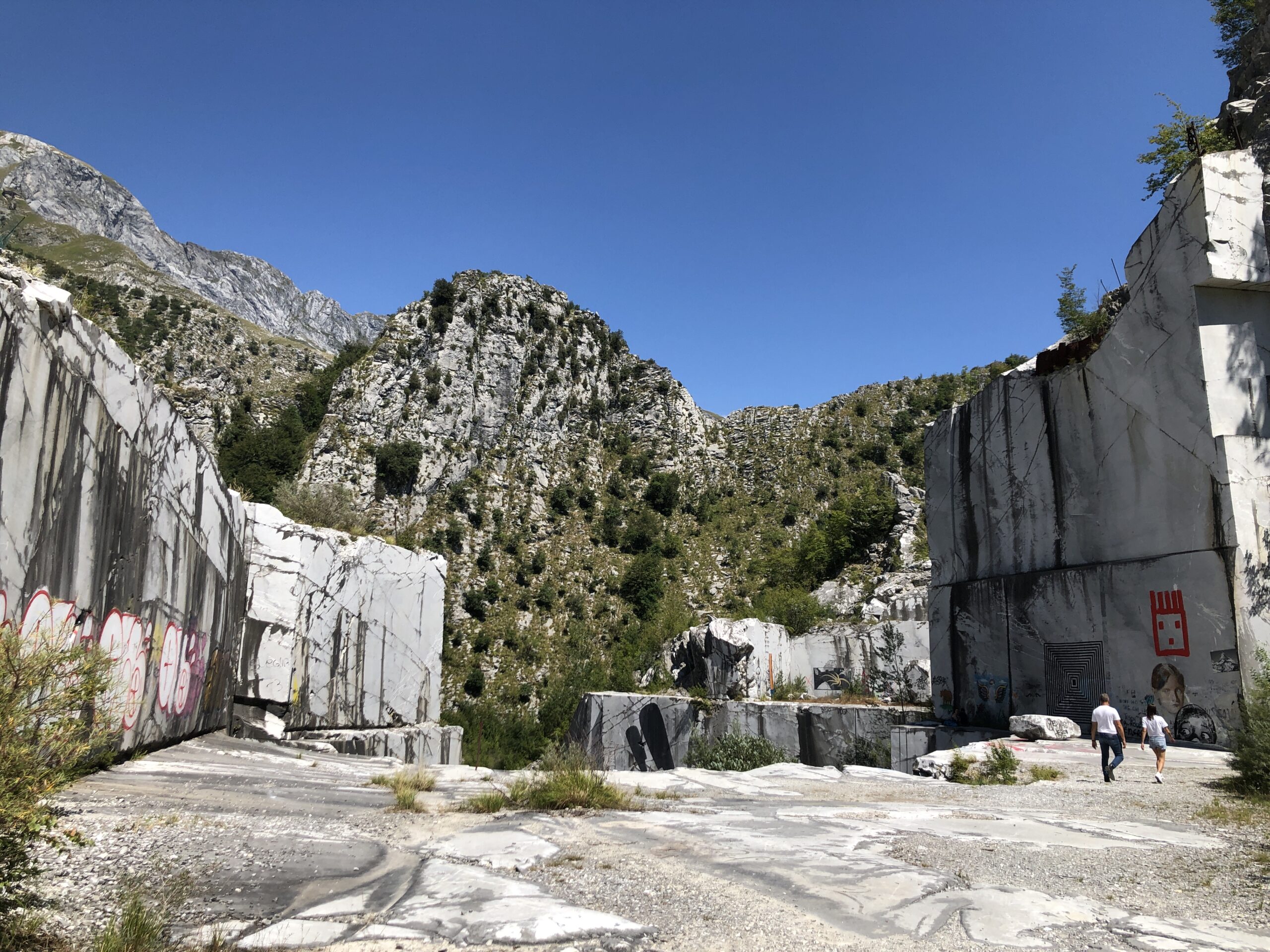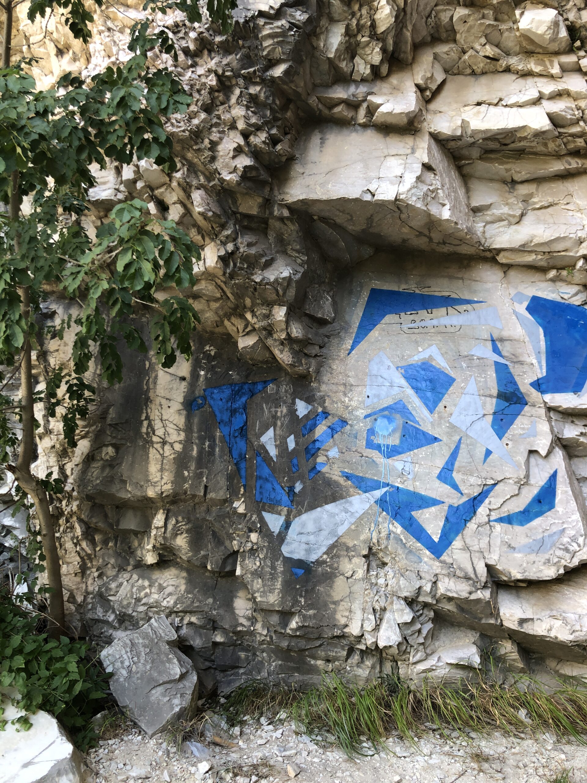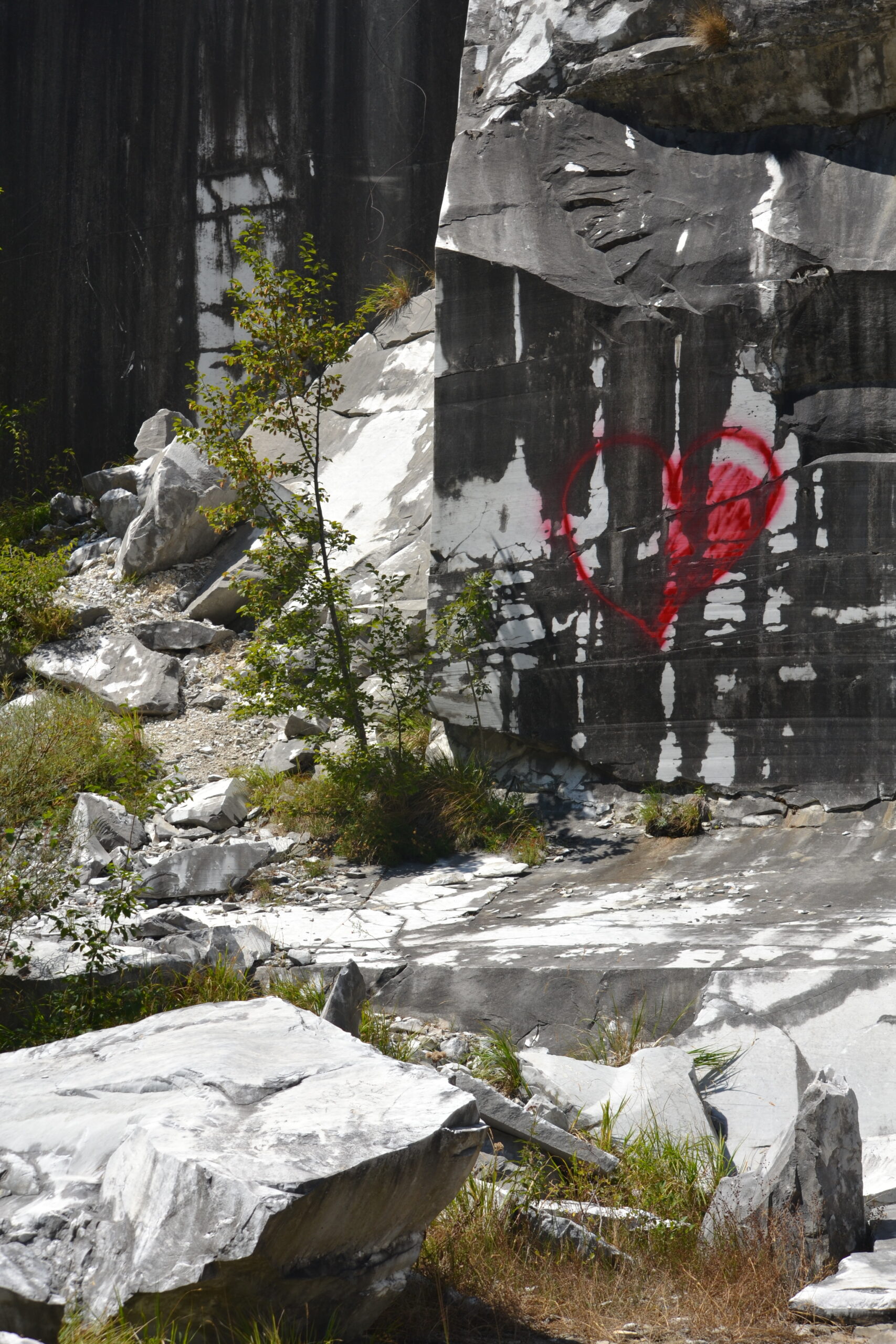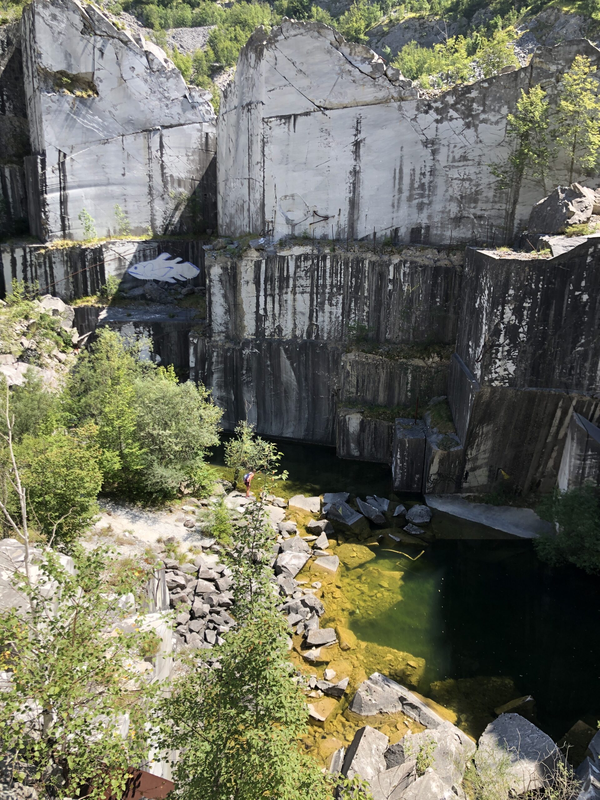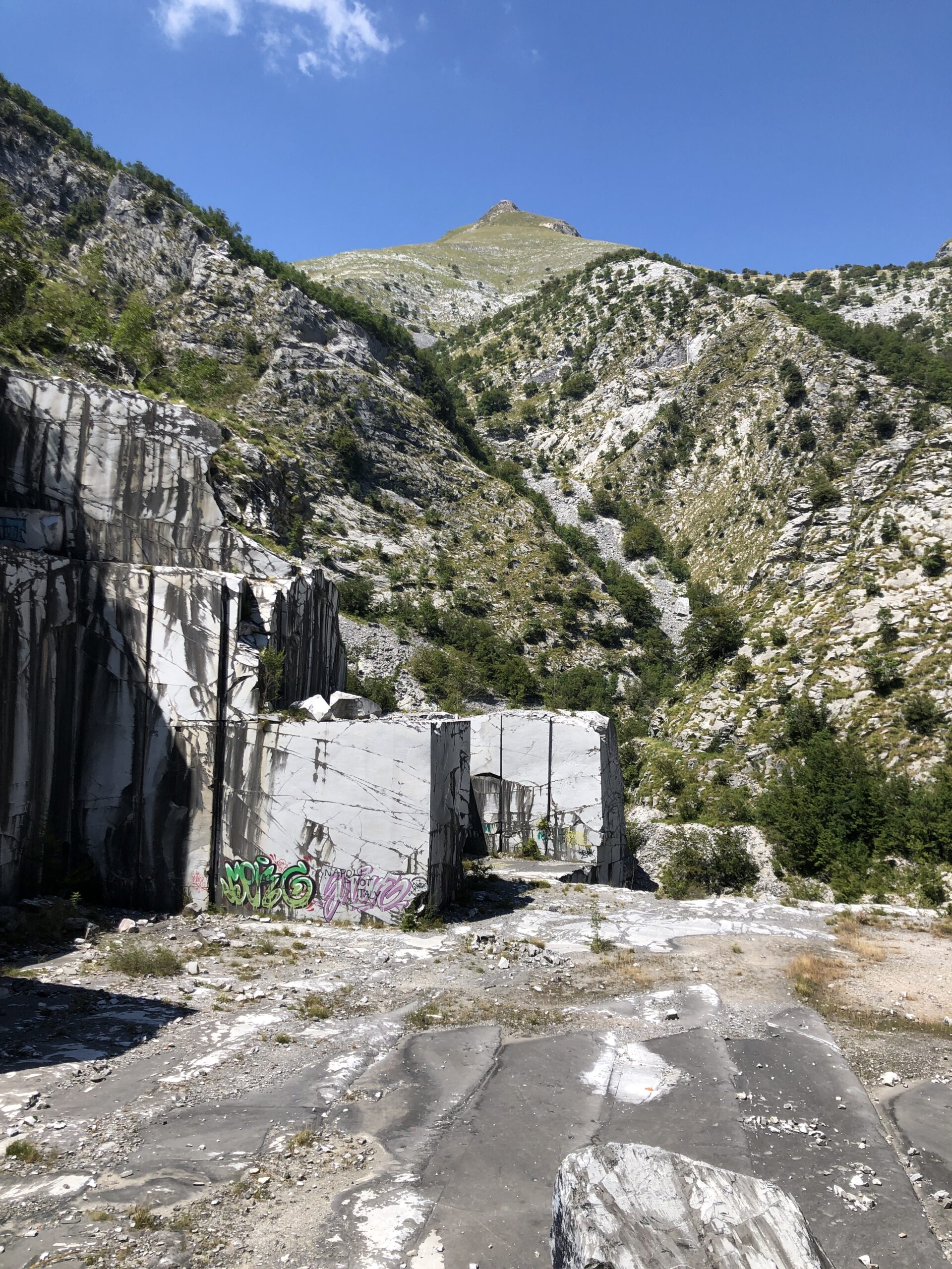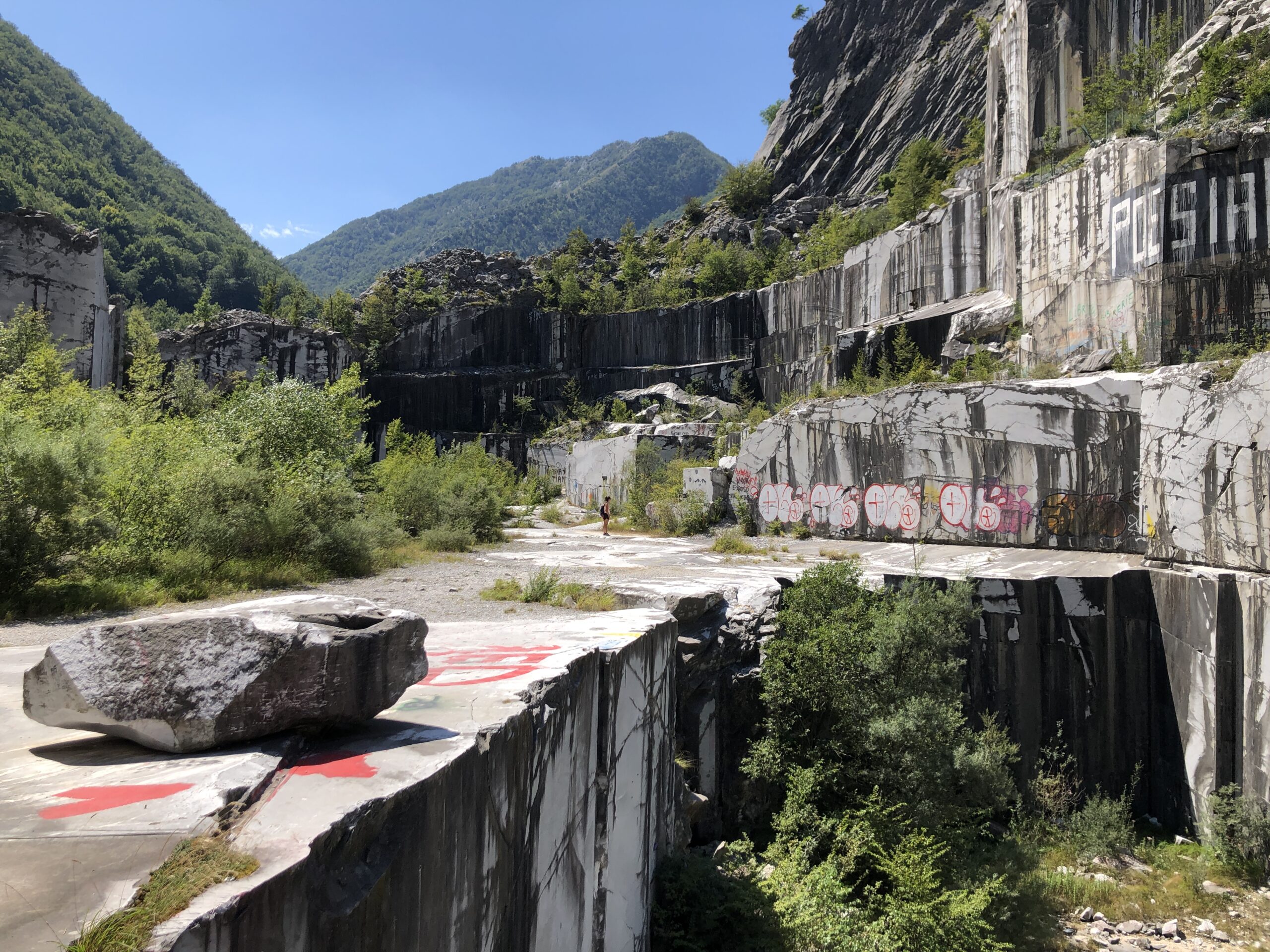 Avendo già visitato altre cave, mi aspettavo un ambiente più geometrico e freddo. Gli arbusti verdi che stanno rivendicando il loro spazio hanno stemperato quell’atmosfera austera e nuda che ci si aspetta da una zona di scavi del marmo. Resta il silenzio a dominarla e l’incertezza della vita in un luogo che appare morto. I murales, che pare siano la particolarità di questo luogo, non sono molti e non sono nemmeno delle grandi opere lo ammetto. É l’insieme che crea il contesto, il sole rende la pietra di risulta incandescente, ma il marmo lisciato dagli ultimi tagli è invece fresco al tatto, nonostante i raggi s’infrangano su di esso.