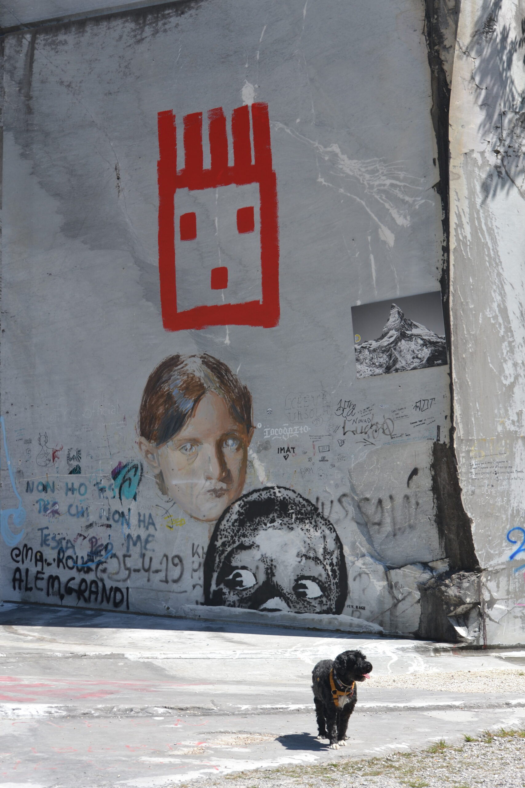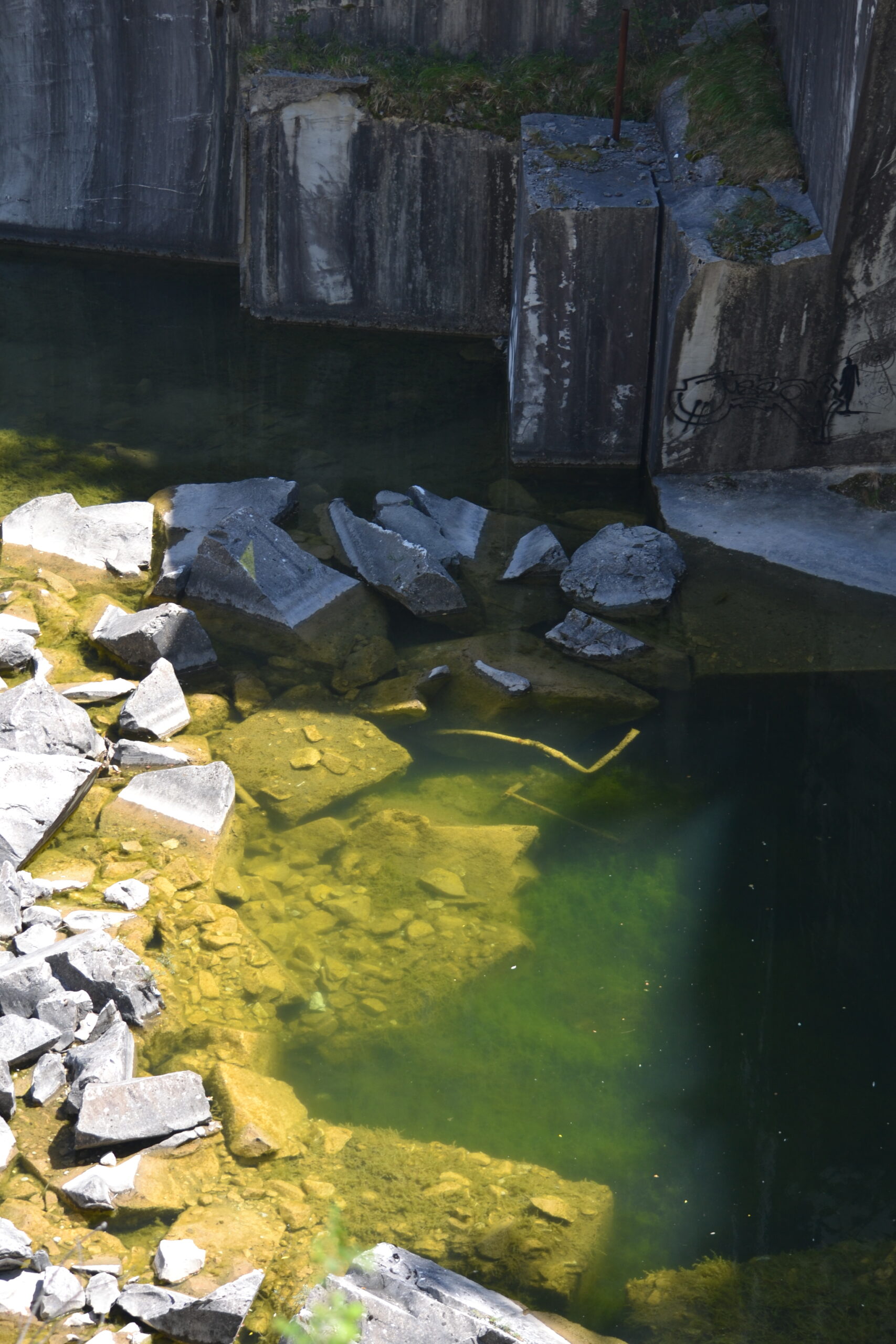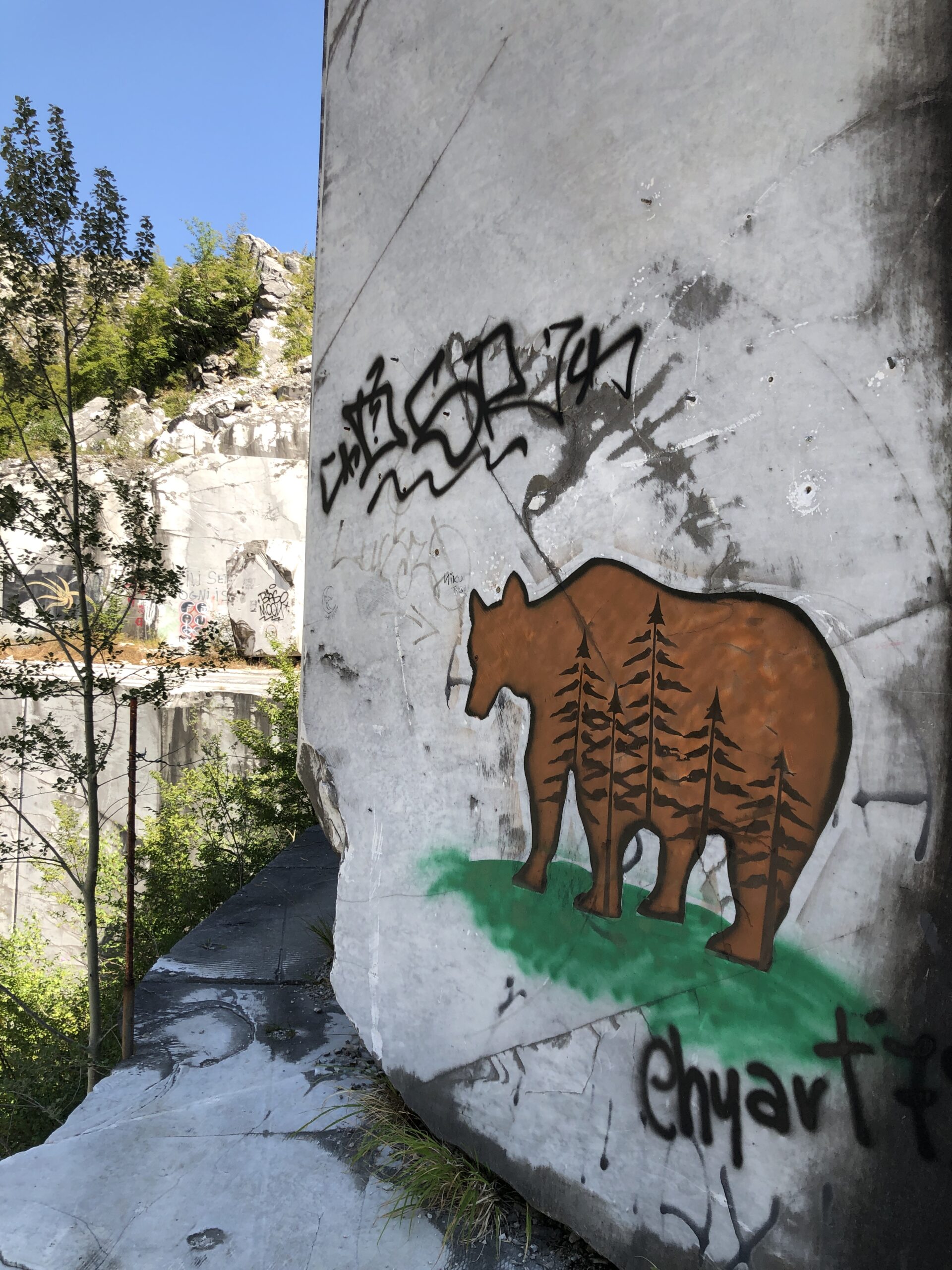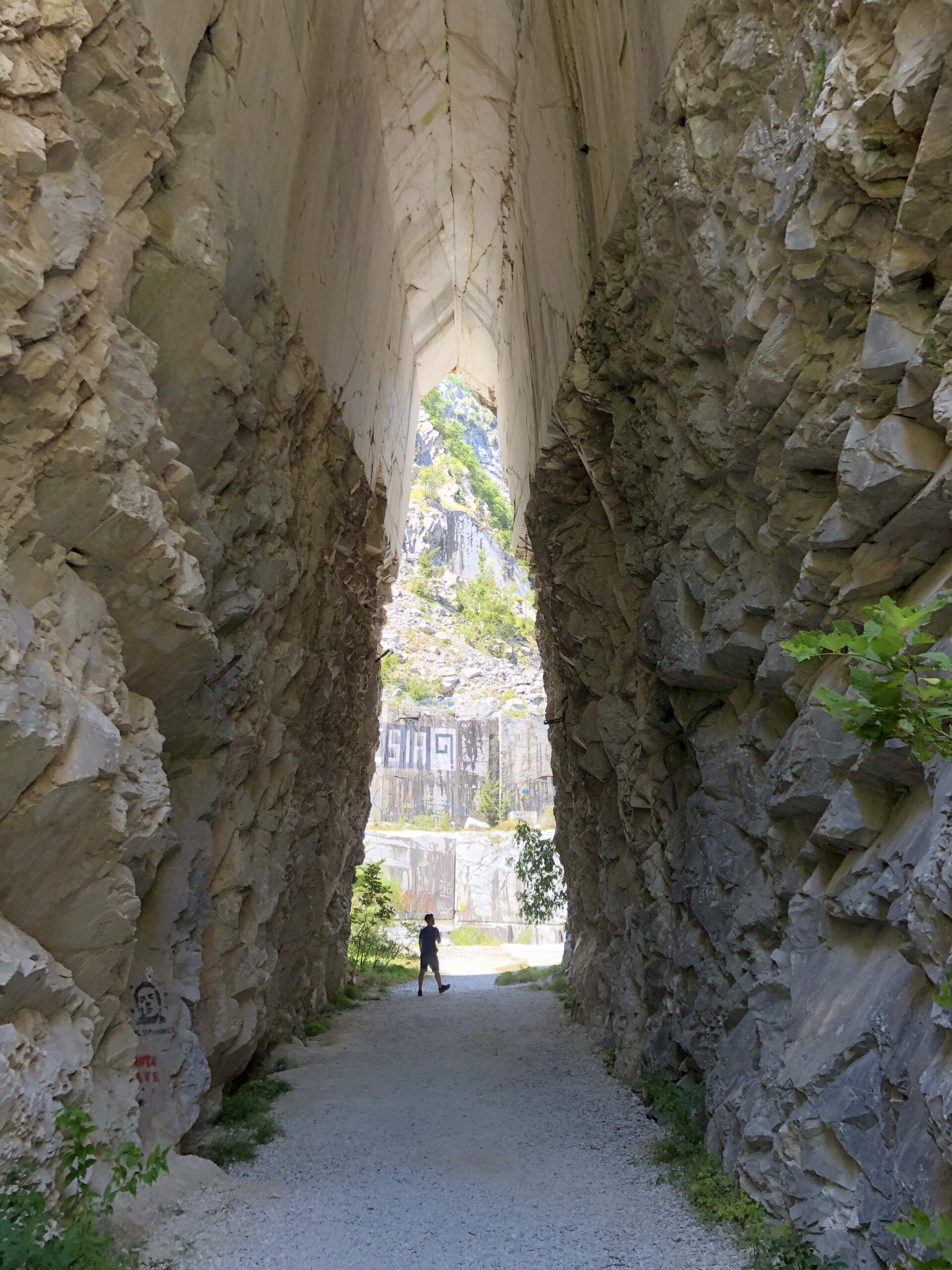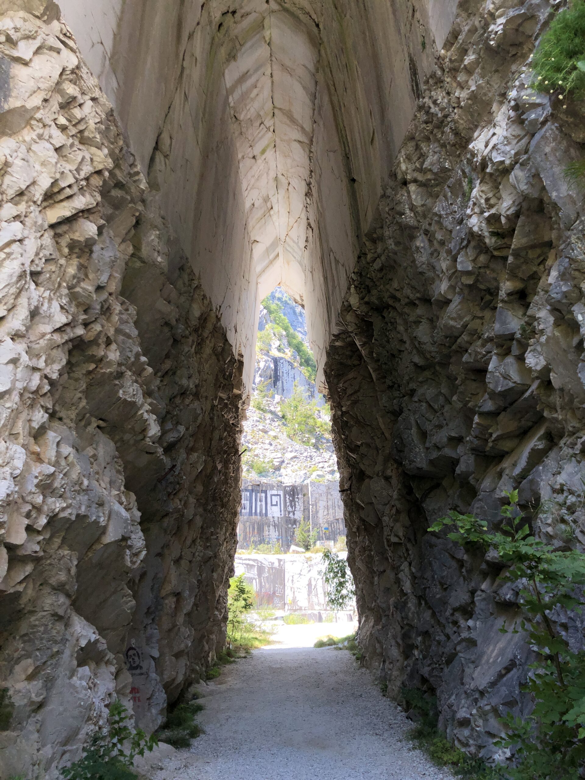 Avendo già visitato altre cave, mi aspettavo un ambiente più geometrico e freddo. Gli arbusti verdi che stanno rivendicando il loro spazio hanno stemperato quell’atmosfera austera e nuda che ci si aspetta da una zona di scavi del marmo. Resta il silenzio a dominarla e l’incertezza della vita in un luogo che appare morto. I murales, che pare siano la particolarità di questo luogo, non sono molti e non sono nemmeno delle grandi opere lo ammetto. É l’insieme che crea il contesto, il sole rende la pietra di risulta incandescente, ma il marmo lisciato dagli ultimi tagli è invece fresco al tatto, nonostante i raggi s’infrangano su di esso.