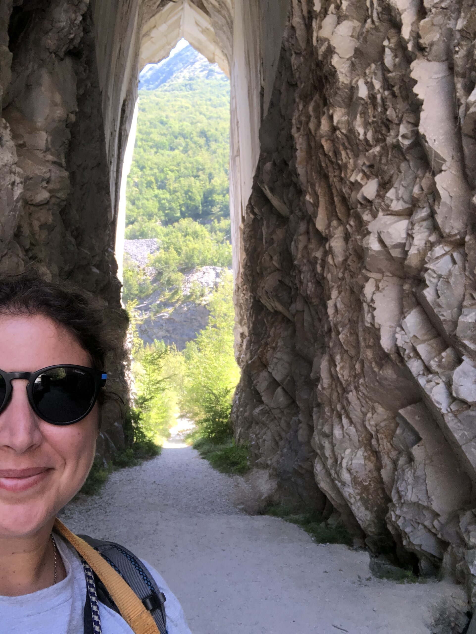 Guardo un’ultima volta in alto, prima di entrare nel lungo corridoio scavato, manca qualche lettera al grande pannello arrugginito ma ciò, conferisce un’aria ancora più decadente e misteriosa al luogo. Il passaggio che permette l’accesso all’area degli scavi ha una forma incredibile. Sembra la chiglia di una nave rovesciata, una nave immaginaria molto stretta e molto lunga, un po’ come le sottili gambe degli elefanti di Dalí.