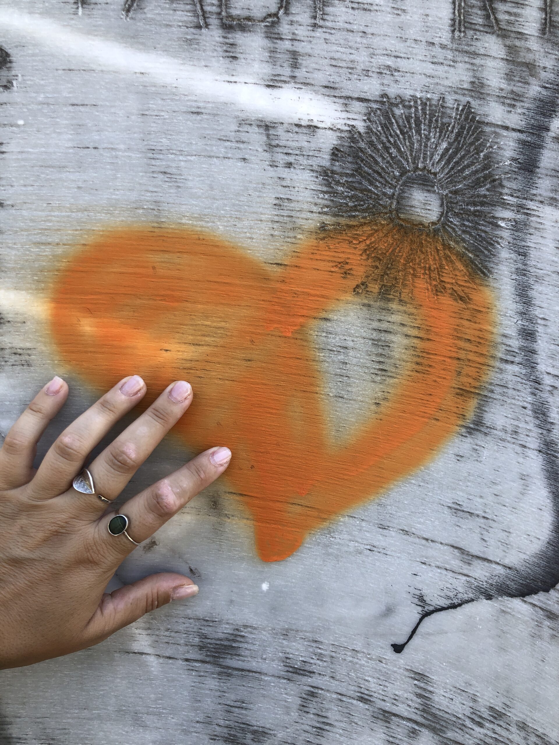 “Sì, vedi forse c’era qualcosa qui sopra tipo un cerchio o delle lettere ma è sporca la parete, non è rimasto molto.”