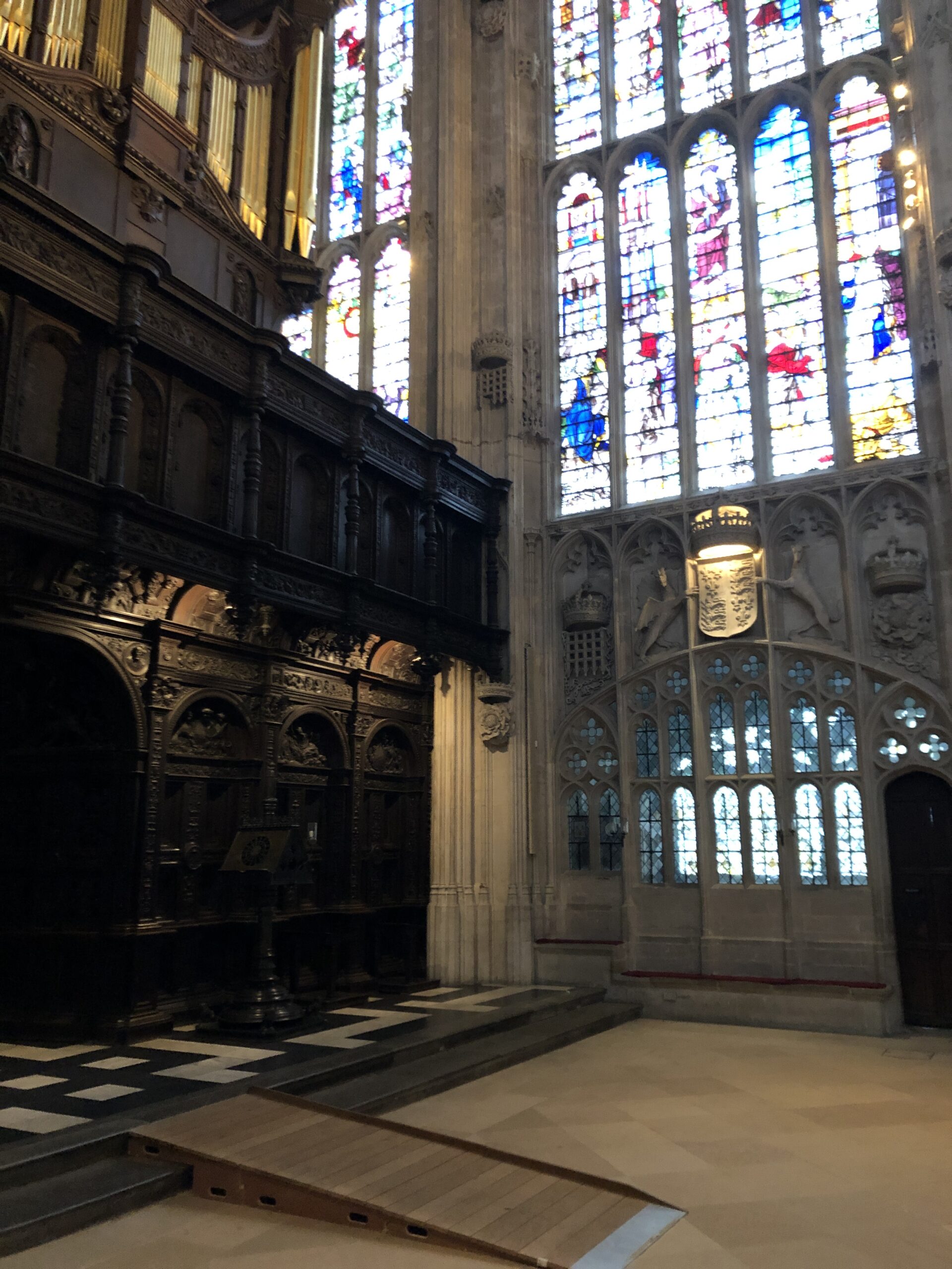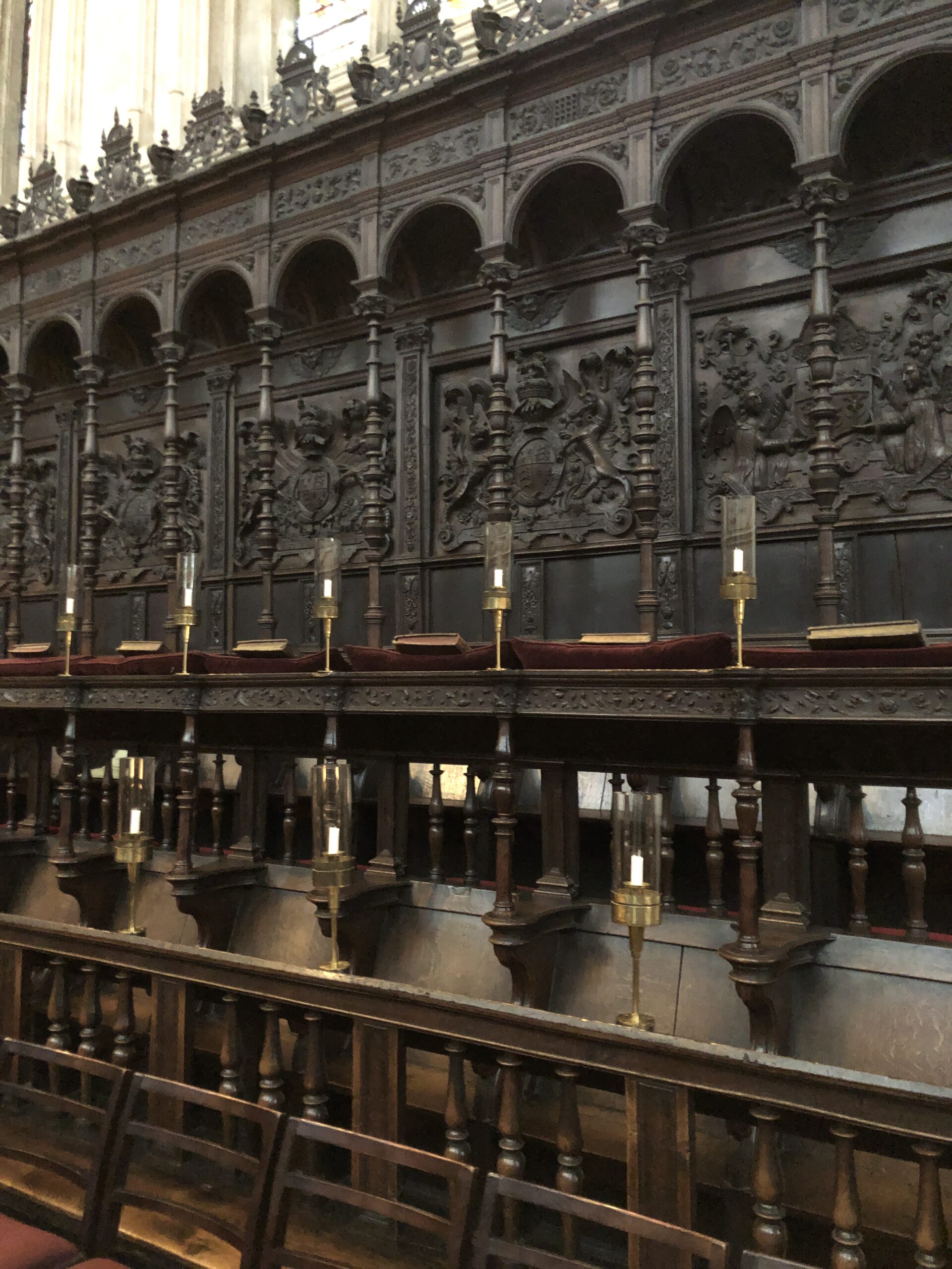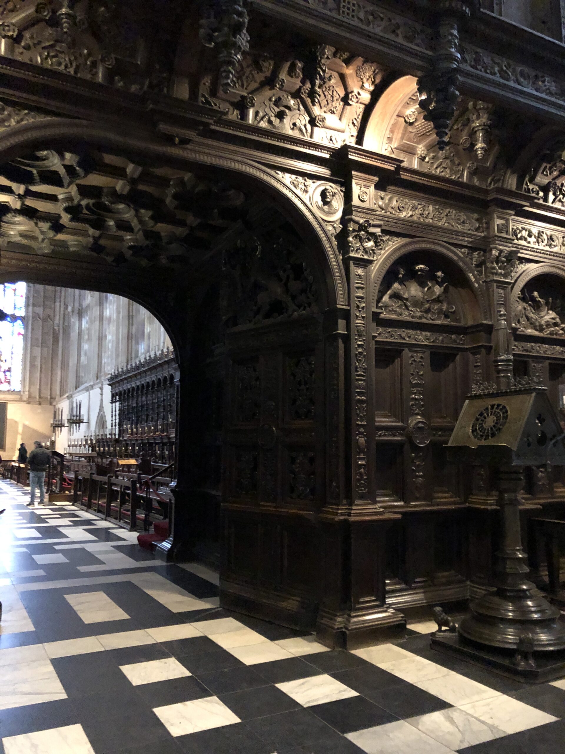 A metà navata si trova l’organo sorretto da una struttura in legno completamente adorna di intarsi e, al di là di essa, un enorme coro, sempre il legno, che ospita studenti maschi e femmine che si esibiscono quasi ogni giorno durante la messa.