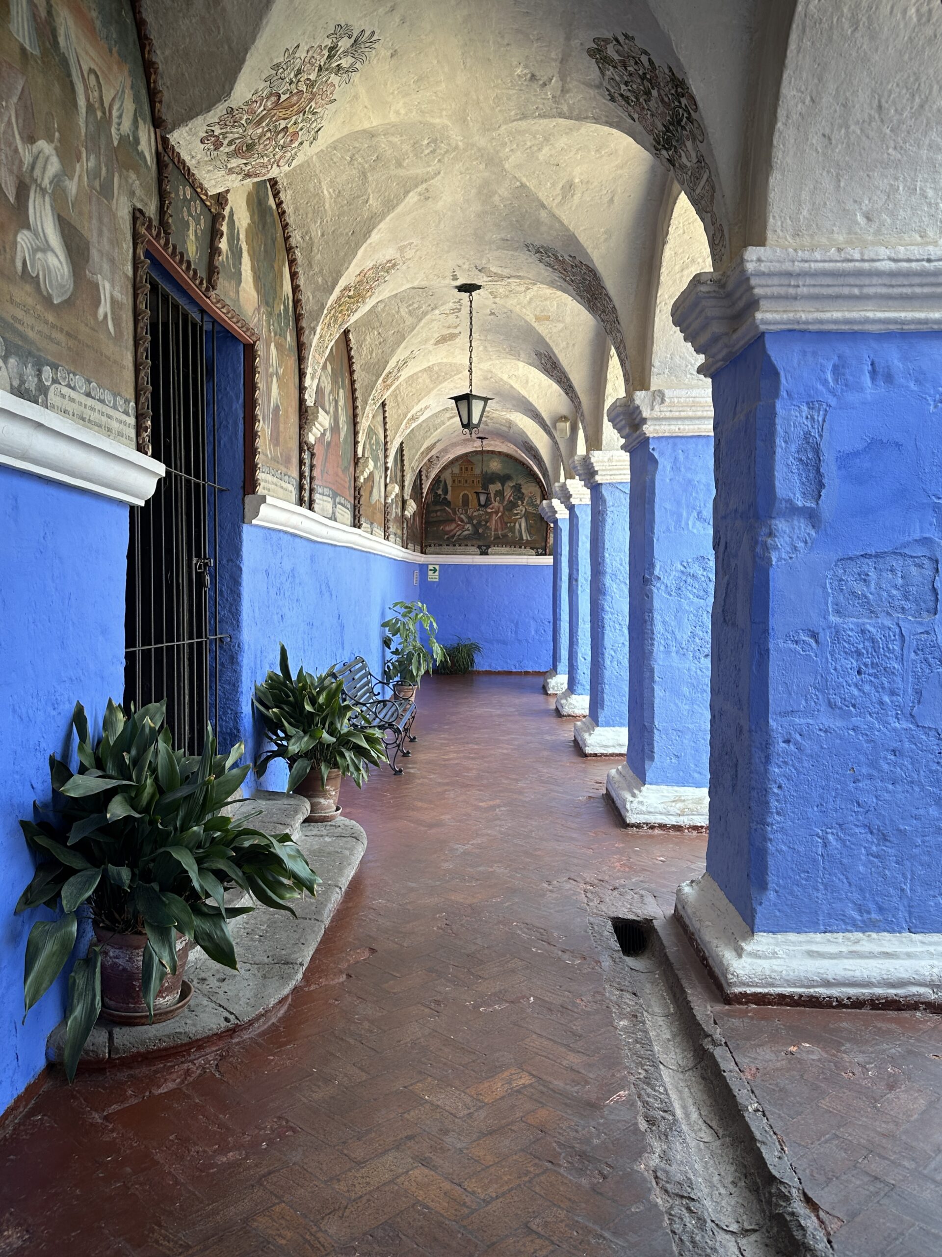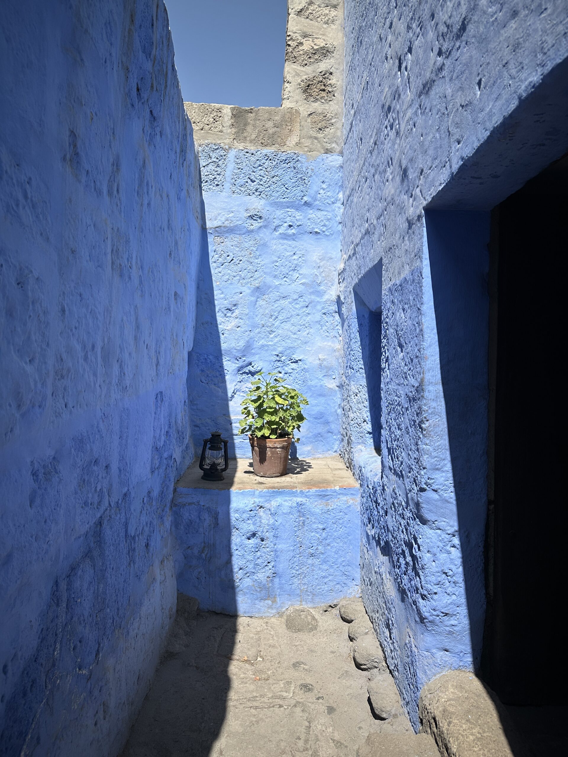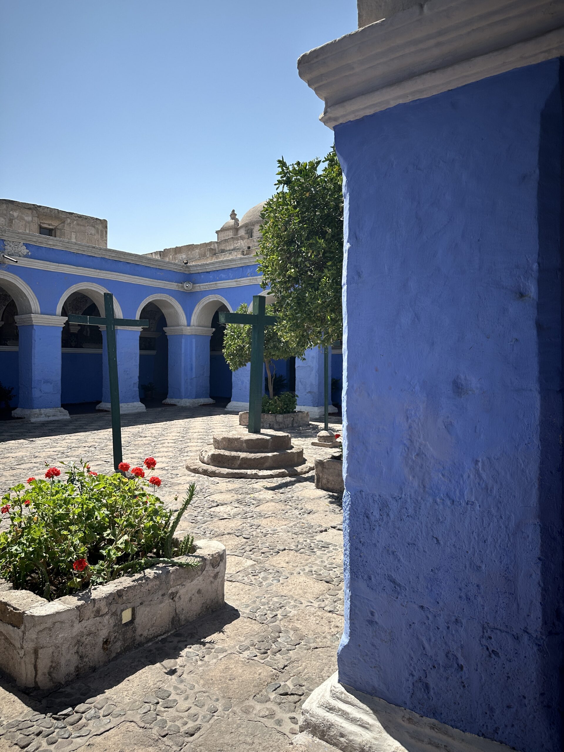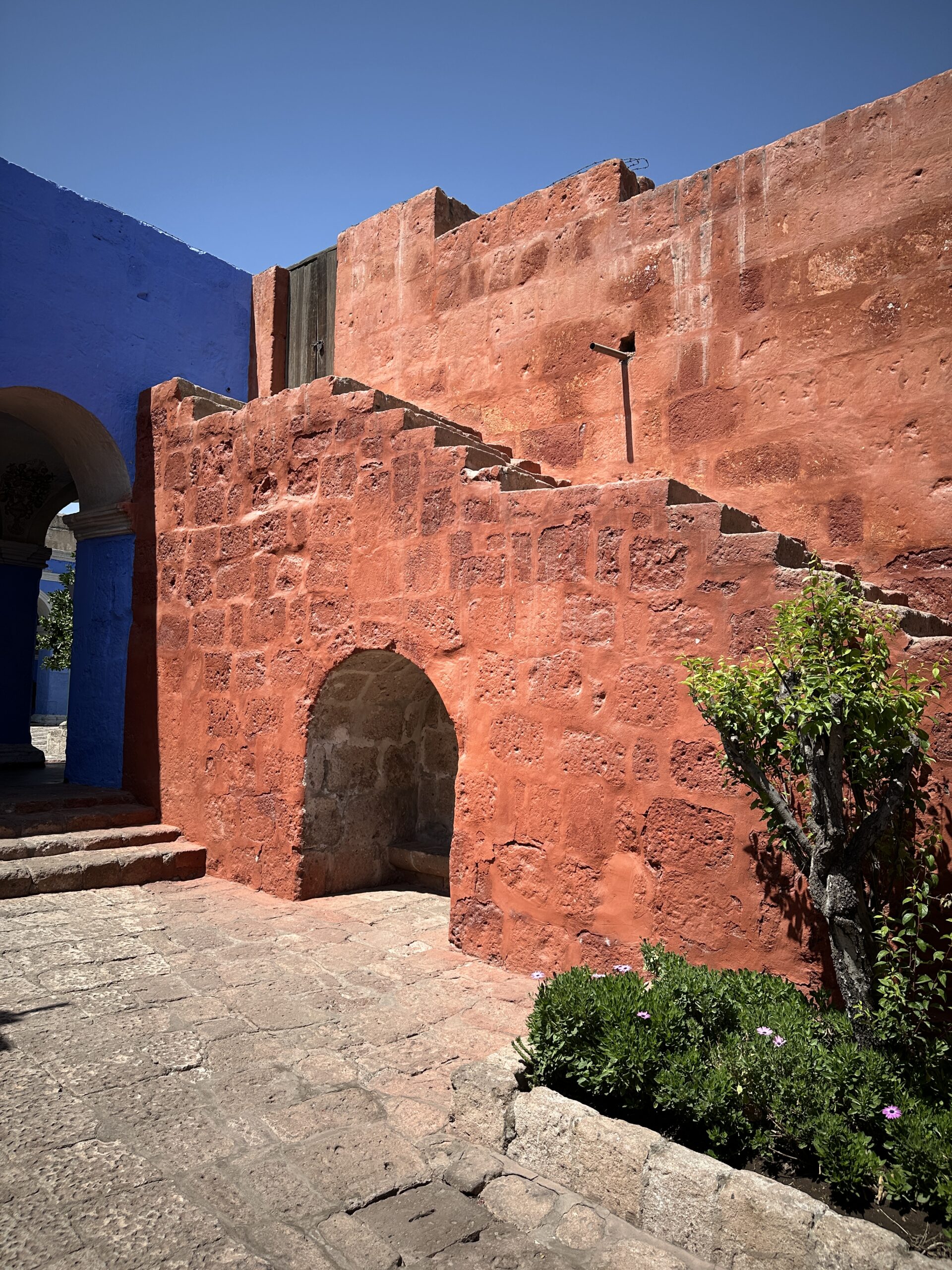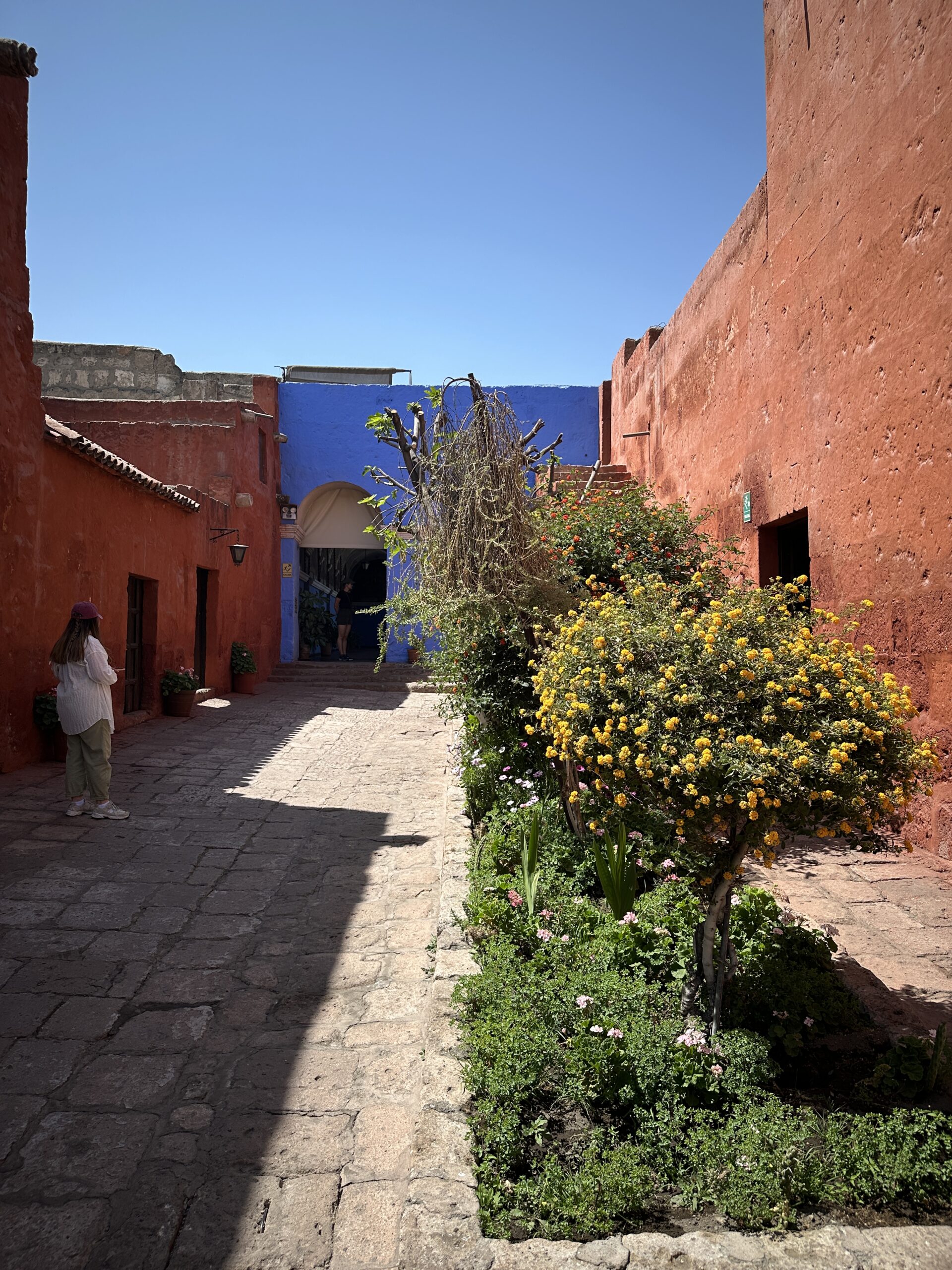 Le mura alte del perimetro la preservano da incursioni esterne e da occhi indiscreti. È pietra sillar, di origine vulcanica, il suo candore si sposa perfettamente con l’architettura coloniale. Le strette strade interne, le facciate delle celle e le colonne dei porticati sono dipinte con un azzurro ed un rosso mattone molto decisi che si alternano creando ad ogni angolo degli scorci davvero deliziosi.