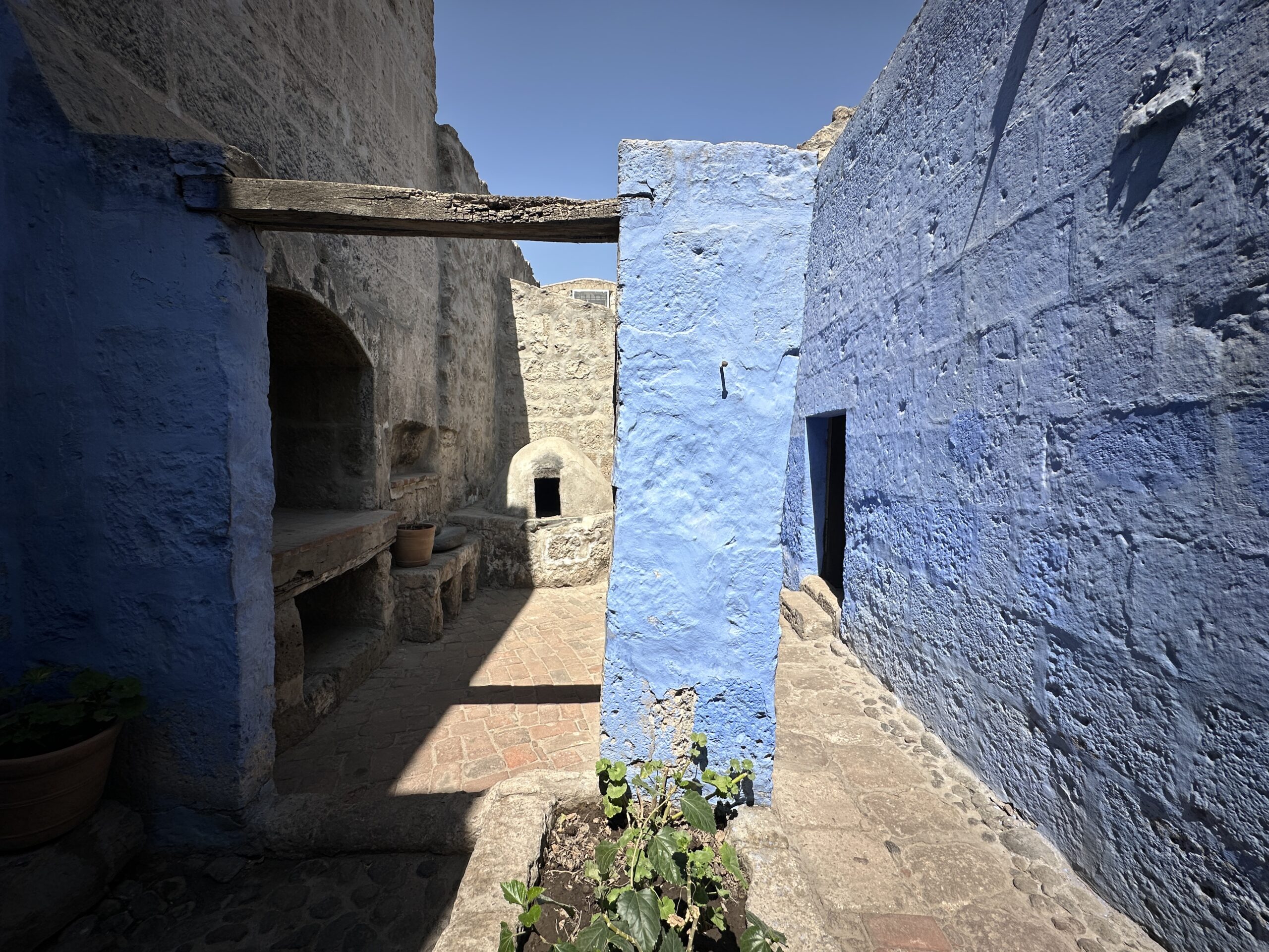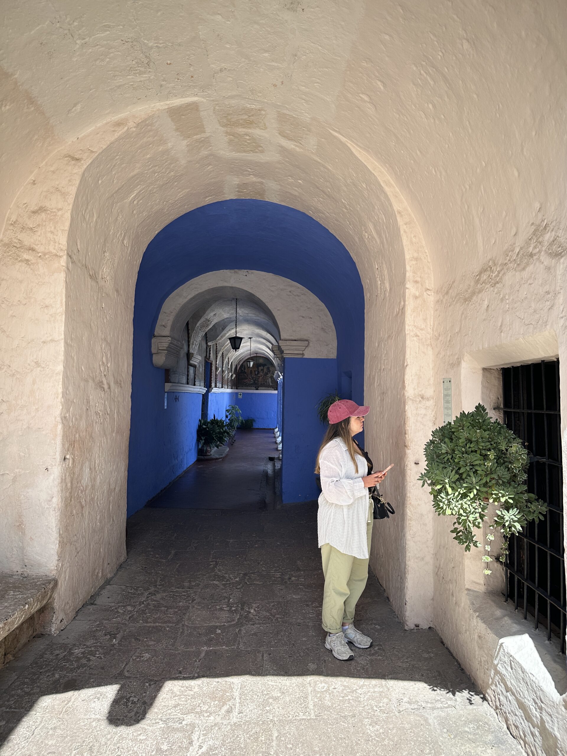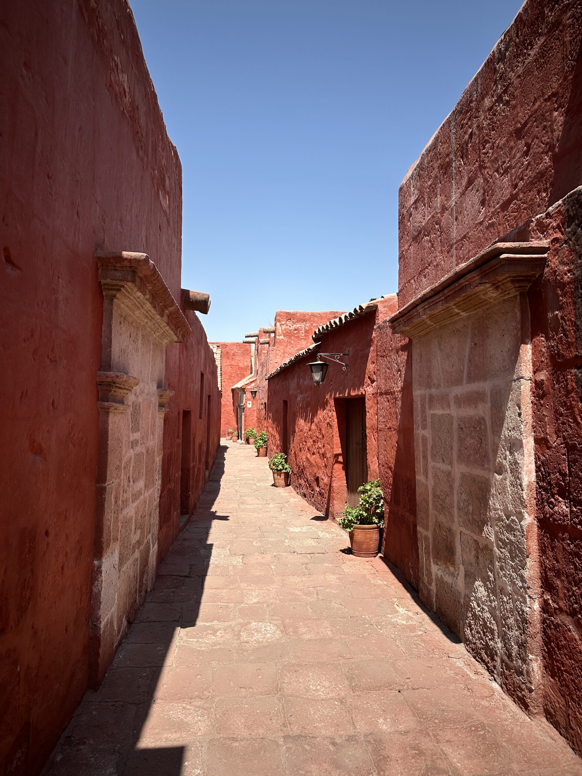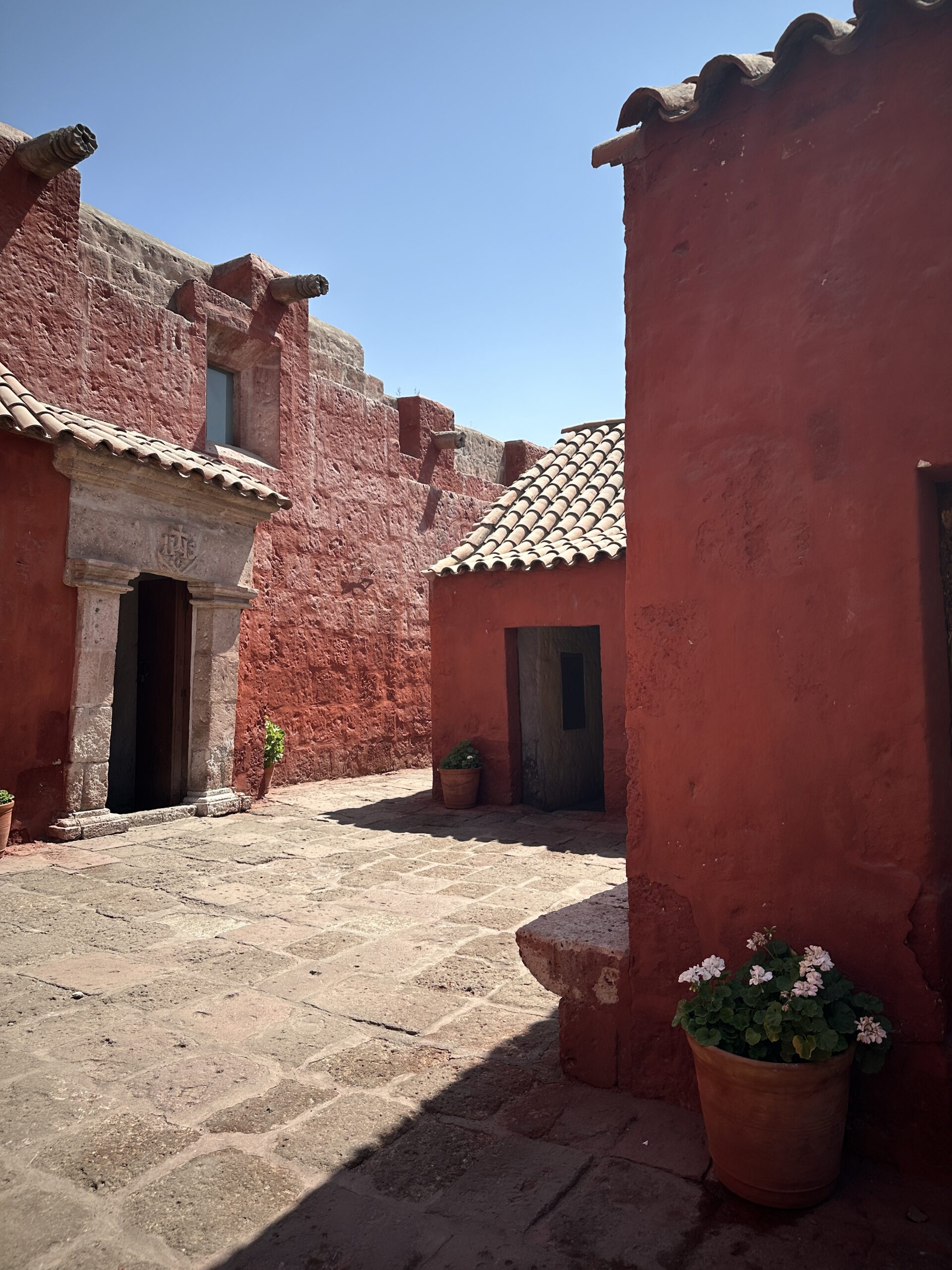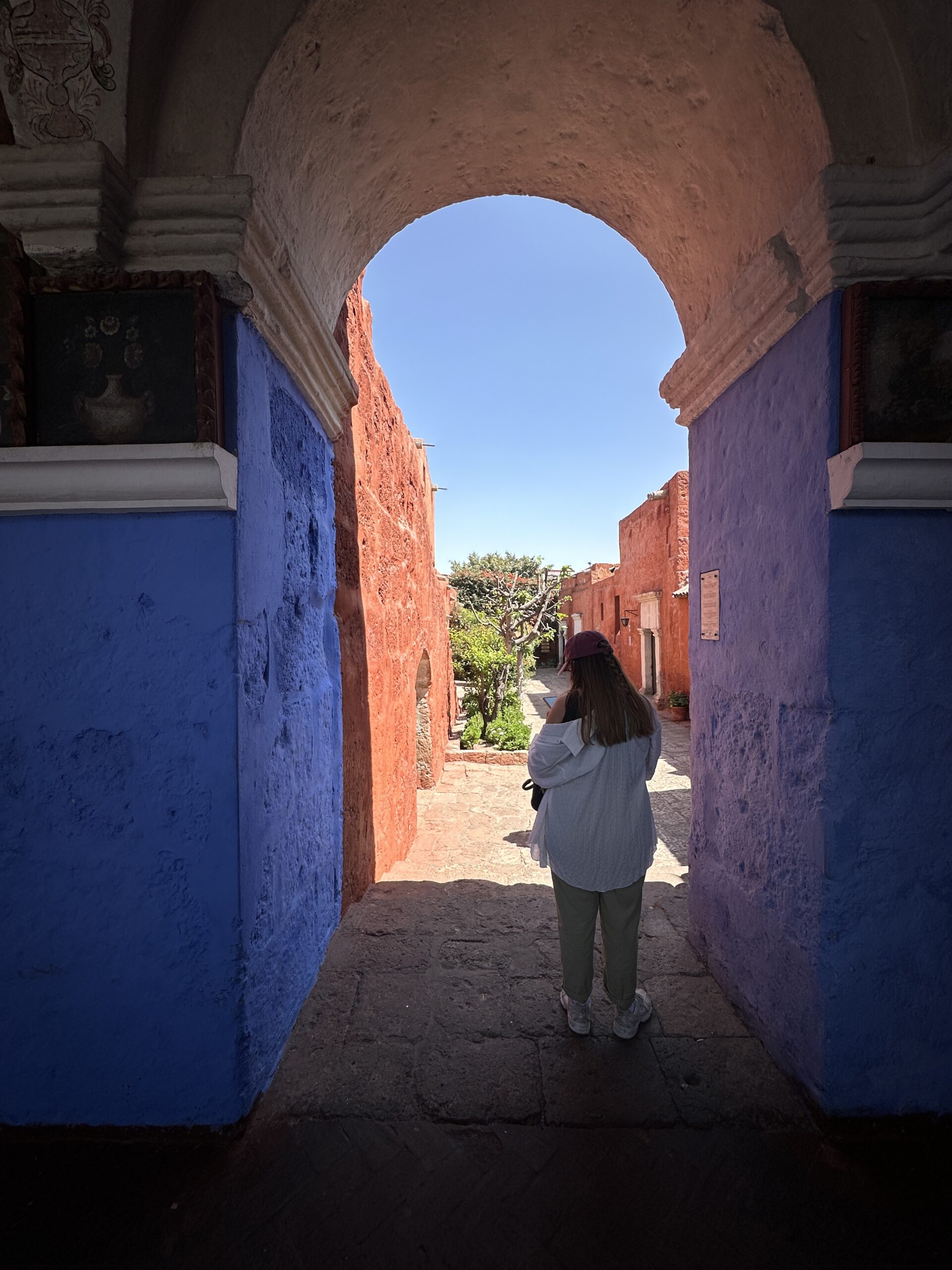 Le mura alte del perimetro la preservano da incursioni esterne e da occhi indiscreti. È pietra sillar, di origine vulcanica, il suo candore si sposa perfettamente con l’architettura coloniale. Le strette strade interne, le facciate delle celle e le colonne dei porticati sono dipinte con un azzurro ed un rosso mattone molto decisi che si alternano creando ad ogni angolo degli scorci davvero deliziosi.