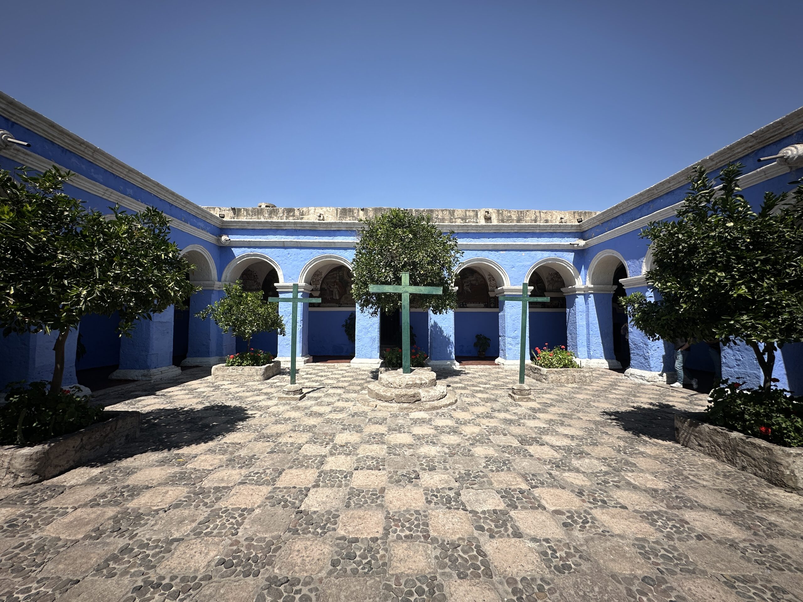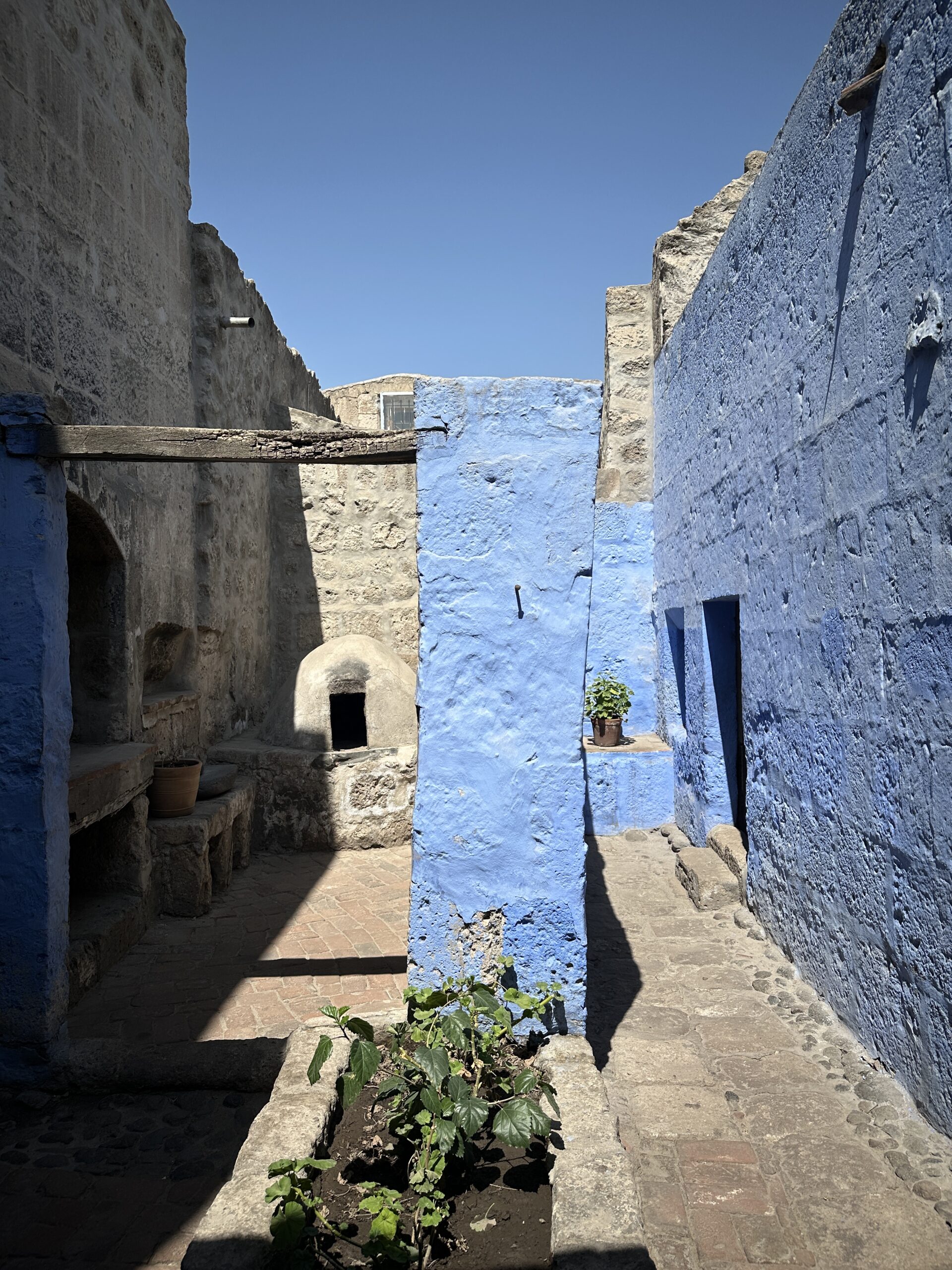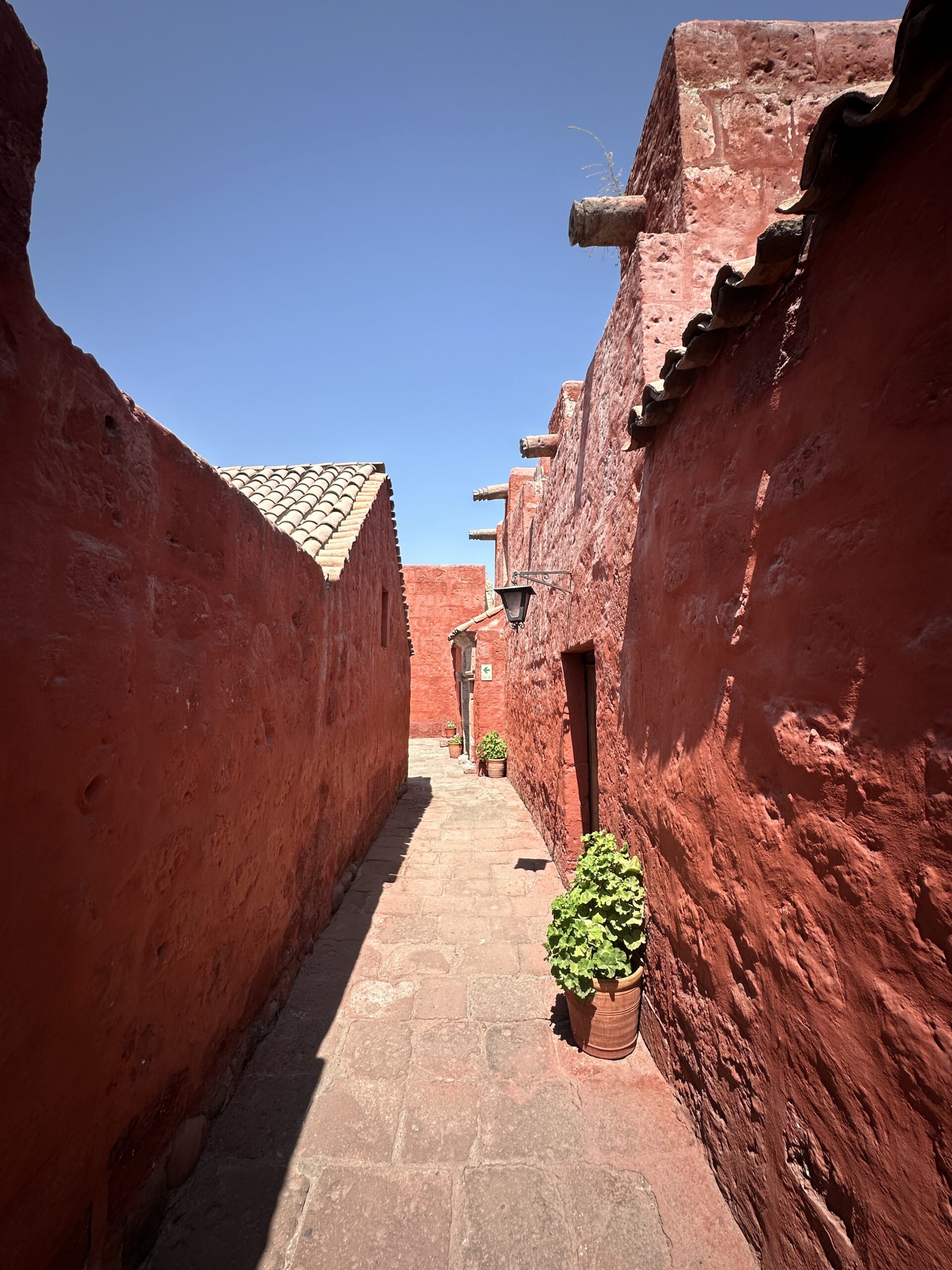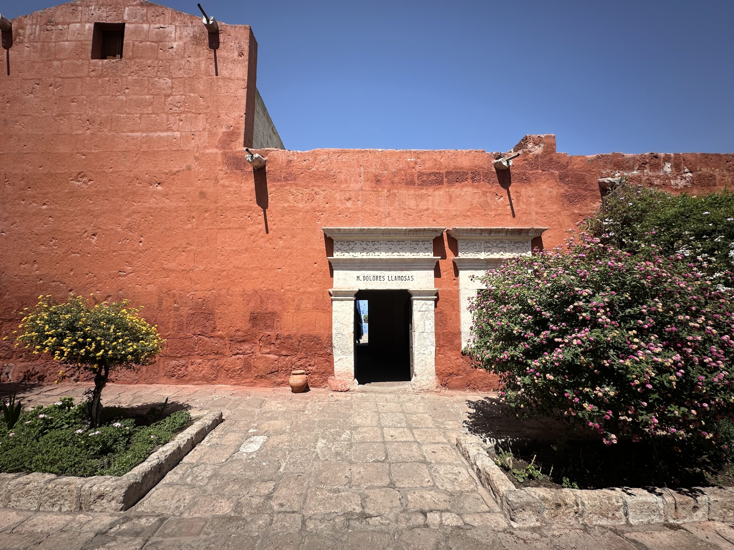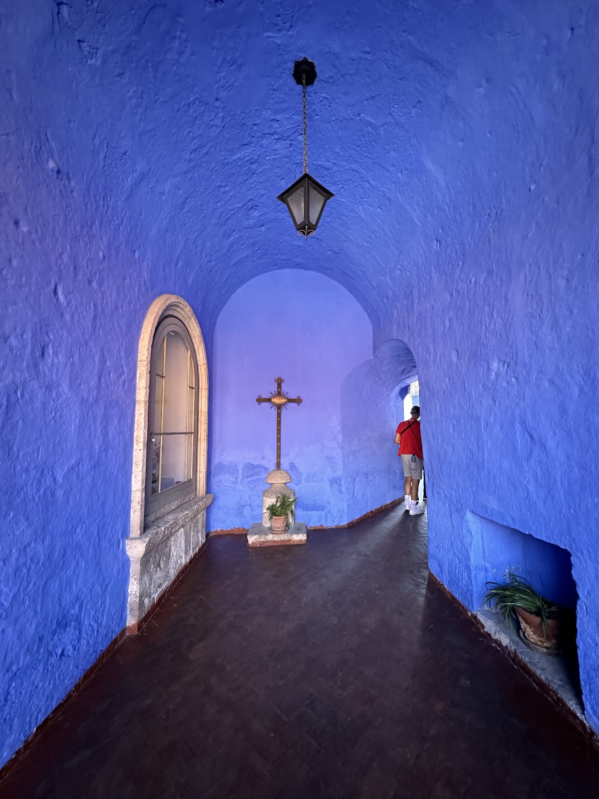 Le mura alte del perimetro la preservano da incursioni esterne e da occhi indiscreti. È pietra sillar, di origine vulcanica, il suo candore si sposa perfettamente con l’architettura coloniale. Le strette strade interne, le facciate delle celle e le colonne dei porticati sono dipinte con un azzurro ed un rosso mattone molto decisi che si alternano creando ad ogni angolo degli scorci davvero deliziosi.