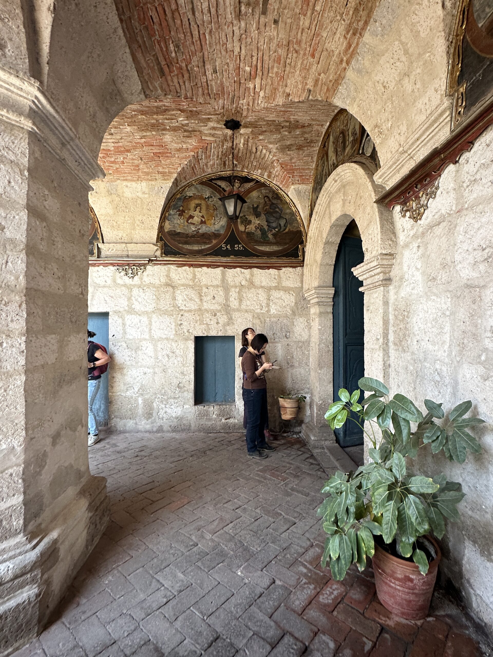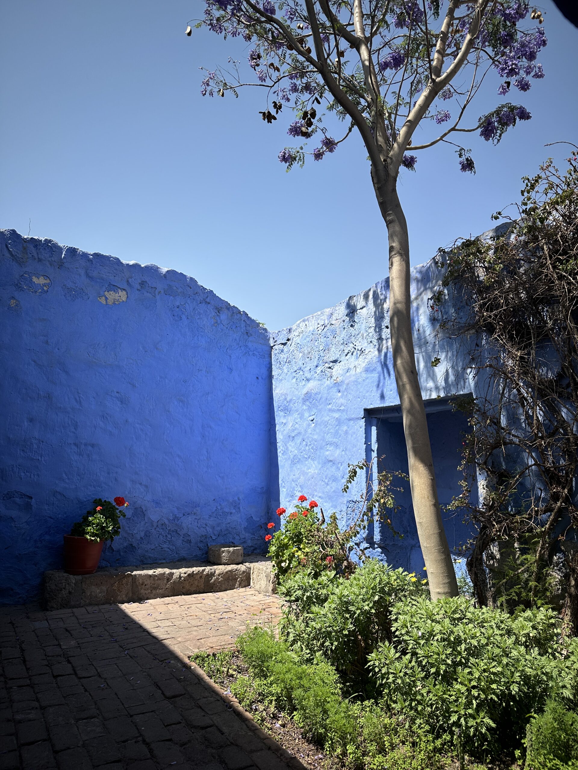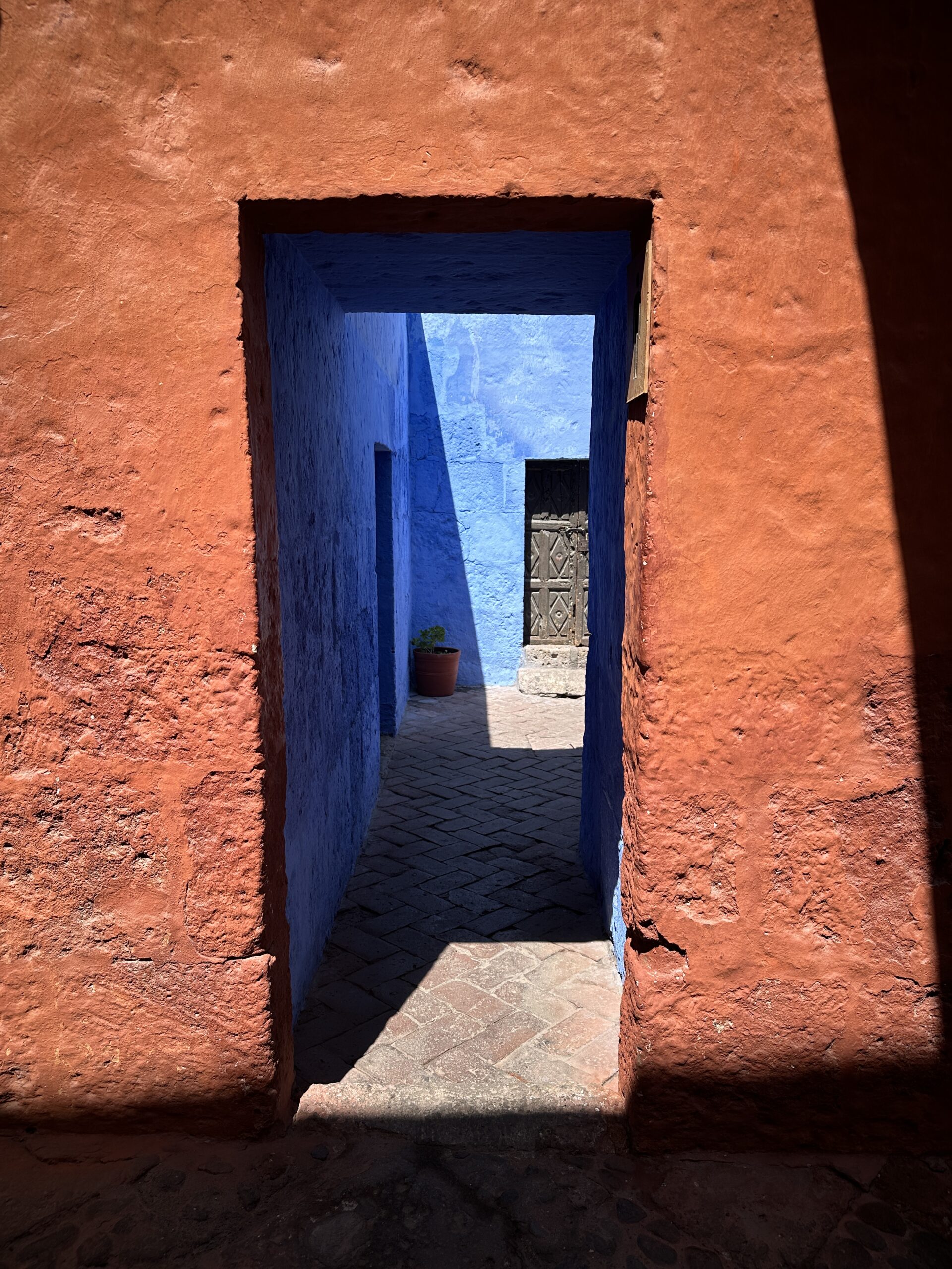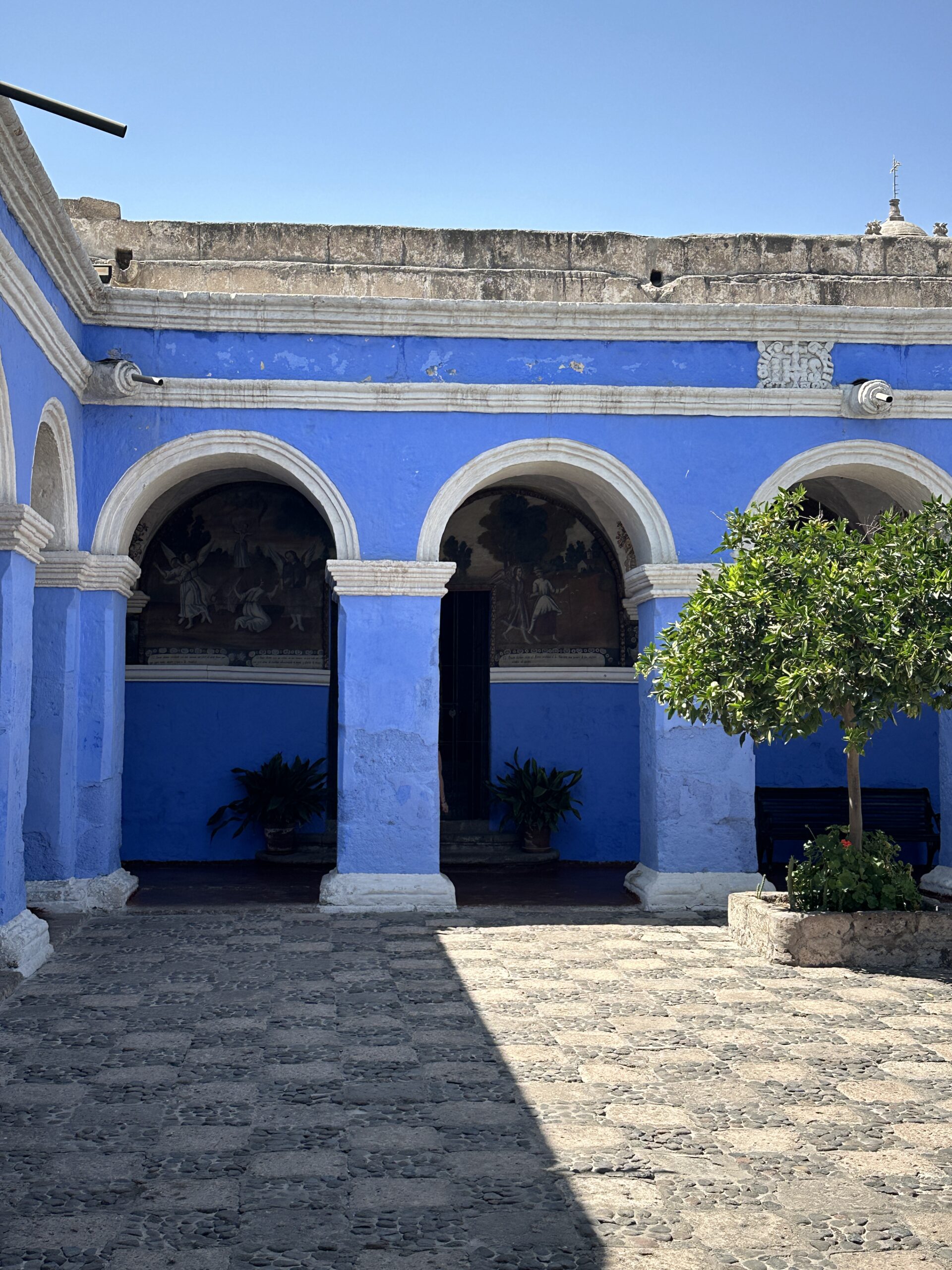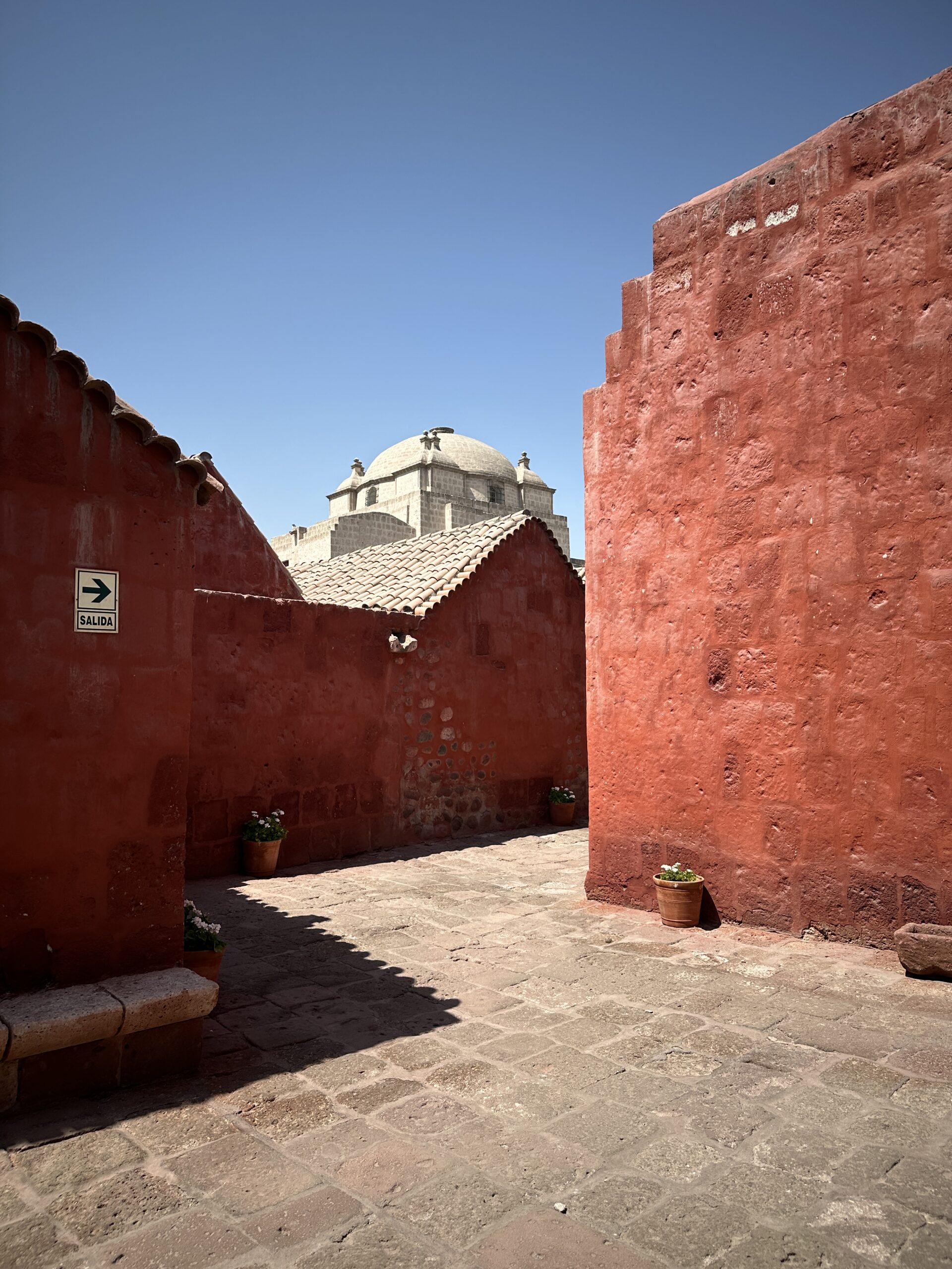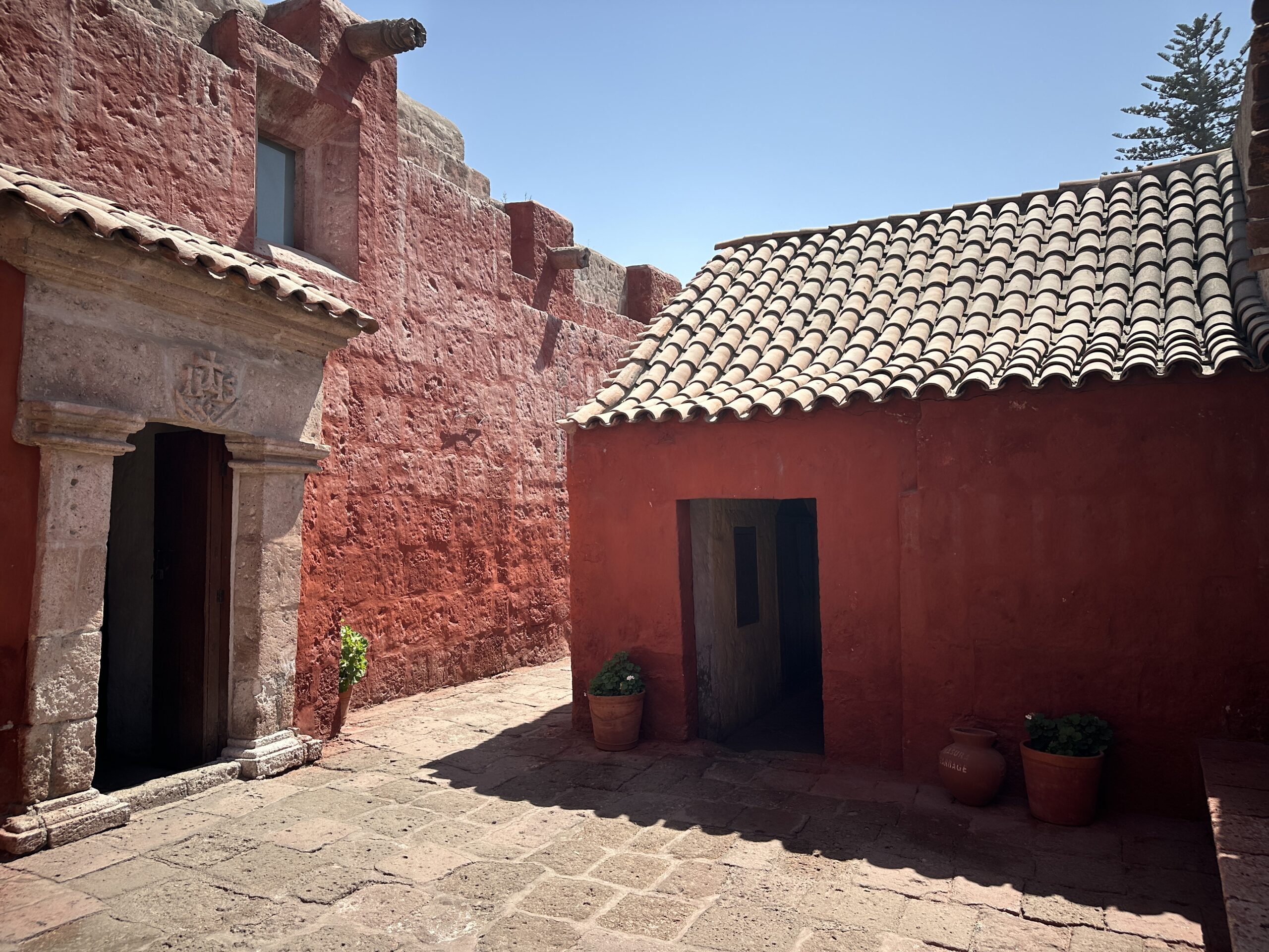 Le mura alte del perimetro la preservano da incursioni esterne e da occhi indiscreti. È pietra sillar, di origine vulcanica, il suo candore si sposa perfettamente con l’architettura coloniale. Le strette strade interne, le facciate delle celle e le colonne dei porticati sono dipinte con un azzurro ed un rosso mattone molto decisi che si alternano creando ad ogni angolo degli scorci davvero deliziosi.