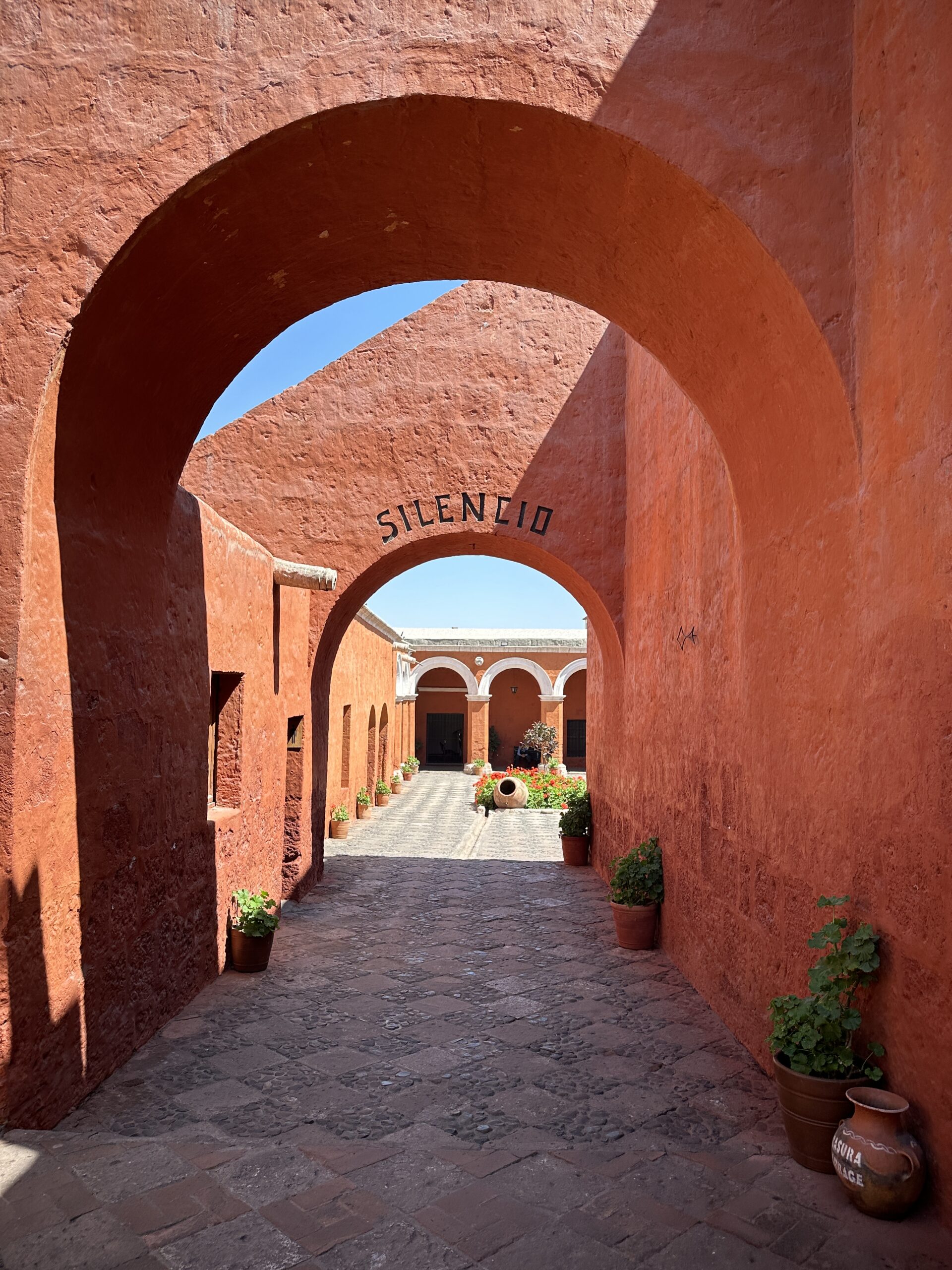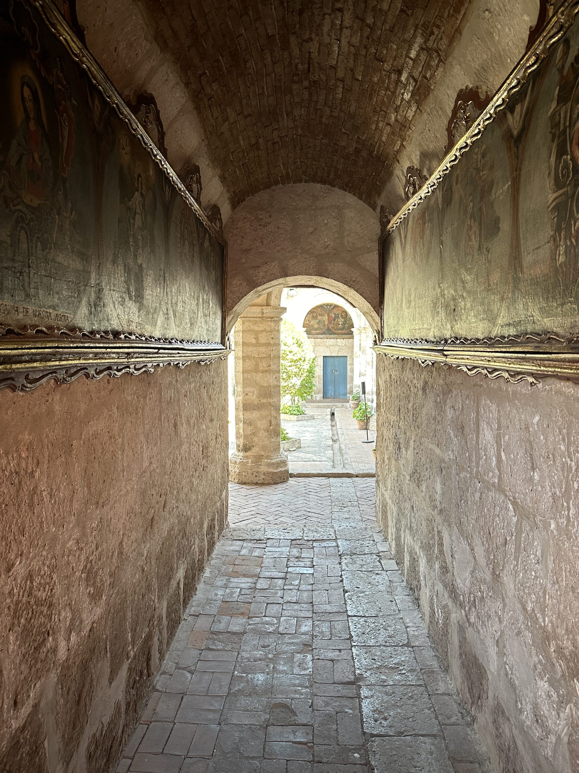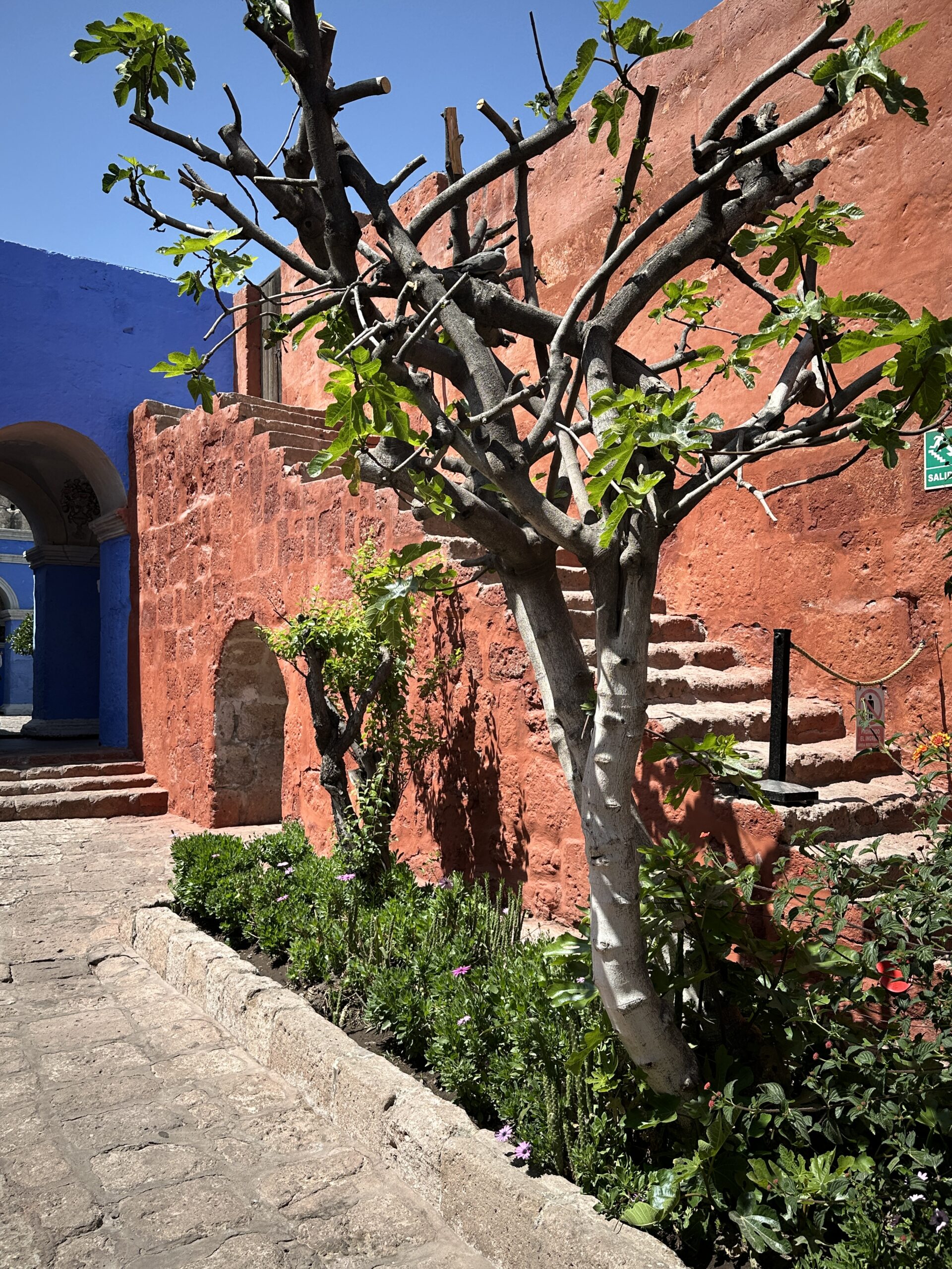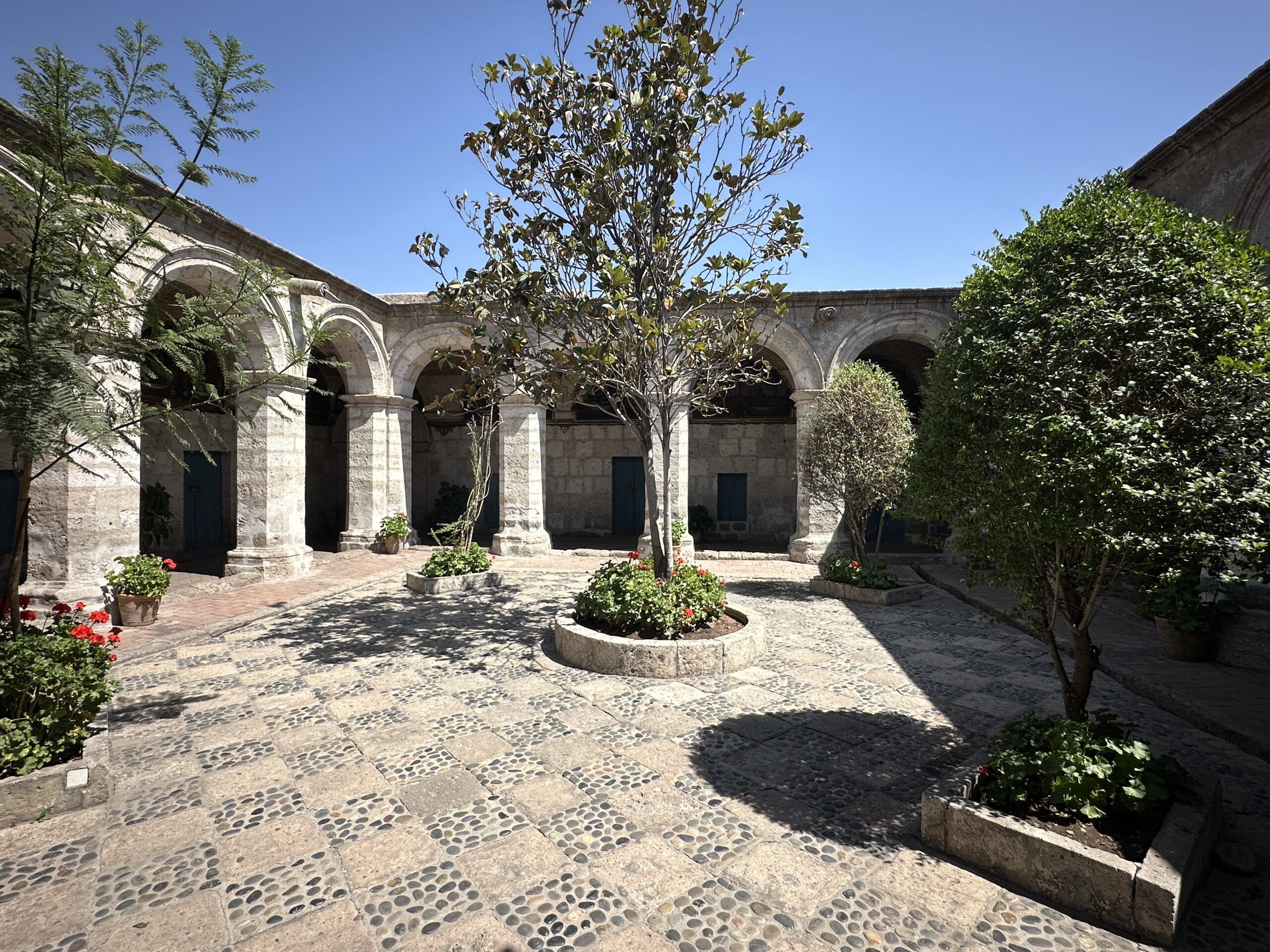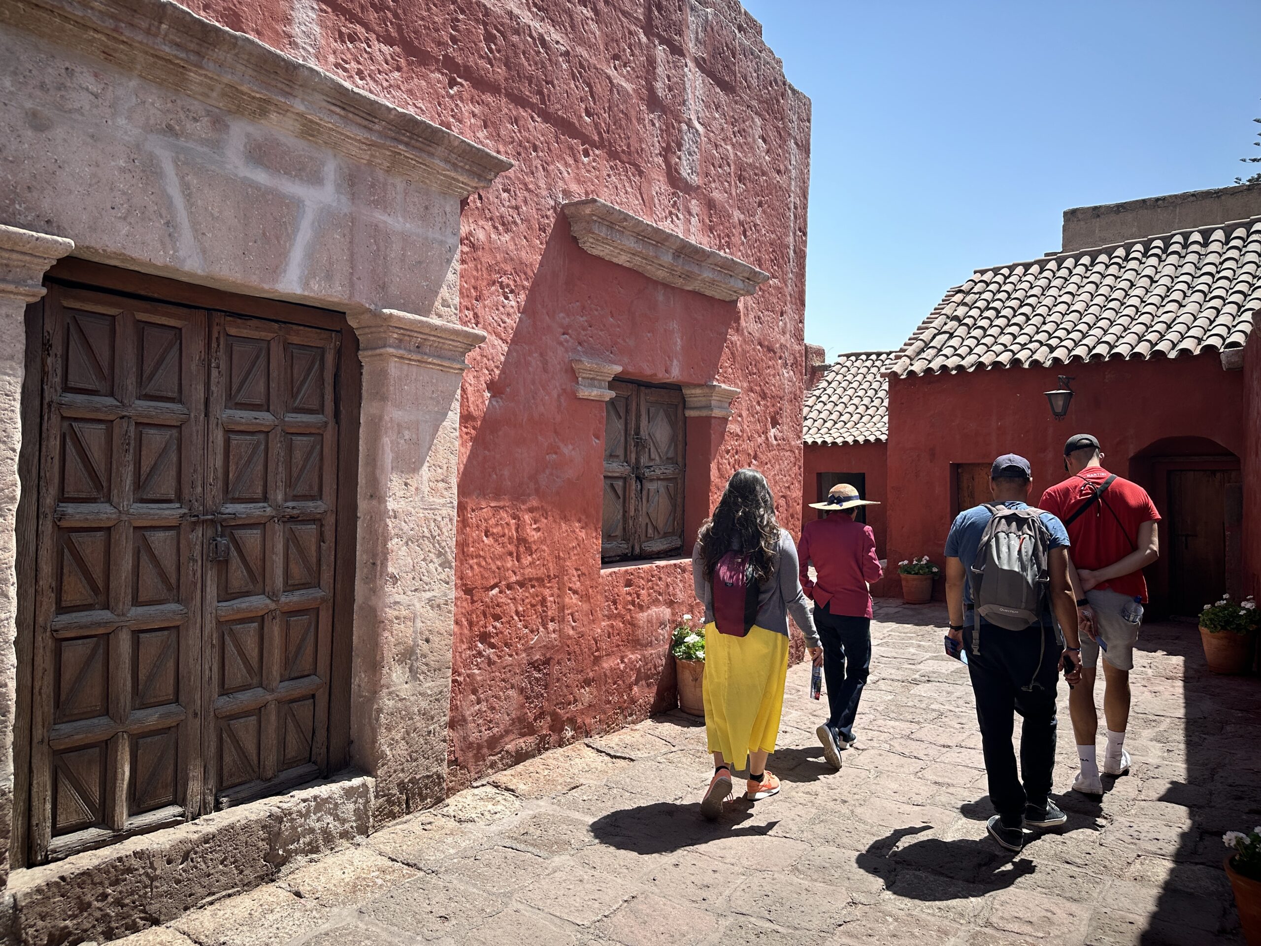 Le mura alte del perimetro la preservano da incursioni esterne e da occhi indiscreti. È pietra sillar, di origine vulcanica, il suo candore si sposa perfettamente con l’architettura coloniale. Le strette strade interne, le facciate delle celle e le colonne dei porticati sono dipinte con un azzurro ed un rosso mattone molto decisi che si alternano creando ad ogni angolo degli scorci davvero deliziosi.
