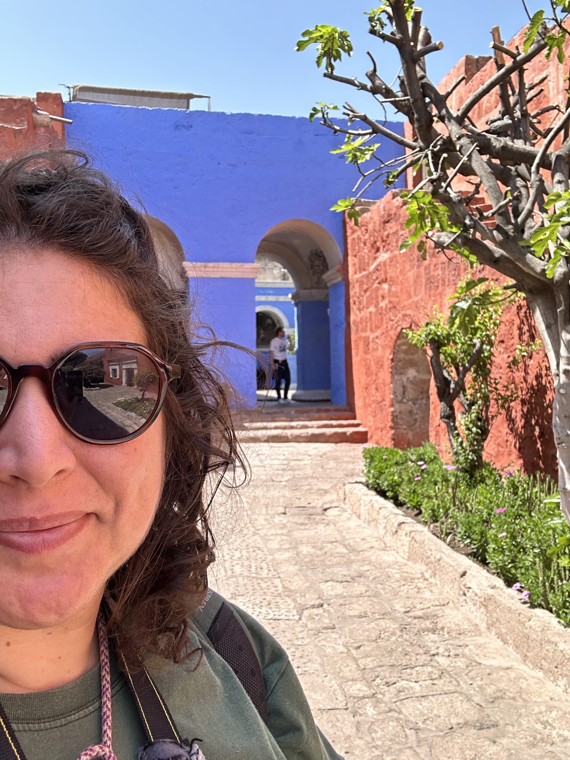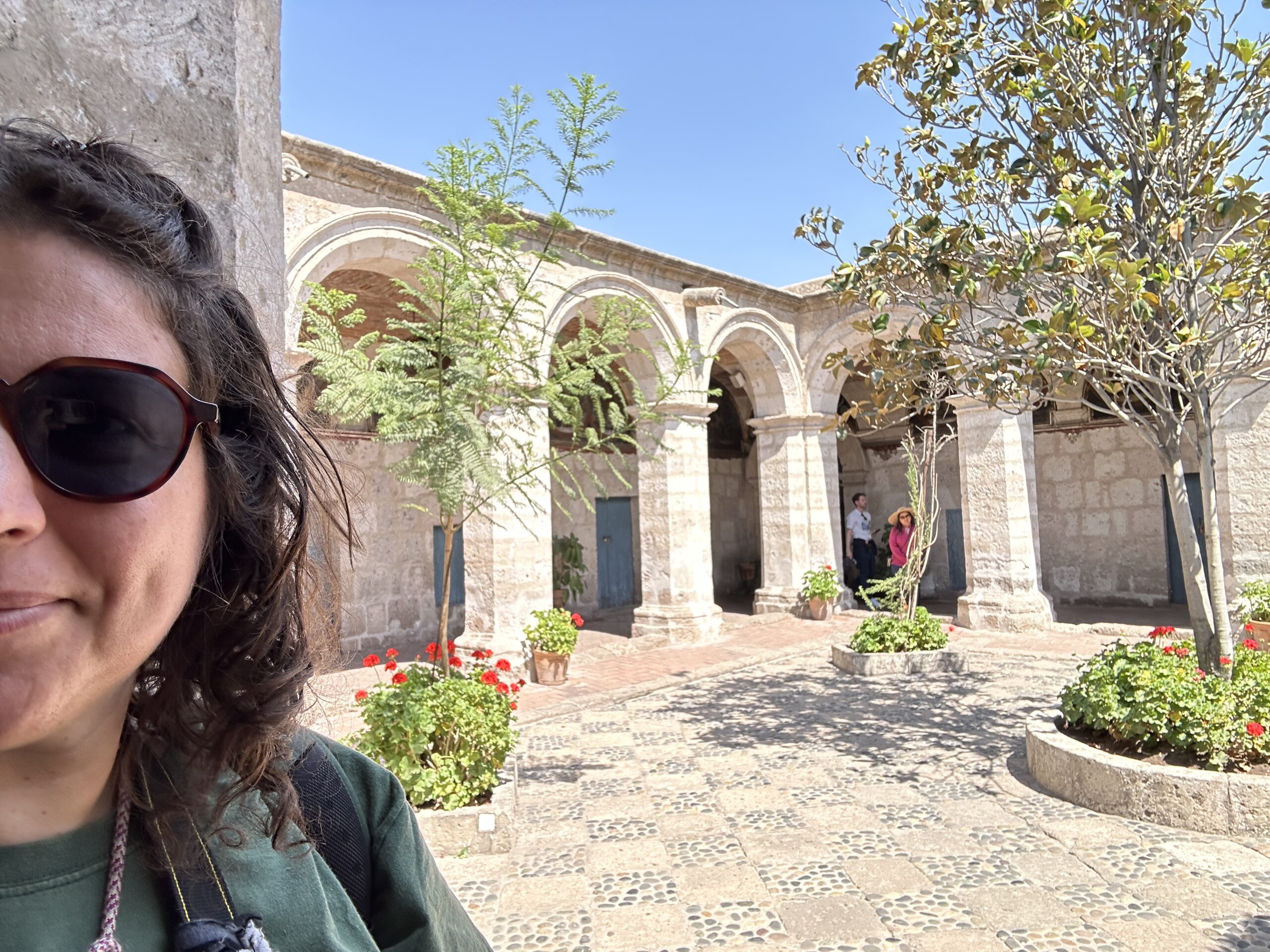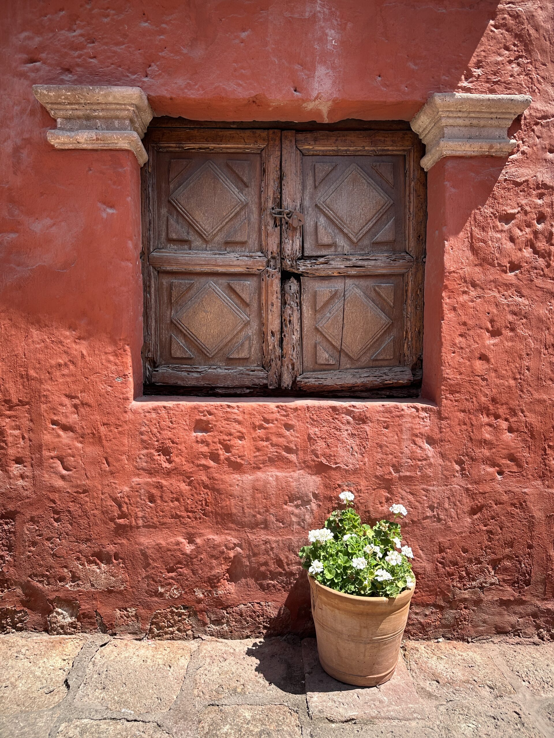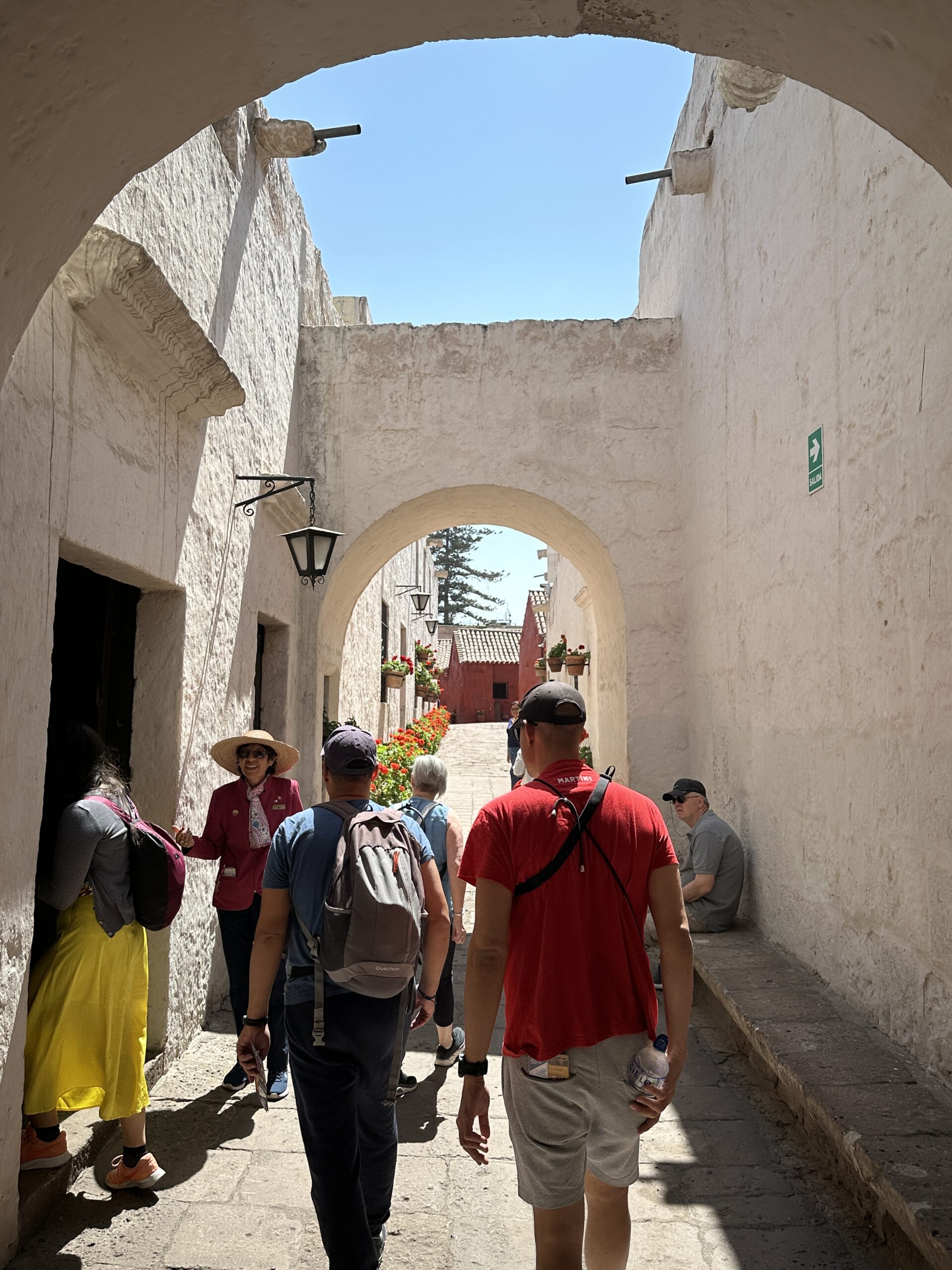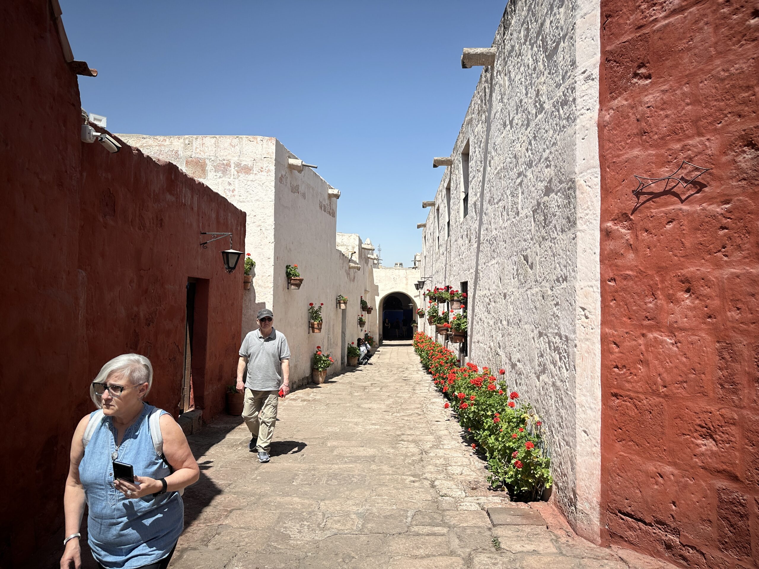 Le mura alte del perimetro la preservano da incursioni esterne e da occhi indiscreti. È pietra sillar, di origine vulcanica, il suo candore si sposa perfettamente con l’architettura coloniale. Le strette strade interne, le facciate delle celle e le colonne dei porticati sono dipinte con un azzurro ed un rosso mattone molto decisi che si alternano creando ad ogni angolo degli scorci davvero deliziosi.