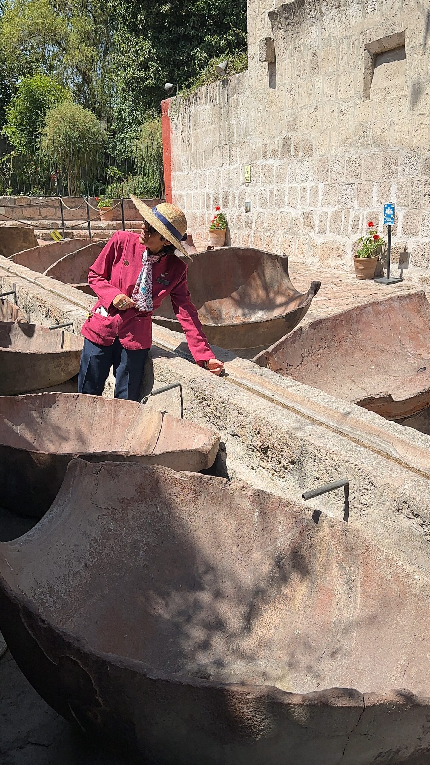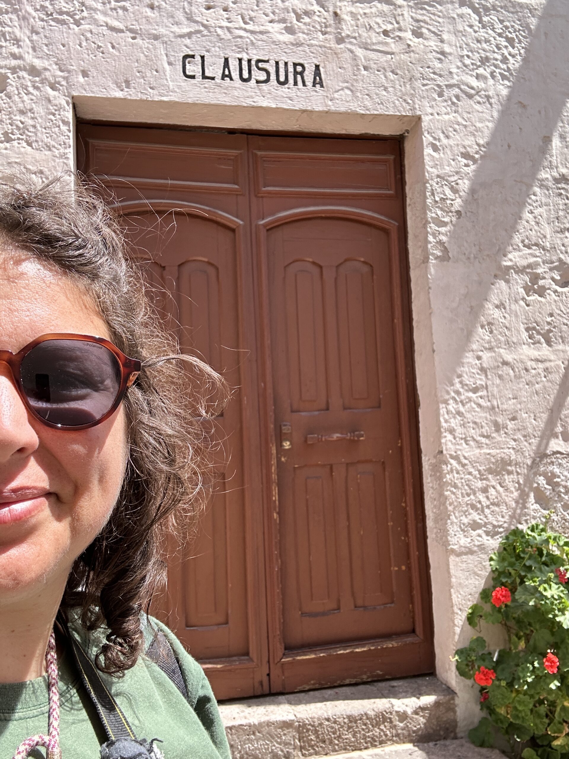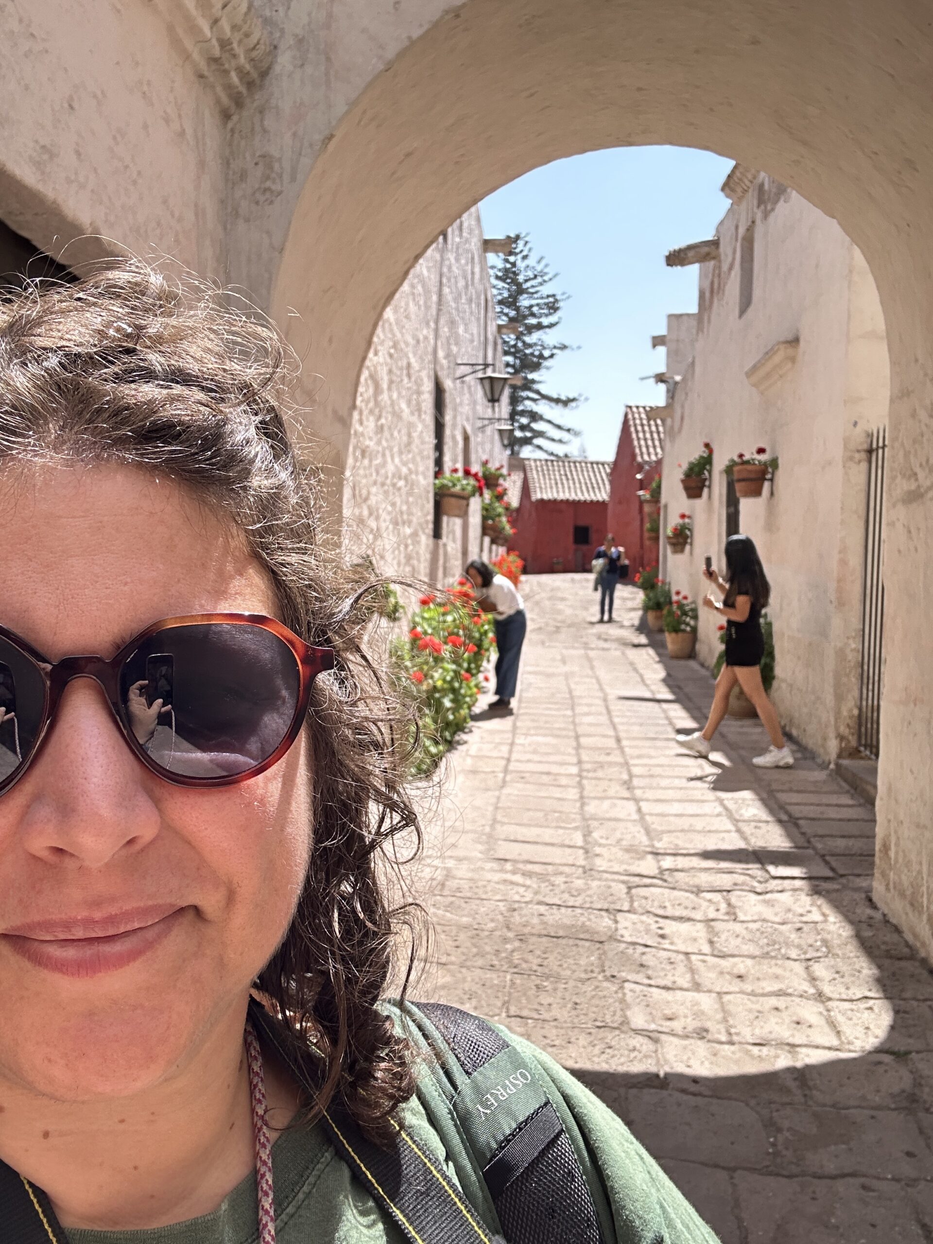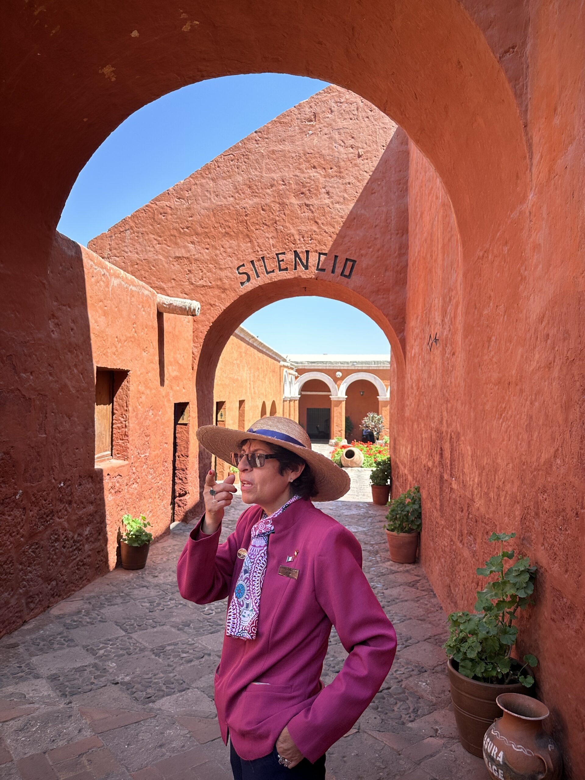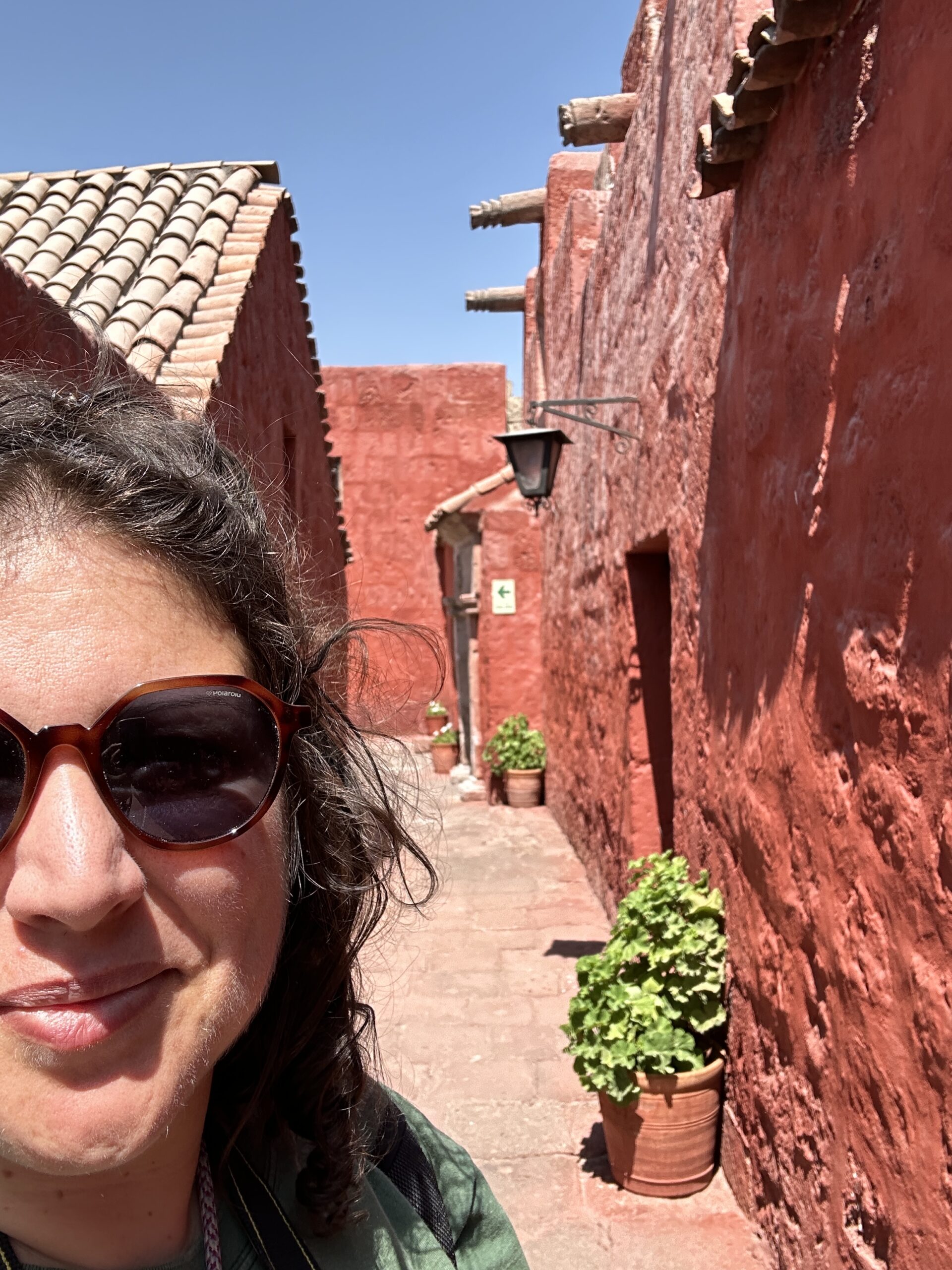 Le mura alte del perimetro la preservano da incursioni esterne e da occhi indiscreti. È pietra sillar, di origine vulcanica, il suo candore si sposa perfettamente con l’architettura coloniale. Le strette strade interne, le facciate delle celle e le colonne dei porticati sono dipinte con un azzurro ed un rosso mattone molto decisi che si alternano creando ad ogni angolo degli scorci davvero deliziosi.