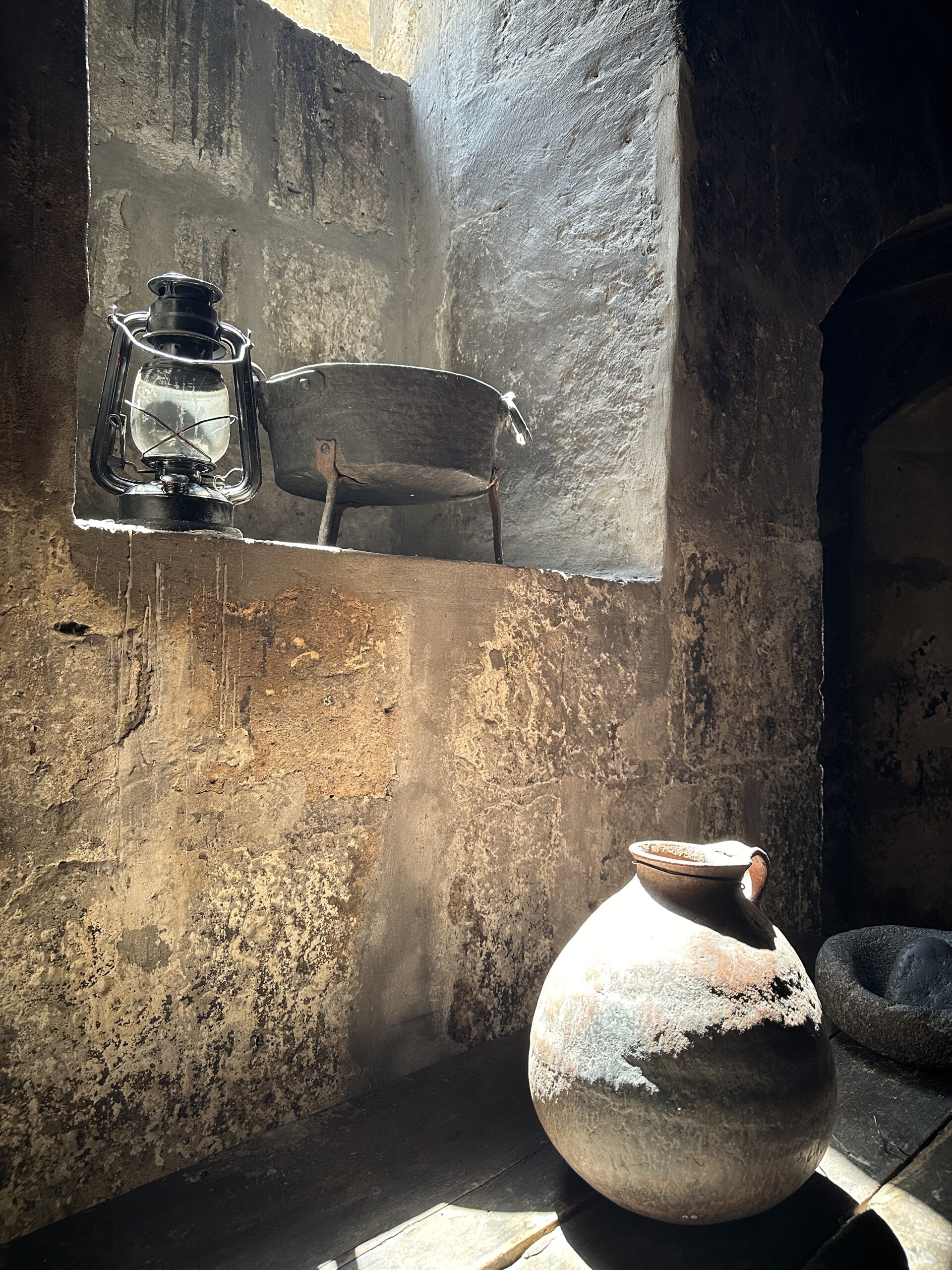 C’è un piacevolissimo sole caldo, le pareti delle costruzioni sono tutte irregolari e ad ogni ambiente ne è collegato a sorpresa un altro ed un altro ancora. Perdersi non sarebbe difficile in questo dedalo di viuzze ma la nostra guida non ci molla un solo istante.