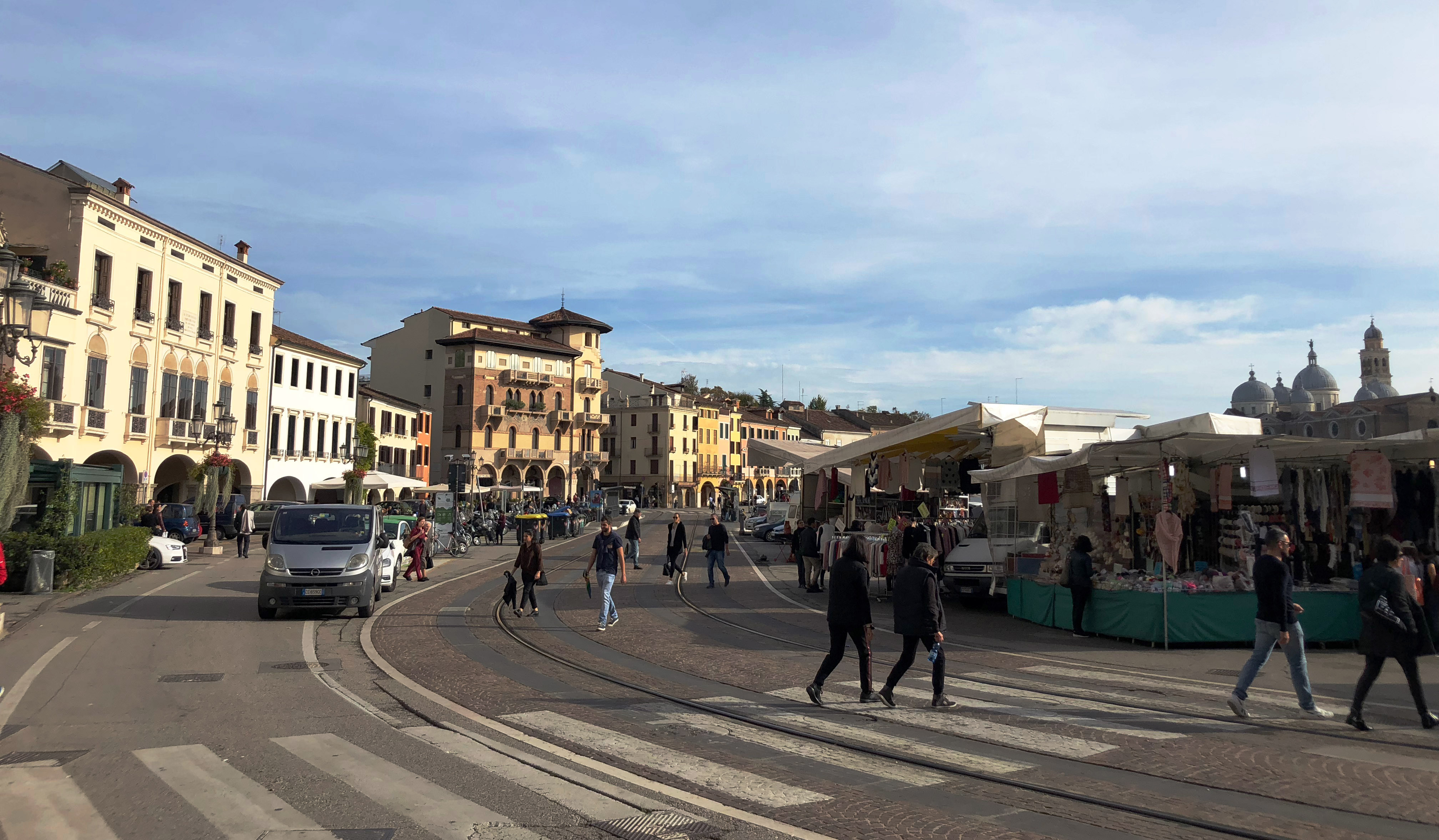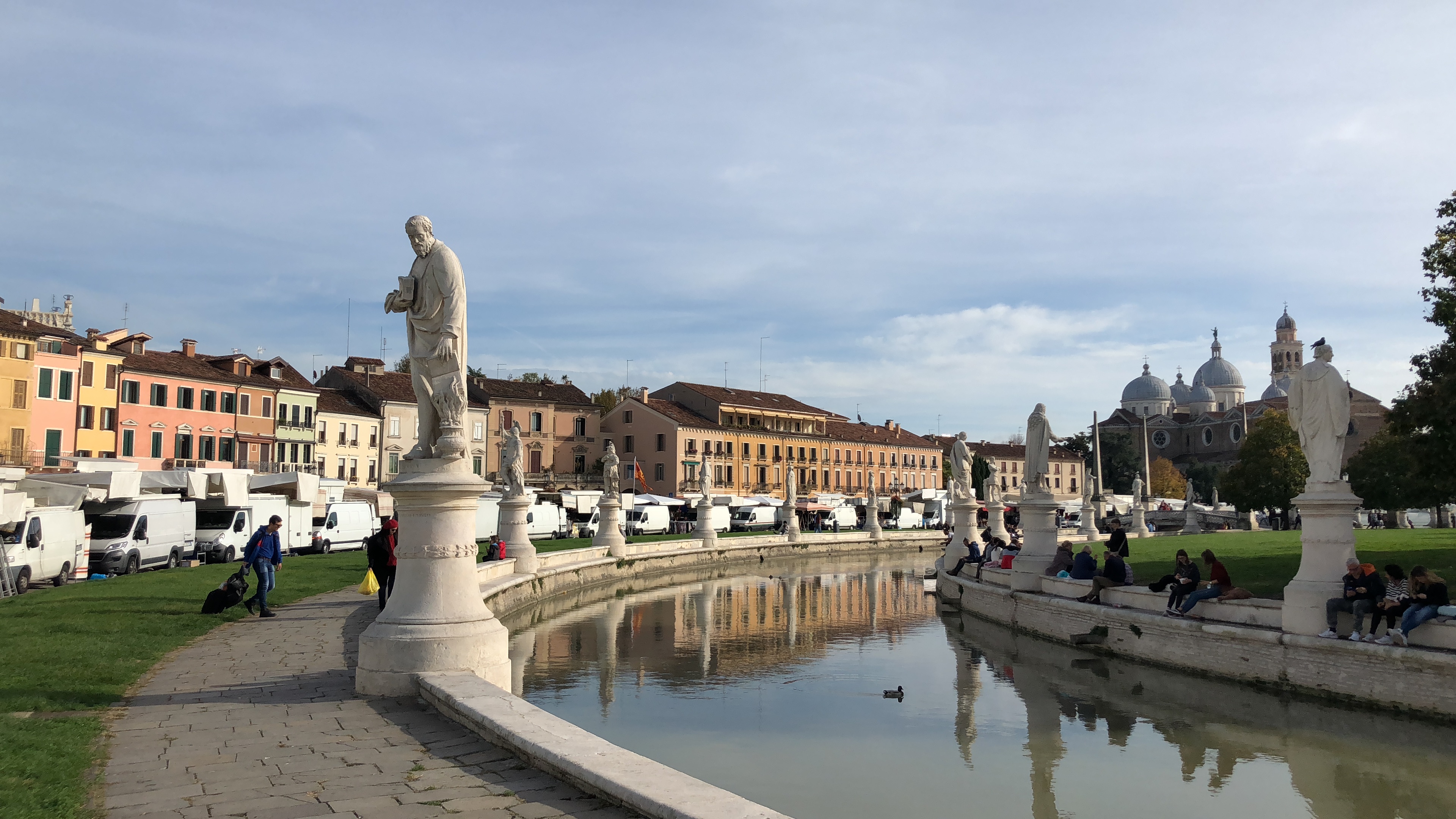 Prato della Valle è la piazza più particolare che abbia mai visto. Decine di statue si ergono lungo i bordi dell’anello ovale, il canale divide l’asfalto da un manto erboso. E’ una tra le piazze più grandi d’Europa e senza la confusione del mercato, offre un rifugio stranamente silenzioso e rilassante.