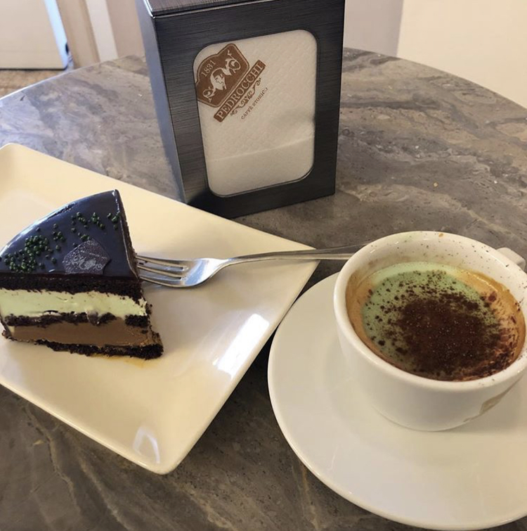 Come prima cosa mi do la carica con un super gustoso caffè Pedrocchi e una fetta di torta al cioccolato, caffè e menta. Non economicissima come pausa di metà mattina ma, se non c’è nessuno nei paraggi a sentenziare su calorie e trigliceridi, è decisamente perfetta.