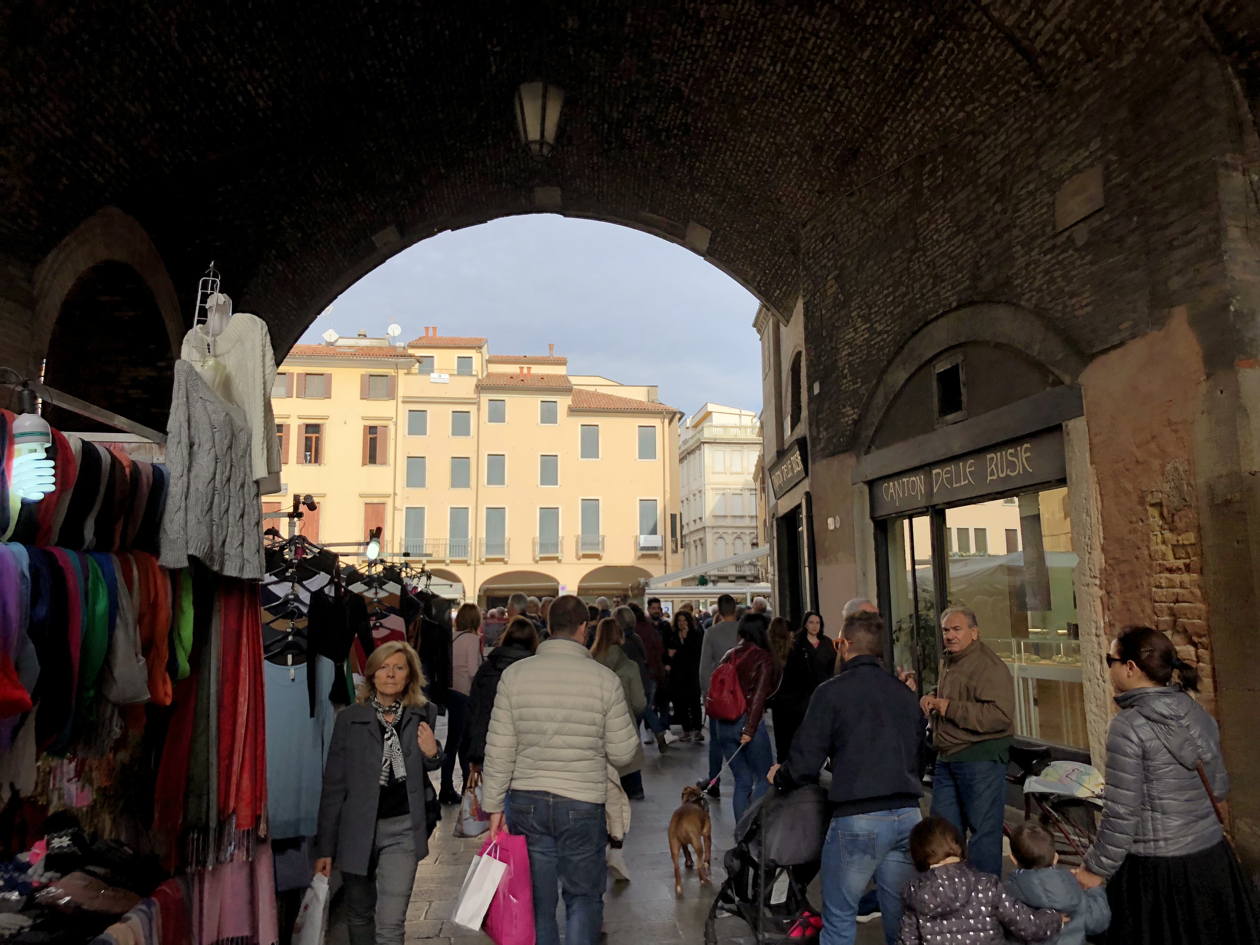 Il mercato regala un’atmosfera quasi orientale, c’è un buon profumo di frutta matura, di fiori; sono immersa nel parlottio dei commercianti e sento lo stridio delle buste di plastica piene che sobbalzano scontrandosi tra loro ad ogni lento passo. I palazzi del centro storico sono affascinanti, con guglie e decorazioni; la torre dell’orologio, il Duomo, il piccolissimo Battistero, le piazzette nascoste, i ponti che regalano straordinari riflessi, i lunghi portici e i mille coloratissimi locali, uno per ogni gusto.