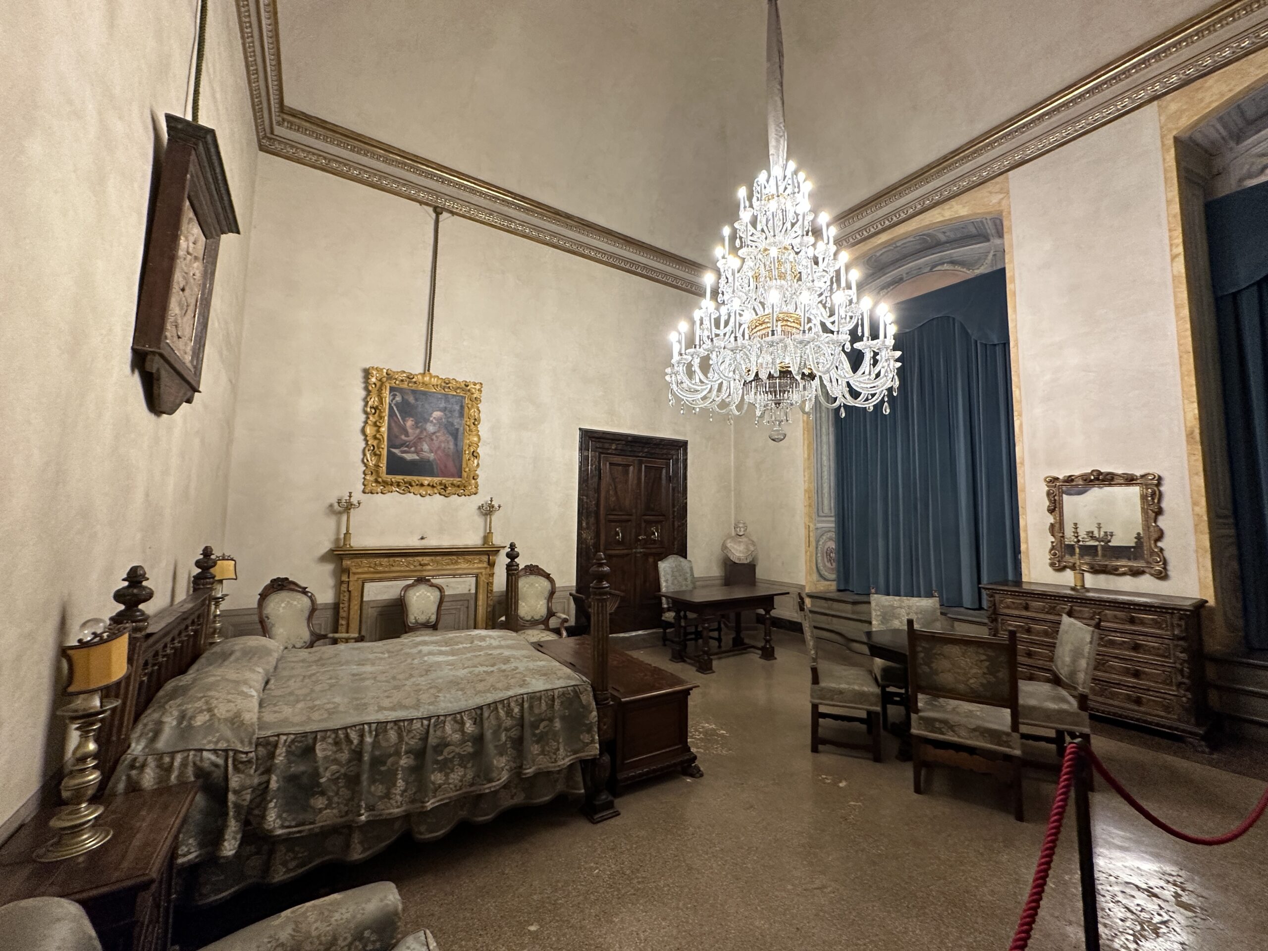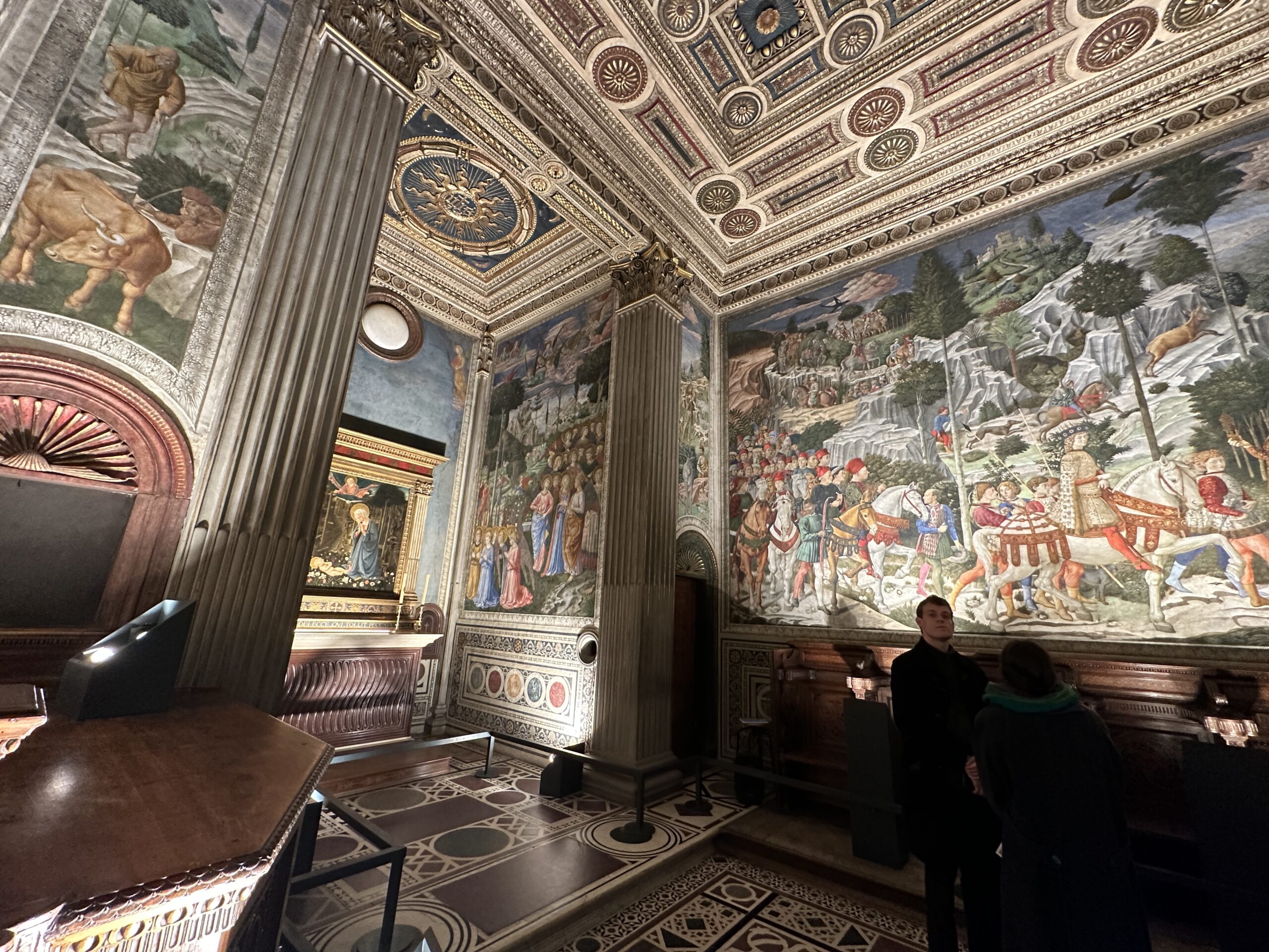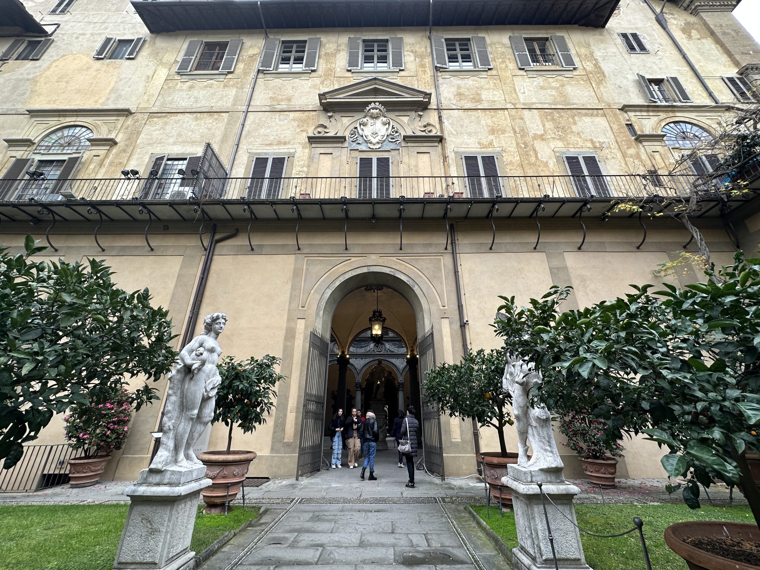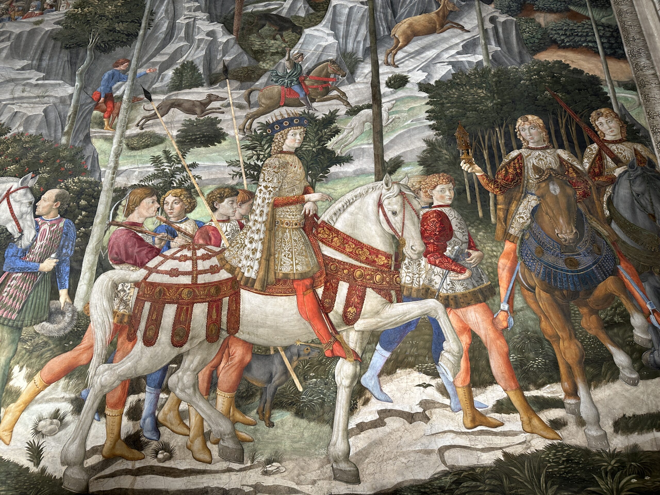 La residenza, con facciate in bugnato (più sporgente al pian terreno e liscio al terzo piano) e corti interne, ospita statue sublimi, arredamenti antichi, pavimenti in cotto e pareti decorate. Le stanze più conosciute e dall’indubbio splendore sono: la galleria degli specchi, il cui soffitto è stato dipinto da Luca Giordano alla fine del 1600, e la cappella dei Magi. Quest’ultima ha un soffitto ligneo, sedute intarsiate, affreschi di Benozzo Gozzoli (siamo nella metà del 1400) e, ad abbellire l’altare, una tempera su tela di Filippo Lippi raffigurante l’Adorazione del Bambin Gesù.