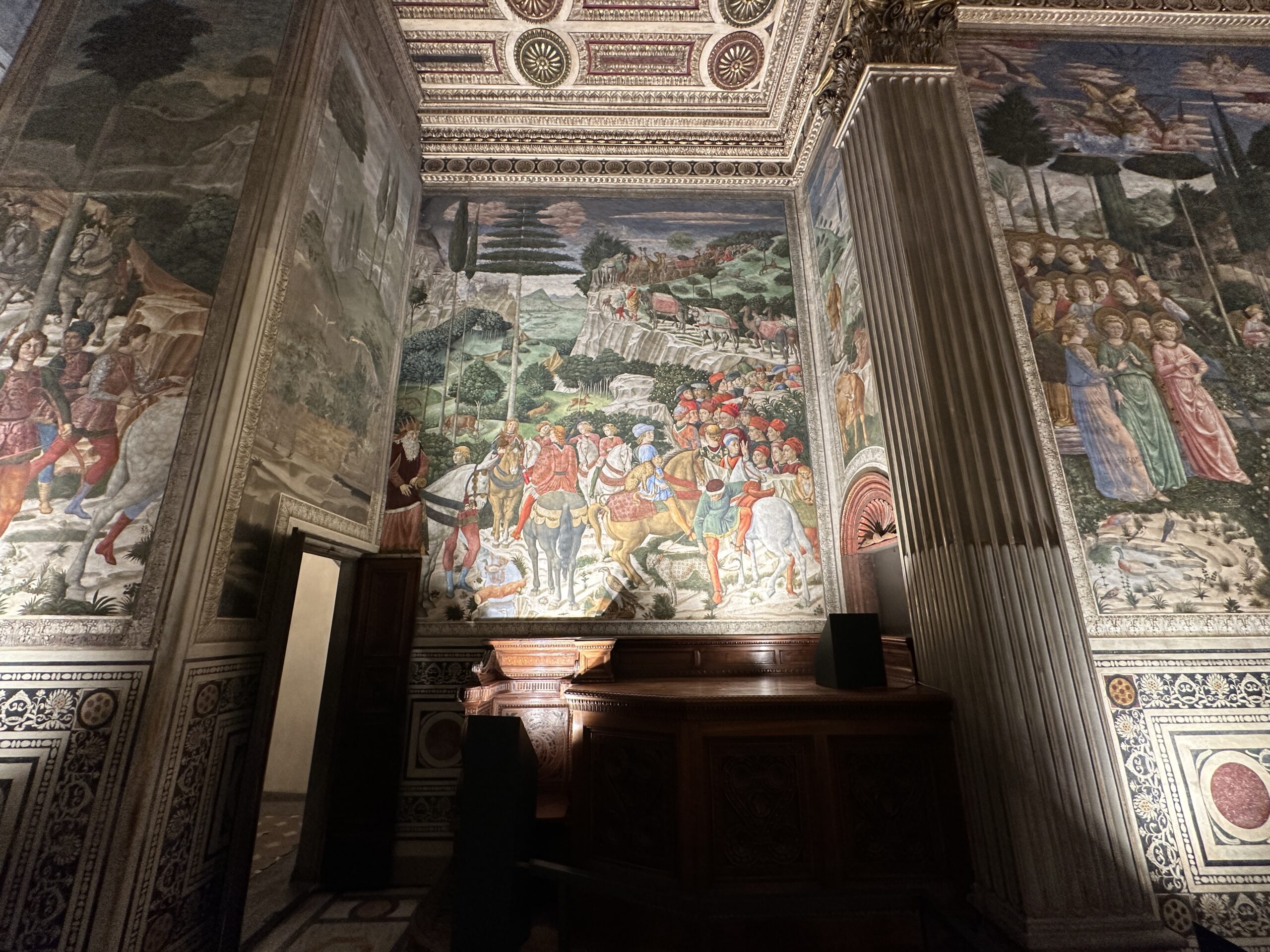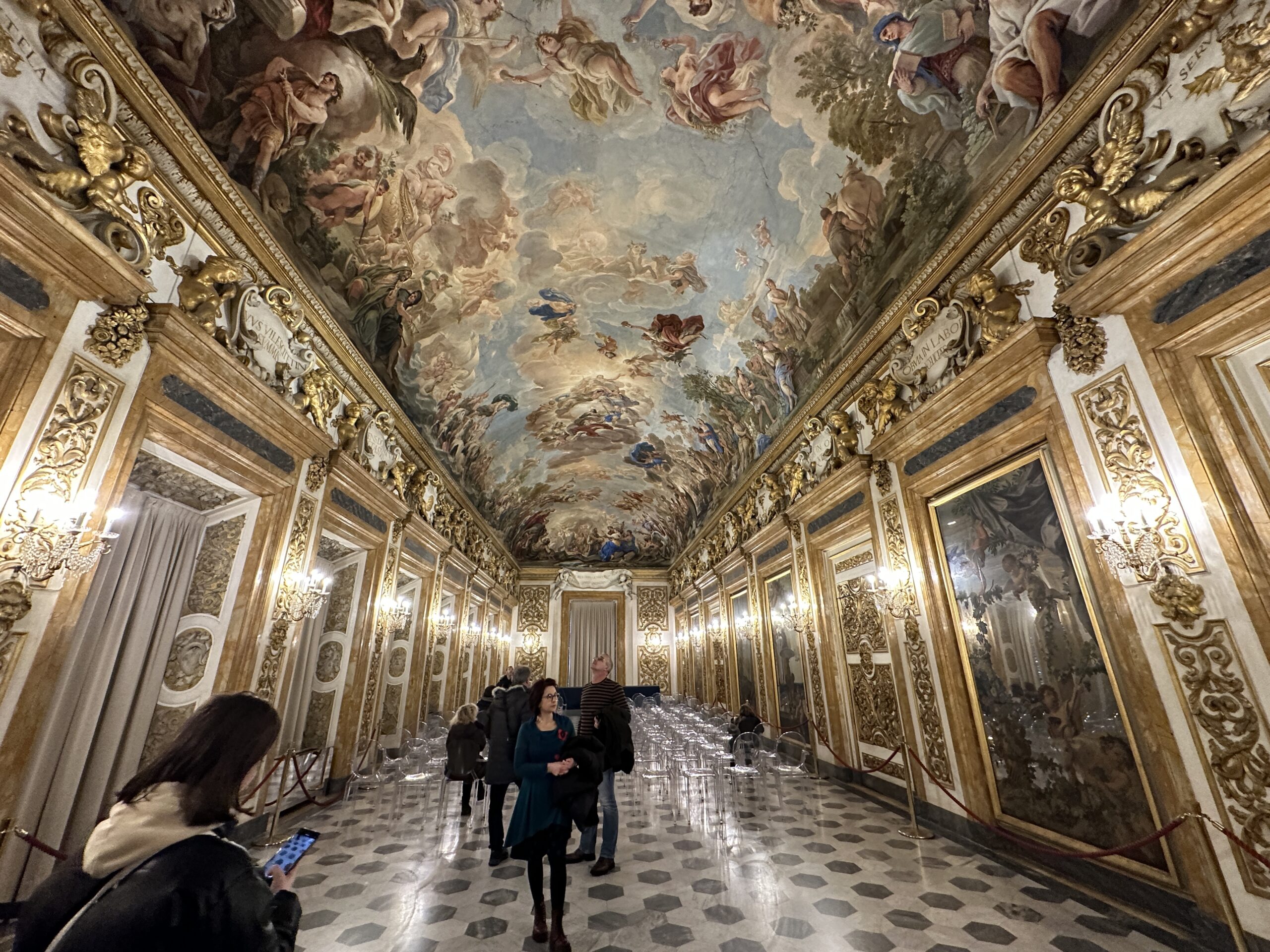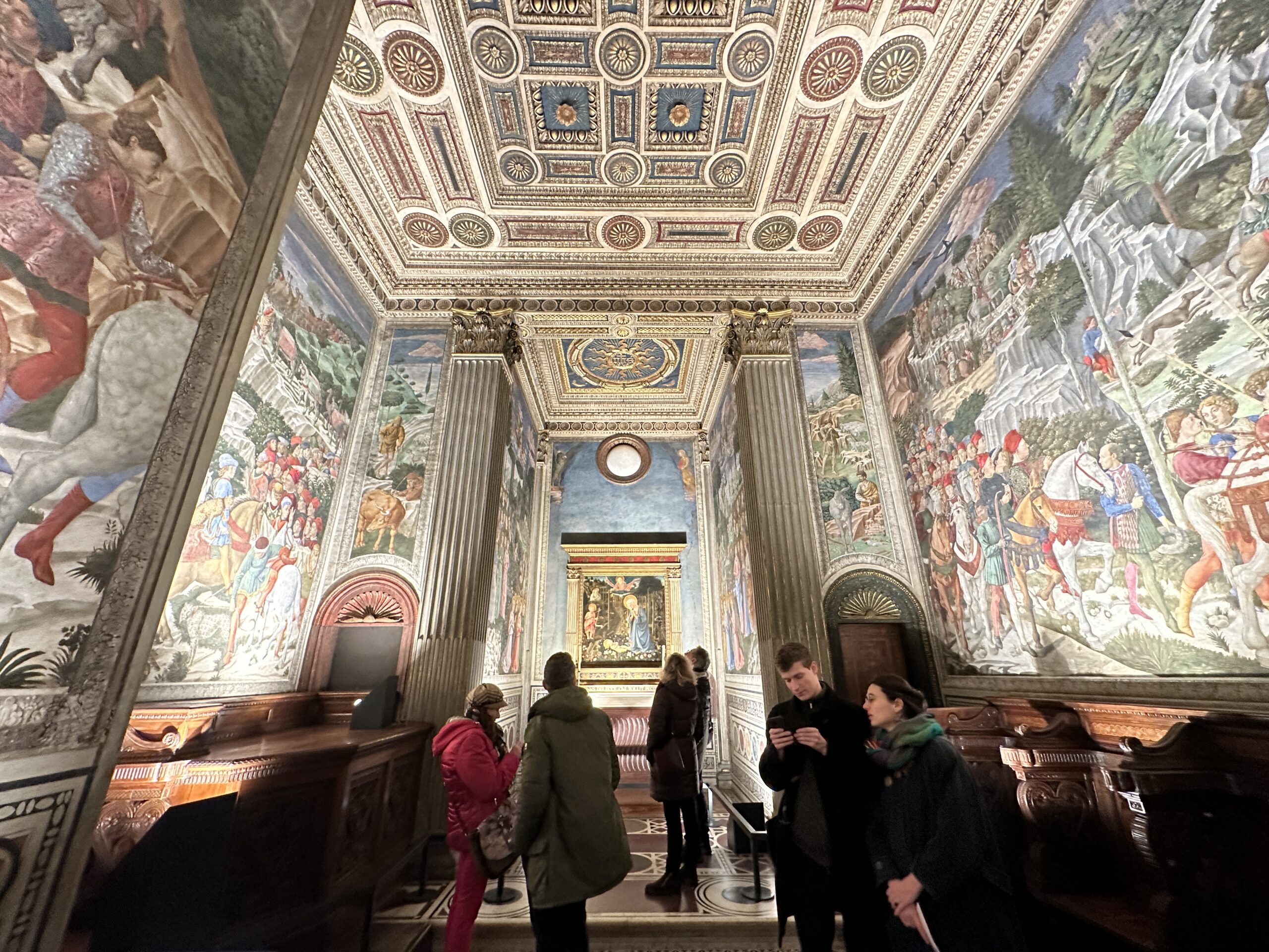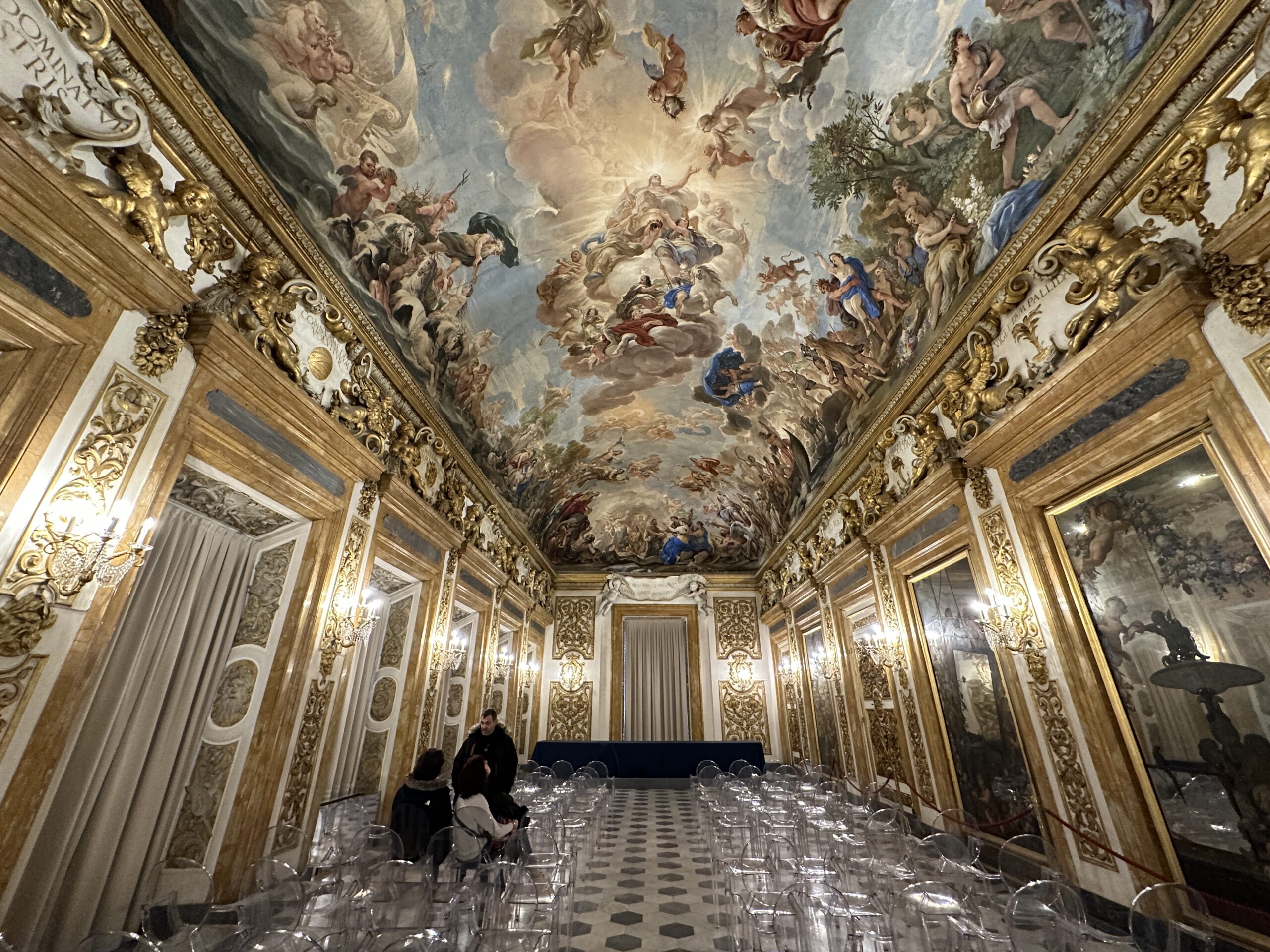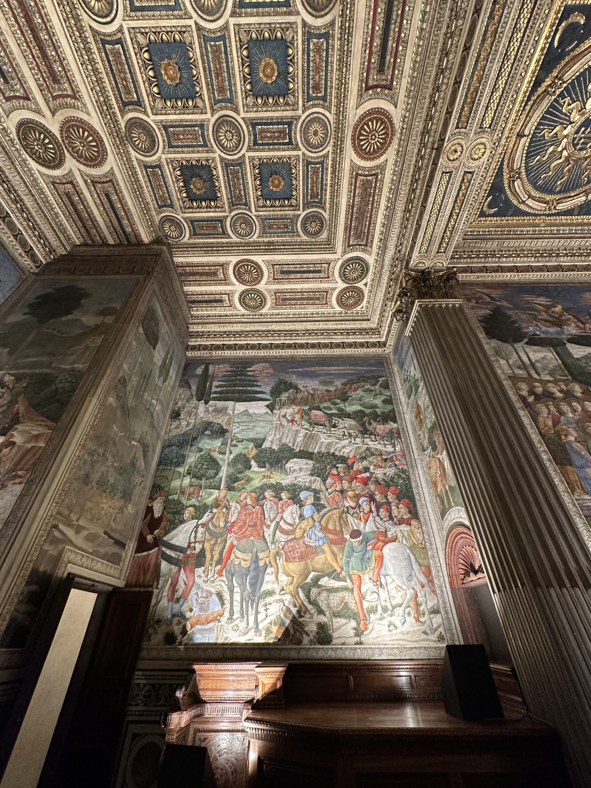 La residenza, con facciate in bugnato (più sporgente al pian terreno e liscio al terzo piano) e corti interne, ospita statue sublimi, arredamenti antichi, pavimenti in cotto e pareti decorate. Le stanze più conosciute e dall’indubbio splendore sono: la galleria degli specchi, il cui soffitto è stato dipinto da Luca Giordano alla fine del 1600, e la cappella dei Magi. Quest’ultima ha un soffitto ligneo, sedute intarsiate, affreschi di Benozzo Gozzoli (siamo nella metà del 1400) e, ad abbellire l’altare, una tempera su tela di Filippo Lippi raffigurante l’Adorazione del Bambin Gesù.