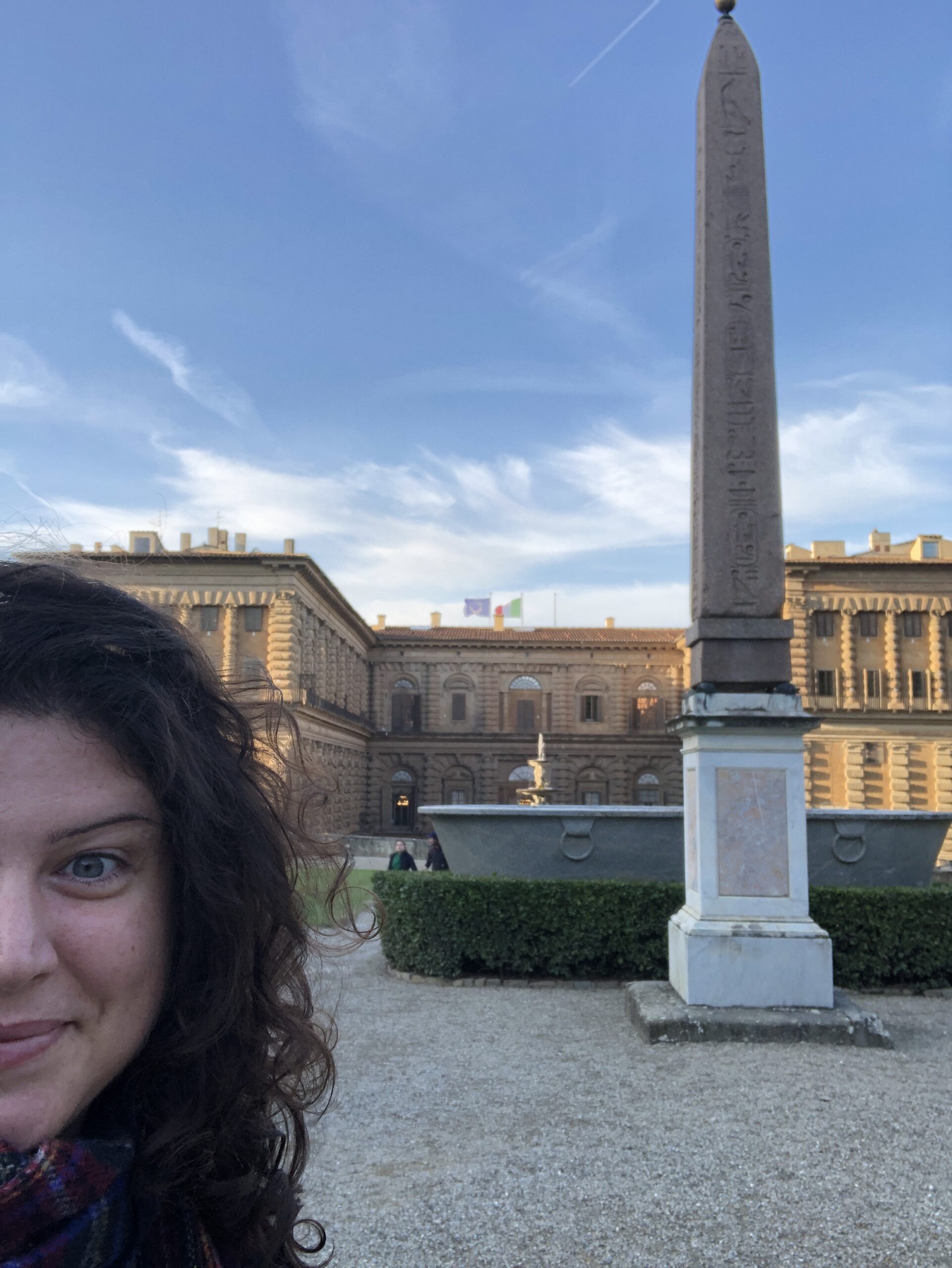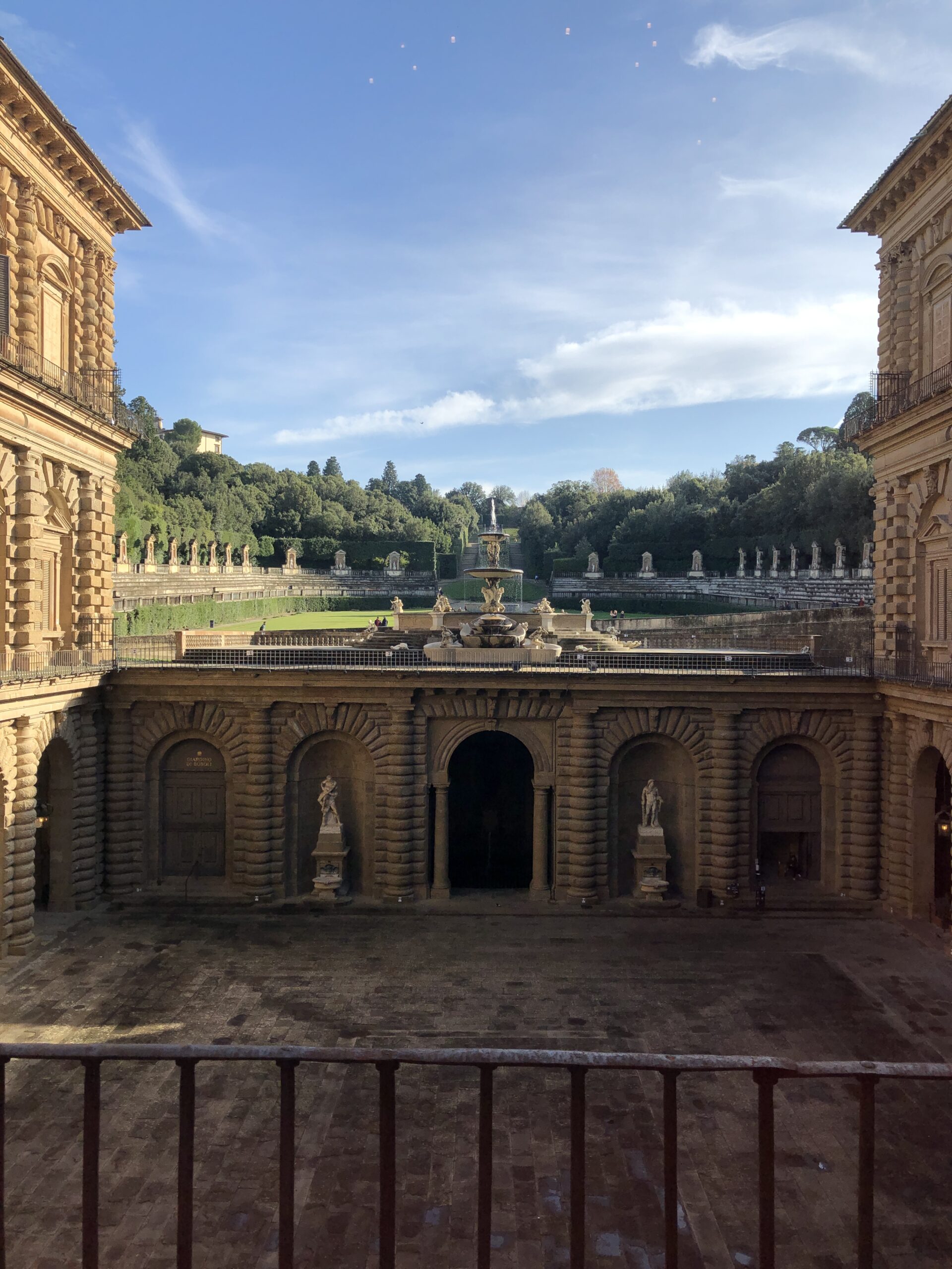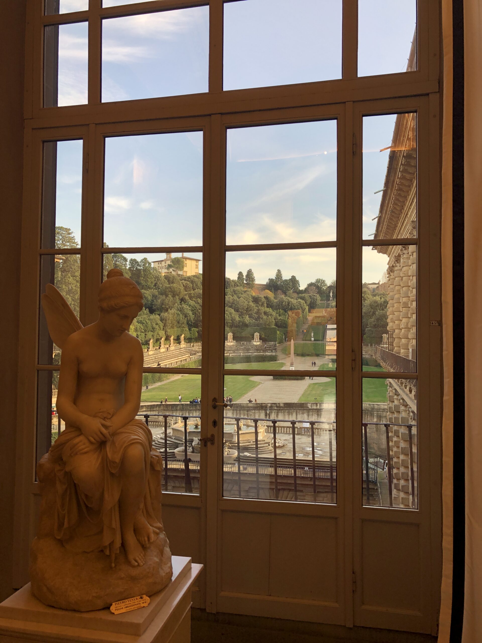 Il giardino di Boboli è esteso per questo so già che non riuscirò a vederne nemmeno la metà ma (detto in confidenza) non mi è mai piaciuto perciò non me ne cruccio. Corro su per le scalinate che si allontanano dal palazzo attraversando il piccolo anfiteatro e aggirando la grande vasca della fontana superiore. In cima c’è una piccola villa dai colori tenui color pastello con un giardino disegnato da bassissime siepi un po’ malconce. La cosa bella di questa terrazza era potersi sporgere un po’ per ammirare Firenze dall’alto e le sue rigogliose colline verdi. Purtroppo, hanno messo una corda lungo tutto il muretto di cinta e, oltre all’estetica del luogo, hanno sciupato anche la magia e la poesia di un panorama perfetto.