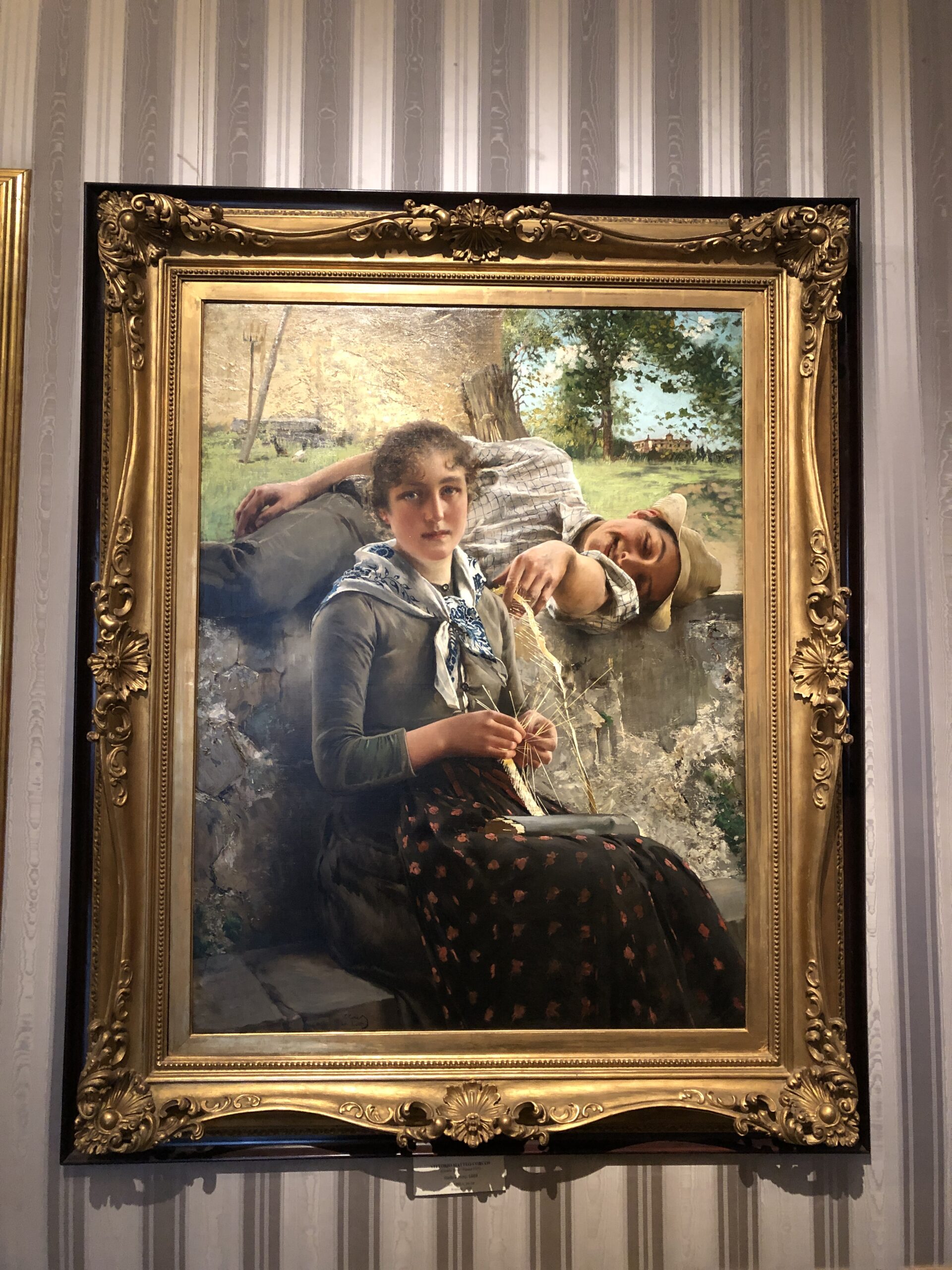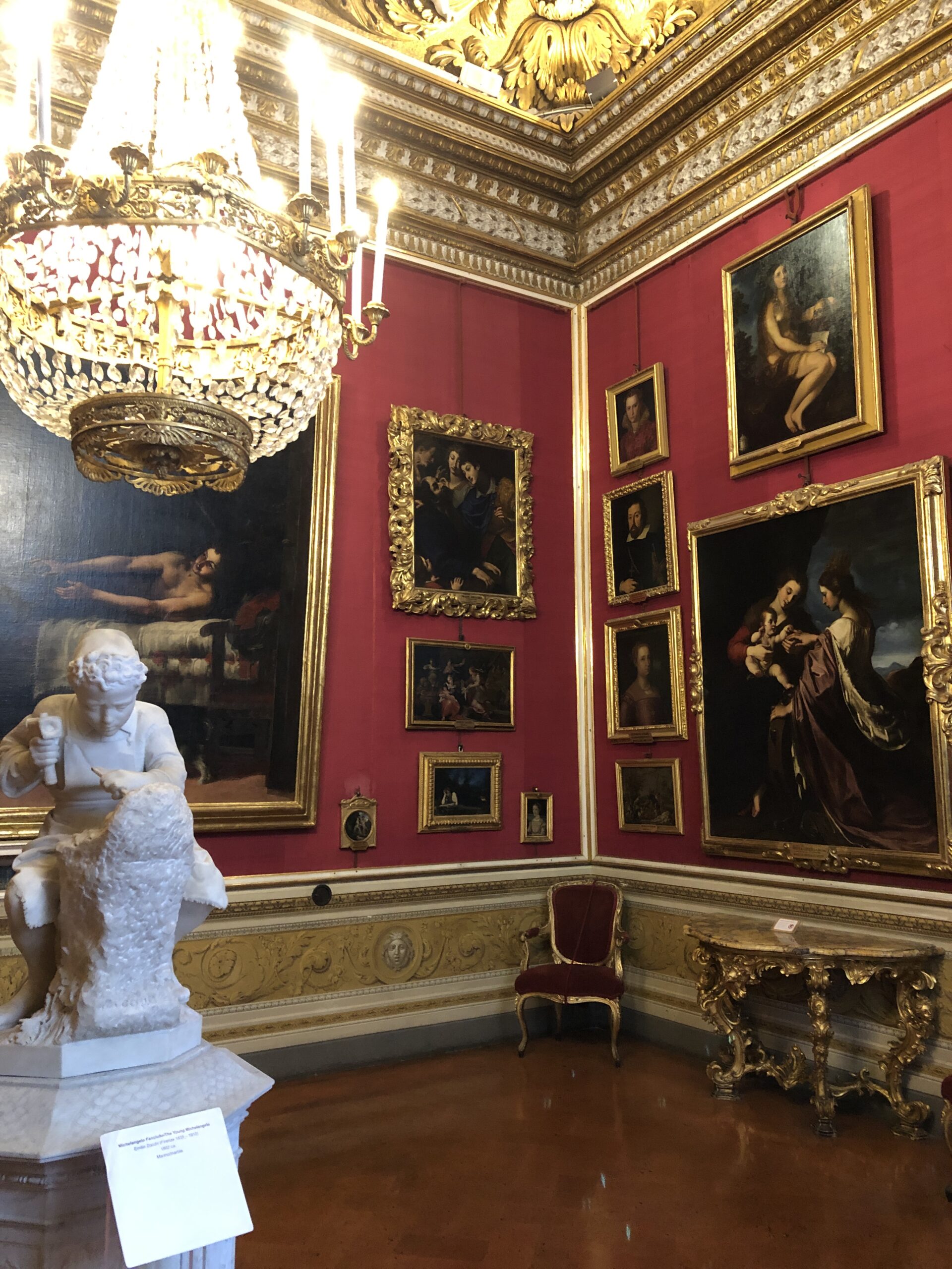 File intere di quadri sistemati uno sopra all’altro in una confusione di colori e geometrie. La carta da parati dalle tinte accese, le cornici color oro, le statue lasciate in mezzo di sala come se dovessero essere portate via da un momento all’altro. Solitamente mi diverto come una matta nelle pinacoteche, trovo sempre facce con espressioni interessanti, gesti inusuali e volti simpatici, questa volta invece mi sembra di stare in palestra, sto allenando il collo e le spalle a movimenti fulminei per eludere la presenza della luce come un pugile prima dell’incontro e sento i glutei pulsare sotto i continui piegamenti per riuscire a trovare la giusta angolazione per catturare l’essenza dell’artista. Inizio a pensare che ne uscirò ignorante come prima, ma molto più in forma.