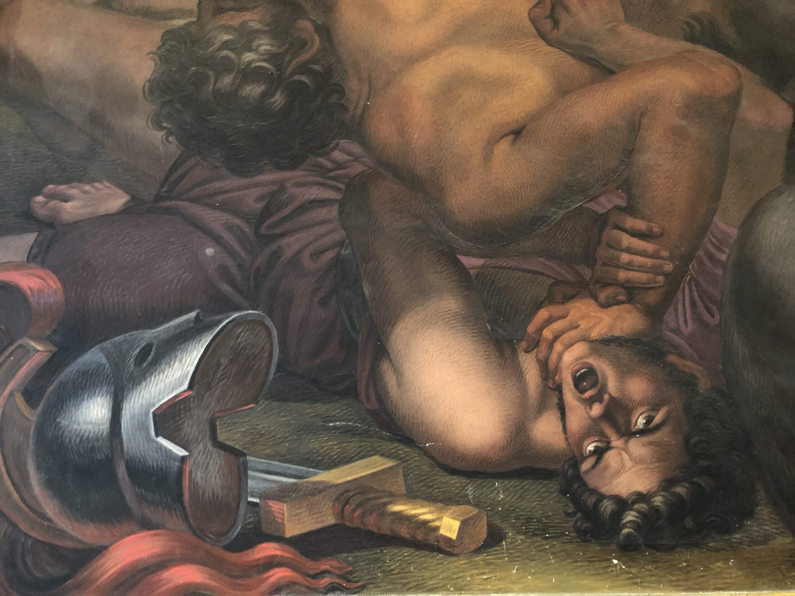 Io e gli altri in sala ci muoviamo come mosche impazzite intorno alla merda, un po’ a destra, un po’ sinistra, ci abbassiamo, poi ci issiamo sulle punte dei piedi e allunghiamo il collo. Macché! Alcuni dipinti restano un vero mistero, come ti muovi ti muovi vedi solo l’alone della luce sui colori ad olio che riflettono come specchi al sole.