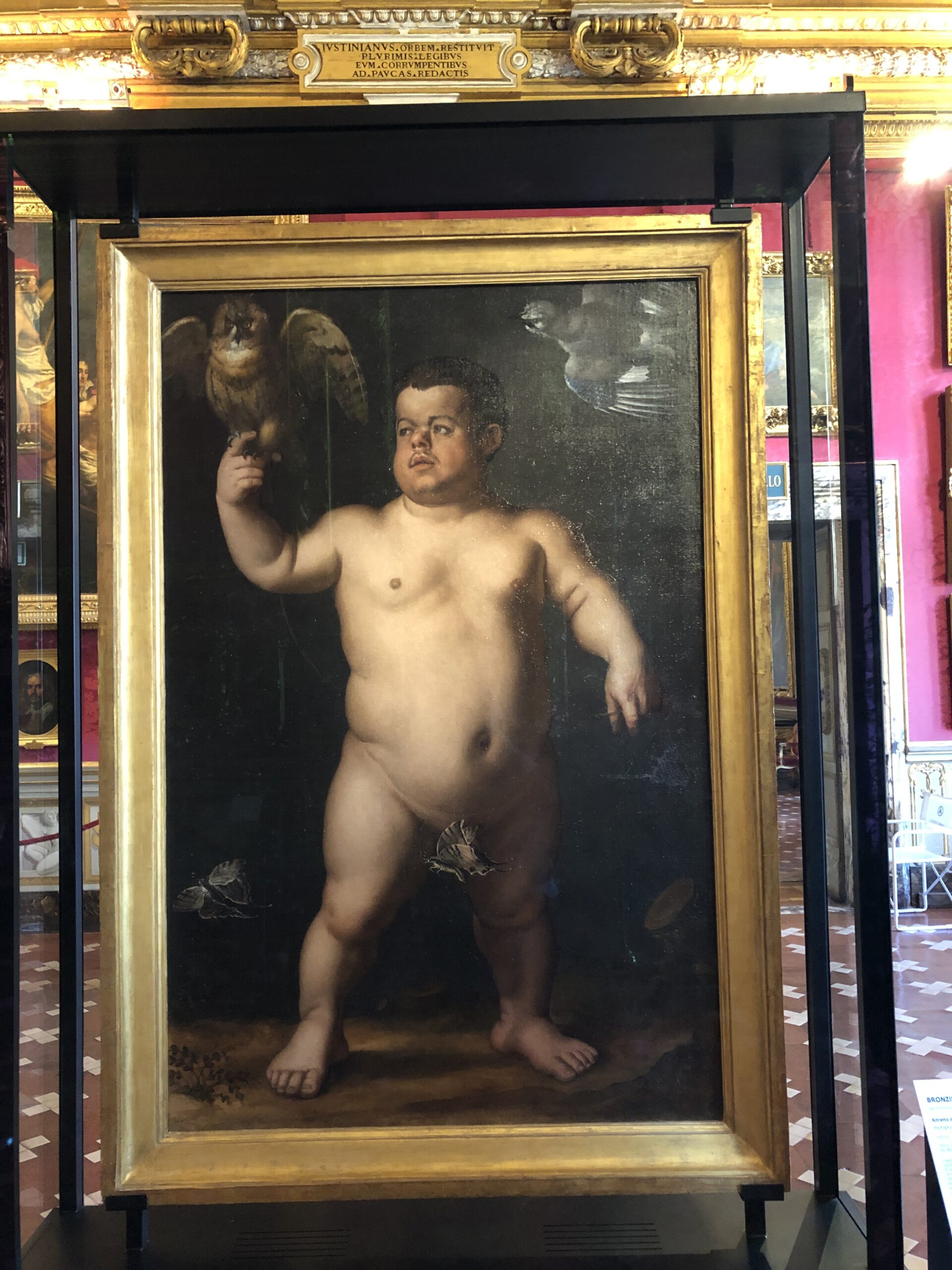 A metà percorso trovo lui, con l’uccello davanti l’uccello. Di per sé fa già sorridere così ma…ci giro intorno e vedo che il Bronzino si è preoccupato di ritrarre anche il lato b del nano Morgante. La cosa mi fa sbottare in una risata che trascina tutti i presenti in sala. Una delle opere più singolari ed eccentriche mai viste. Ammetto che non ne conoscevo l’esistenza.