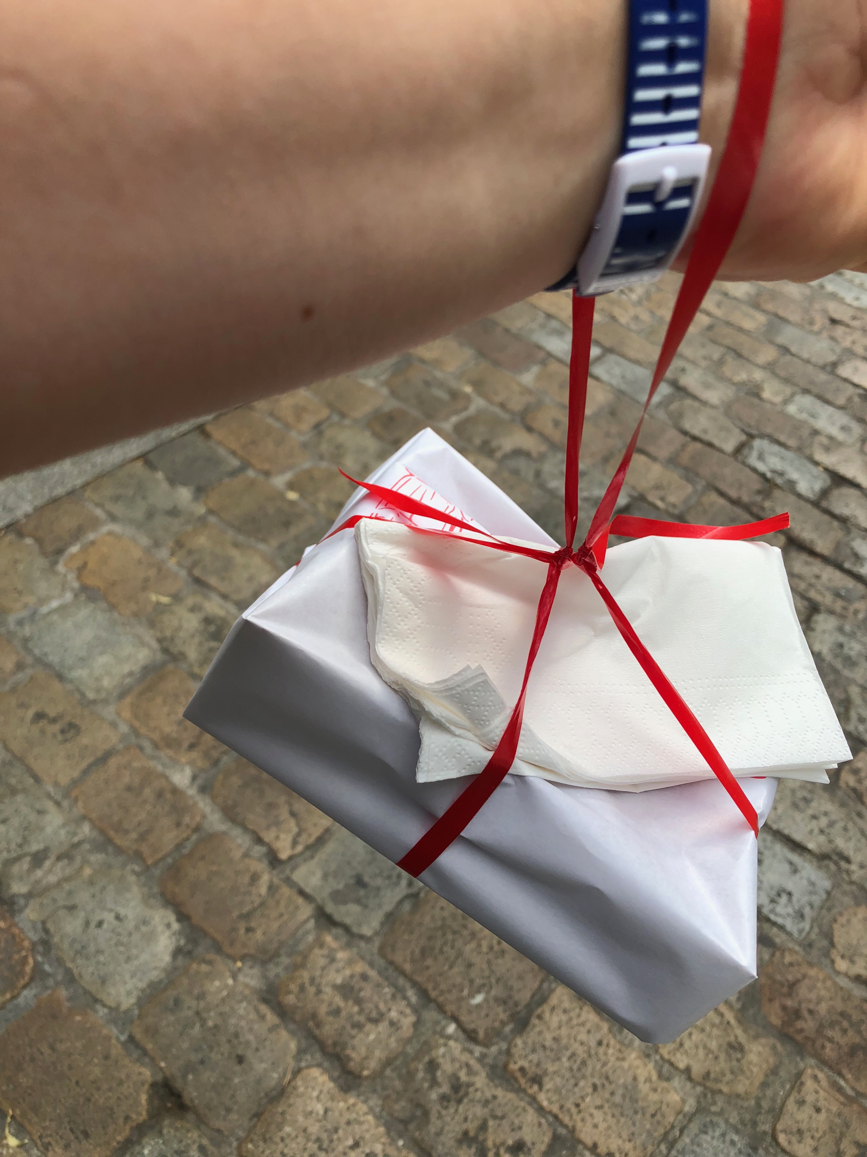 Spero di aver contemplato il cielo azzurro a sufficienza, torno a guardar la terra e respiro profondamente questa aria fresca, sorrido alle aiuole in fiore e, con la coda dell’occhio scopro che qualcosa mi pende dal braccio. Oh Saint Honoré! ci sono cascata di nuovo!