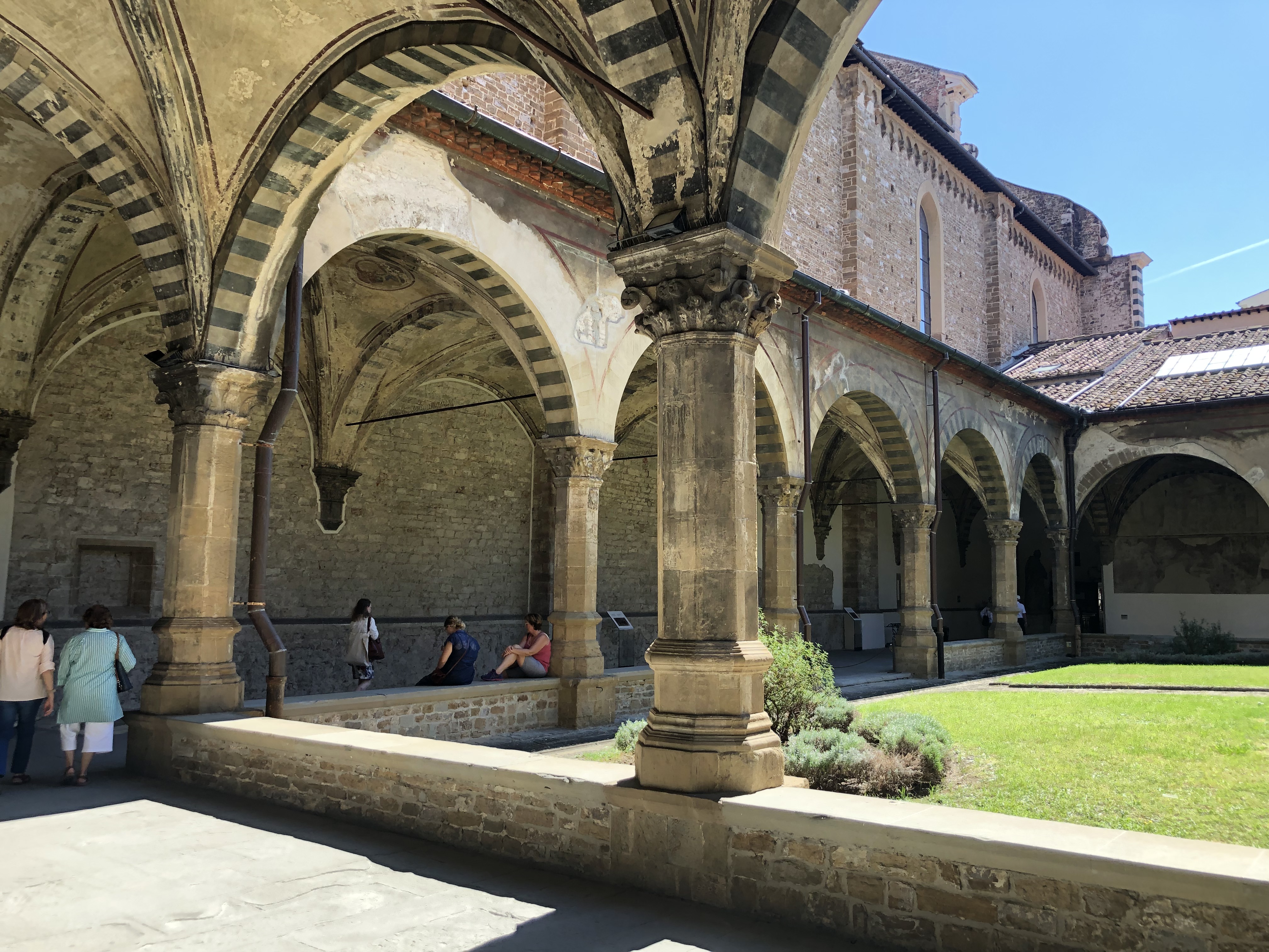 Troppi dati, troppe informazioni. Mi guardo in giro spaesata, non mi ricordo più nemmeno dove io mi trovi. Son troppo confusa, ringrazio e mi congedo guadagnando finalmente l’agognato chiostro. Penso di essere stata troppo brusca e allora mi giro per sorridere a quel Cicerone ma, ha già preso sottobraccio altri due turisti.