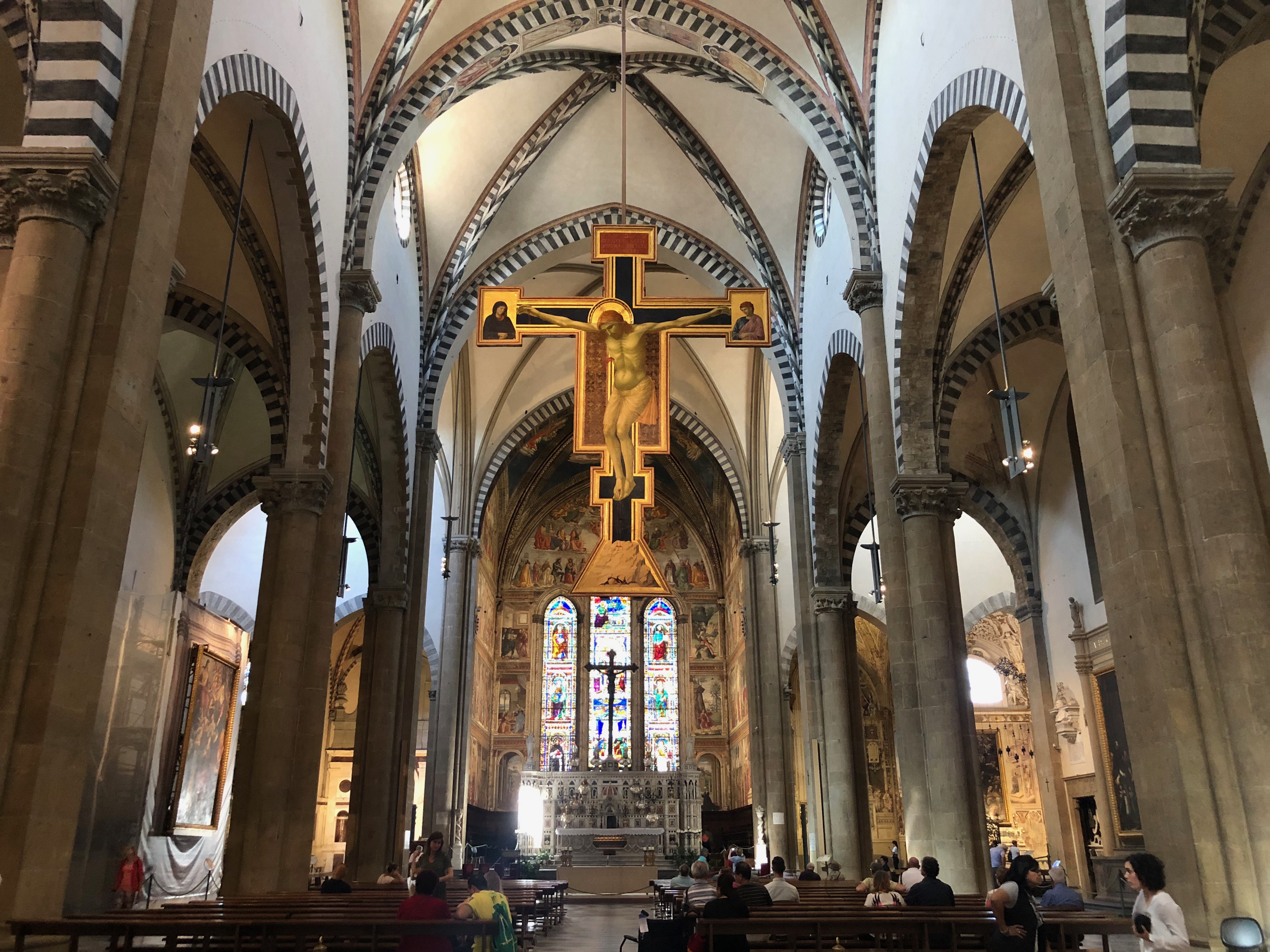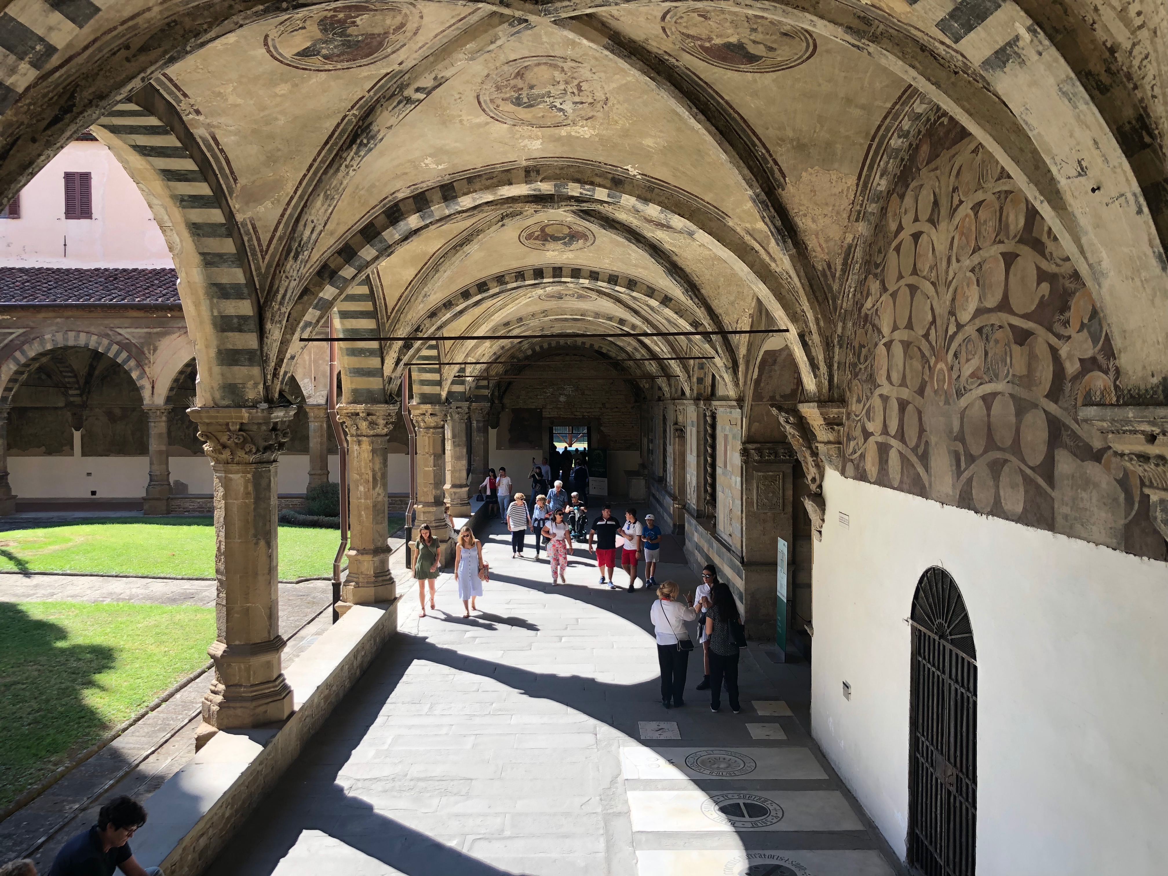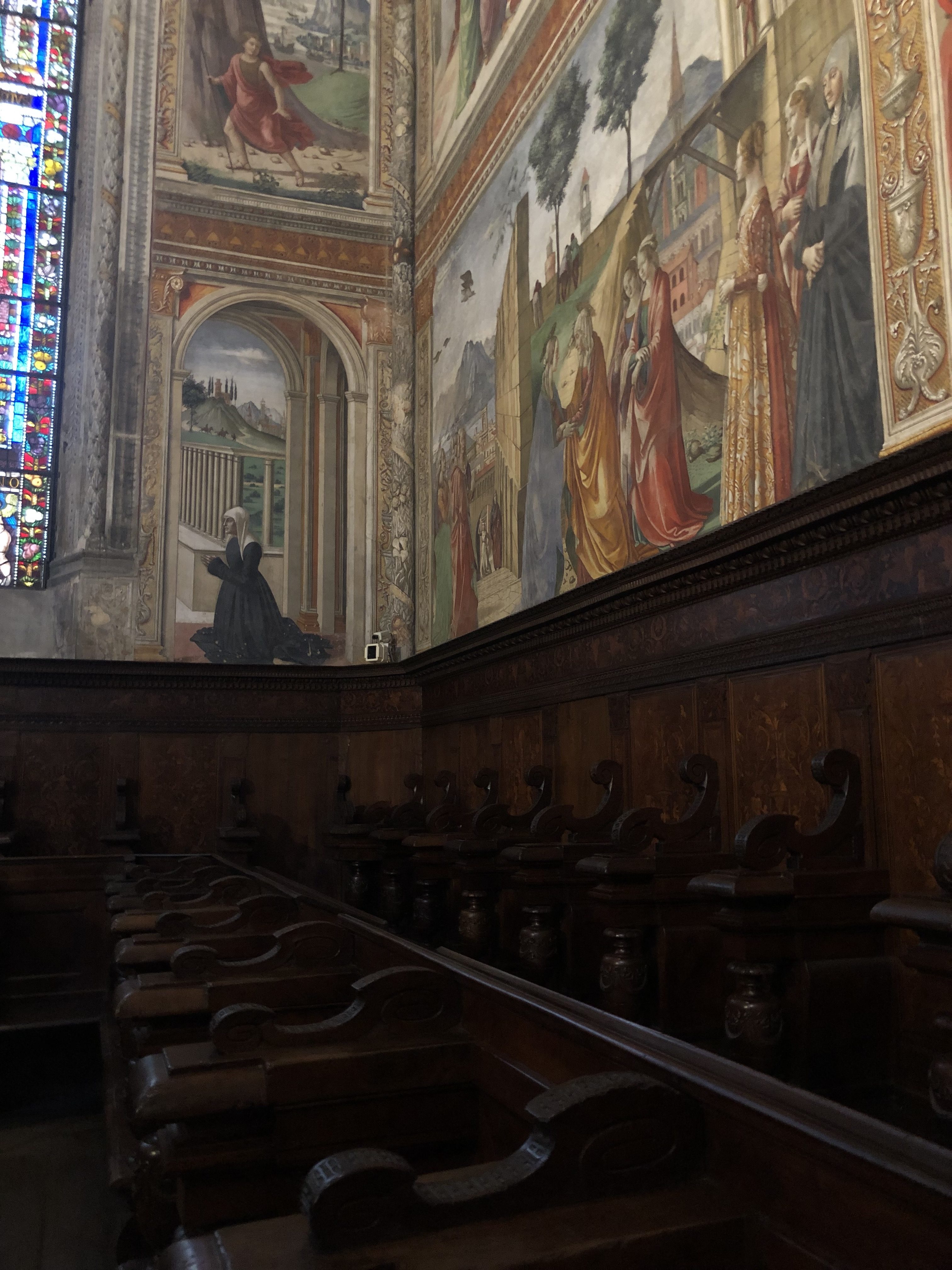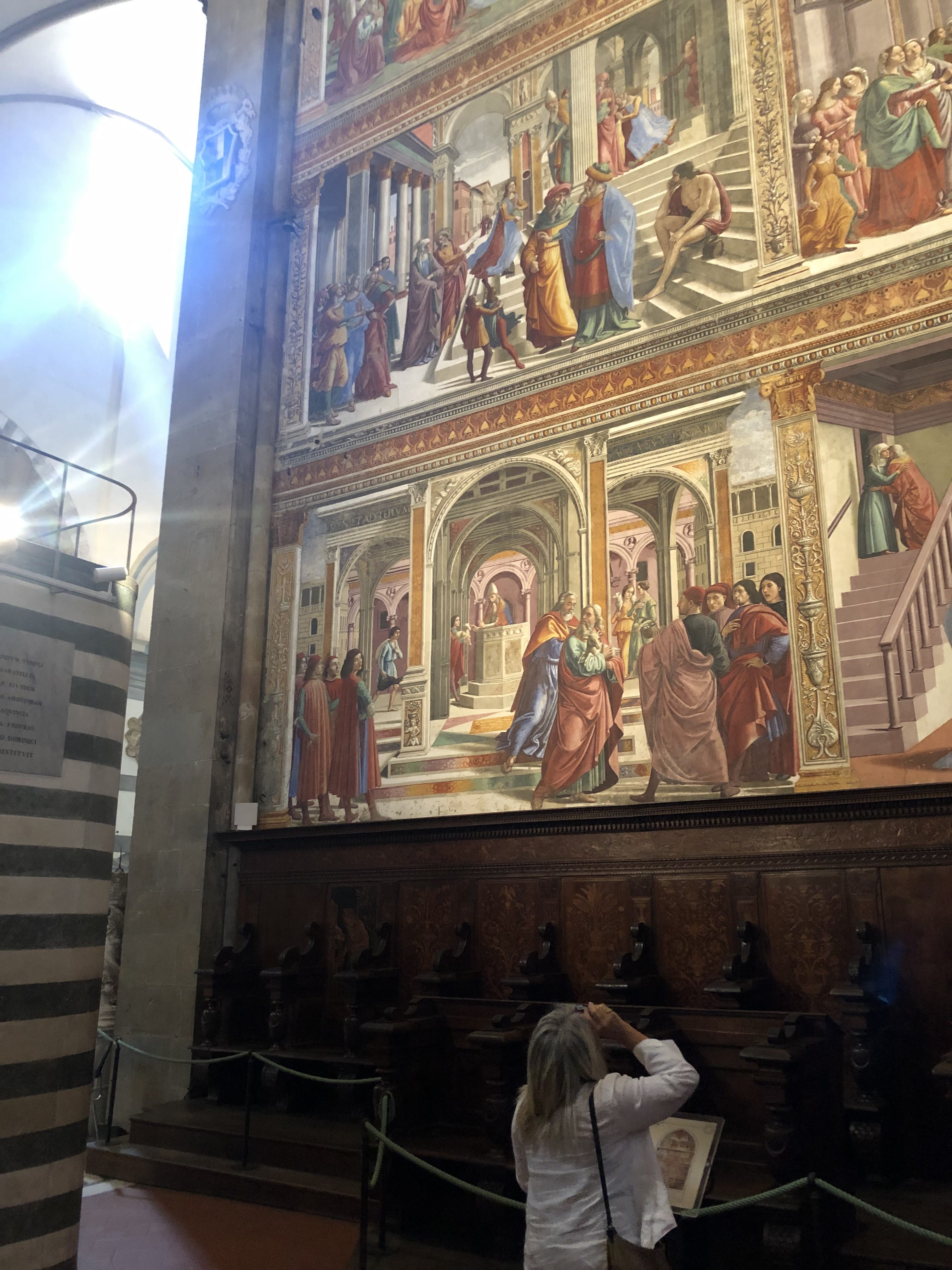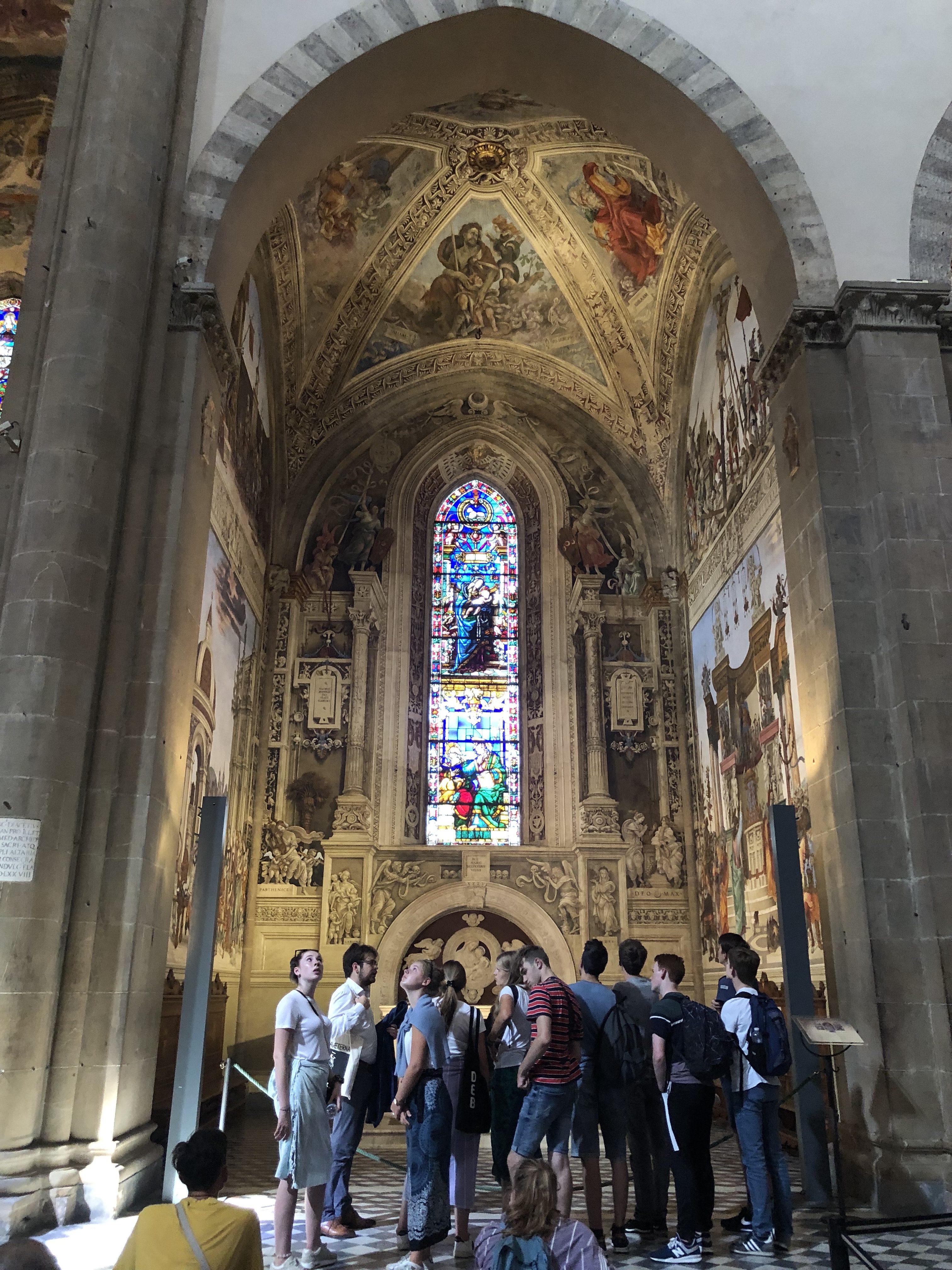 Nella cappella Tornabuoni ci sono gli affreschi del Ghirlandaio che, oltre ad ambientare le scene tra Roma e Firenze in epoca rinascimentale invece che in Terra Santa, dipinge l’episodio della morte degli innocenti in maniera truculenta, con teste di neonati che rotolano a terra. Guardo tutto con un lieve disgusto e penso che nemmeno la squadra di CSI, Monk, e tutto il Distretto di Brooklyn 99 ci avrebbero capito una mazza in tutta quella confusione.