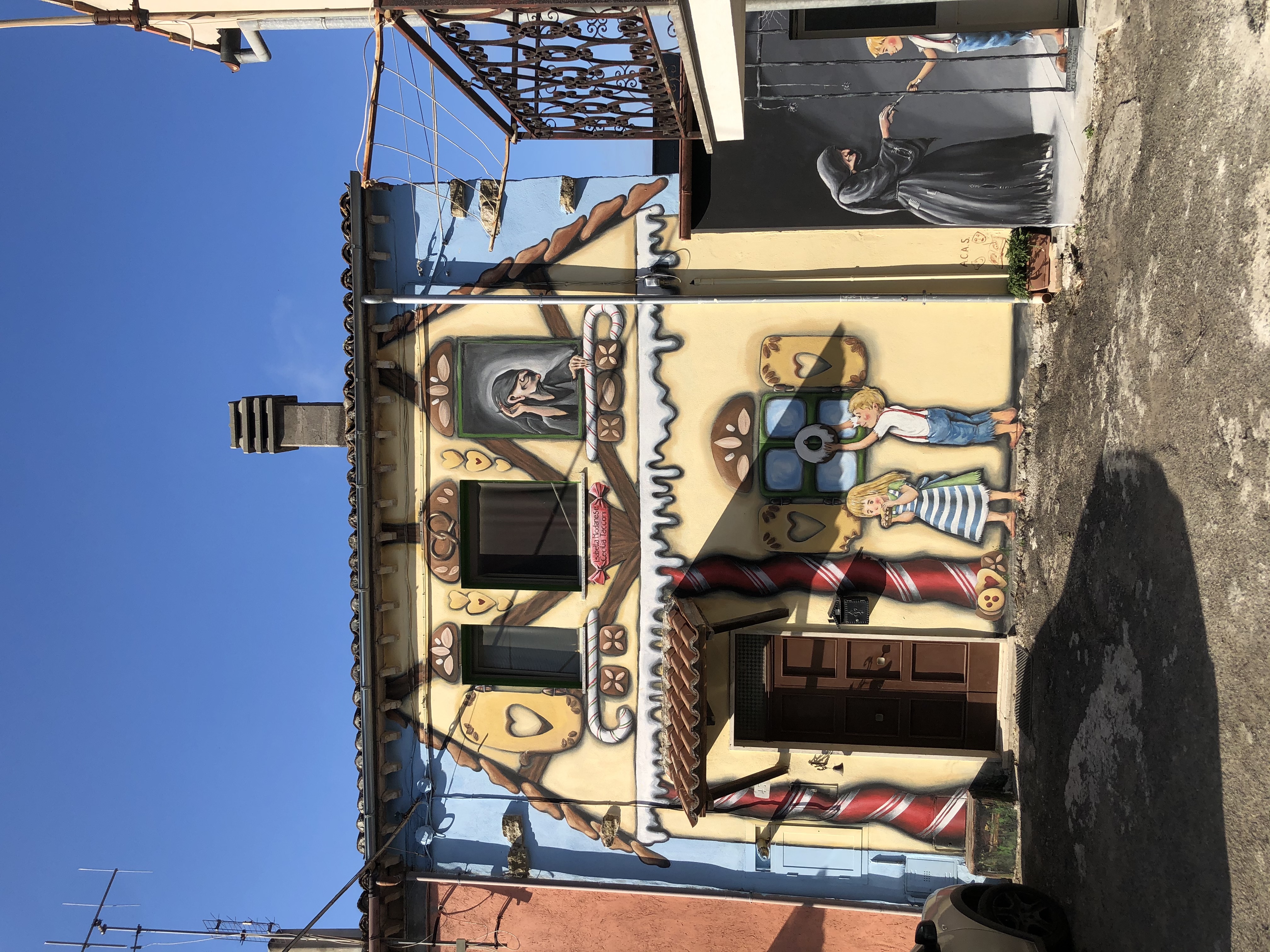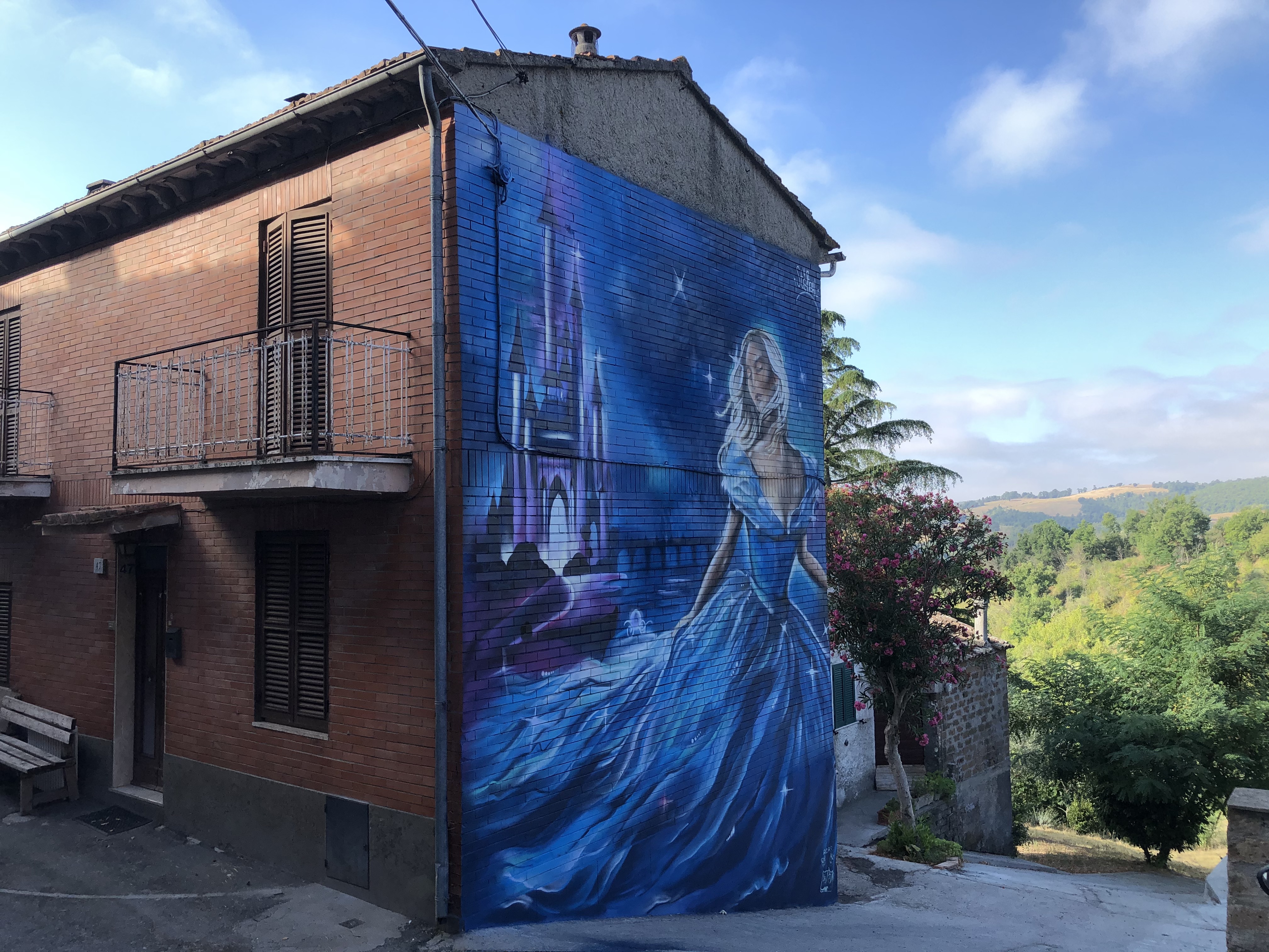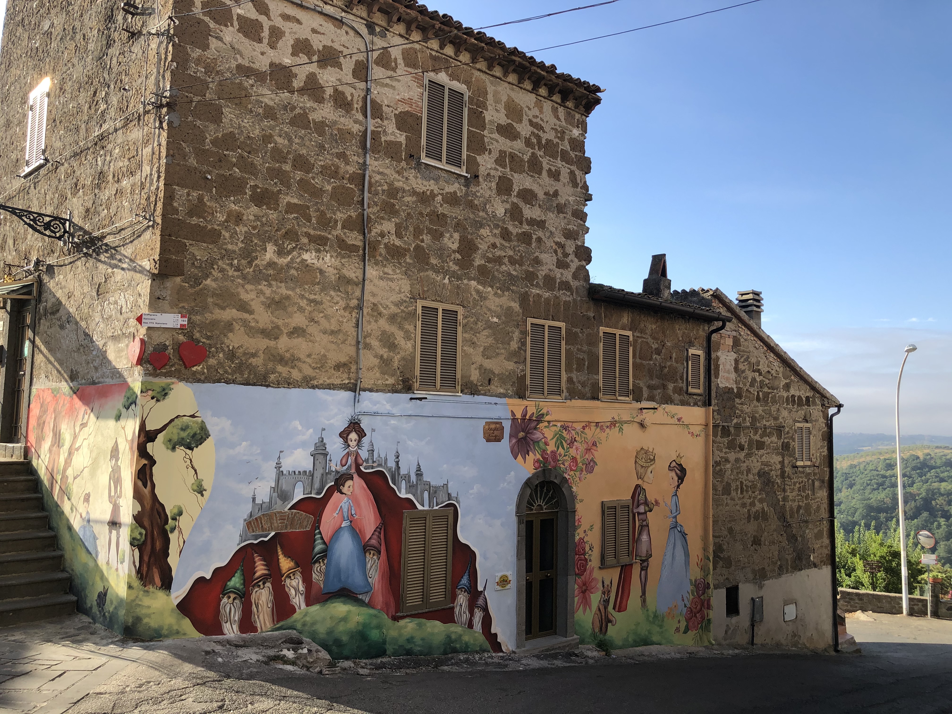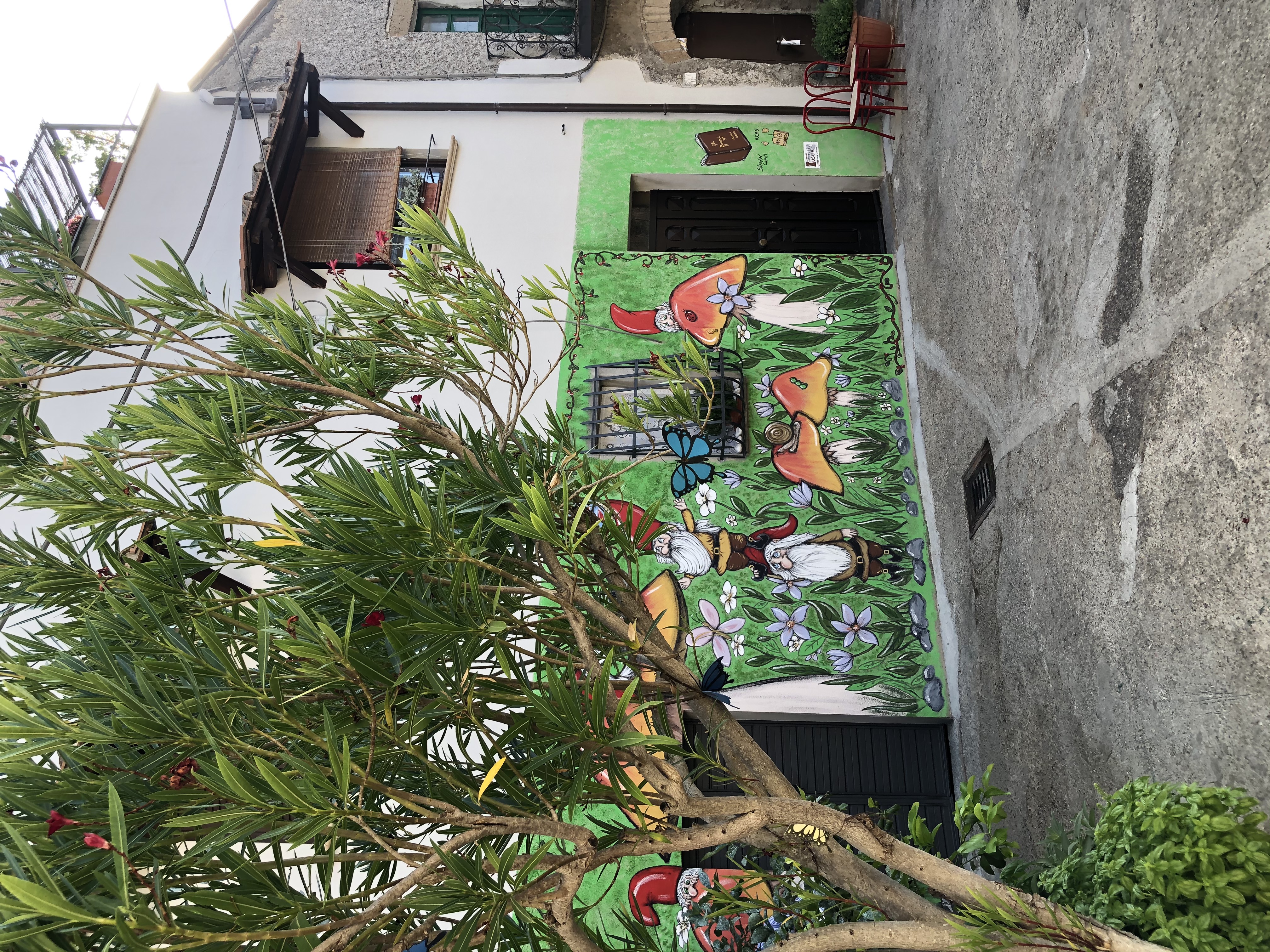 Ricordo Juzcar in Spagna, lì hanno dipinto le case di blu per trasformare la piccola città sull’orlo dell’abbandono e dell’oblio, nel primo e unico paese al mondo dedicato ai Puffi. Qui l’estro italiano si è fatto riconoscere e, seppur l’iniziativa appaia ai miei occhi pressoché simile per intenti e realizzazione, l’idea di rappresentare tutti i personaggi delle favole è molto carina e merita un plauso. Passeggiando lungo il percorso segnalato si riscoprono storie che erano finite in un cassetto in fondo alla memoria. “Come diamine si chiamava l’orso del libro della giungla?” “Come si chiamava il bambino de la spada nella roccia? E perchè non hanno dipinto anche Anacleto? Porca miseria come ci si può scordare di Anacleto e la sua risata isterica!”