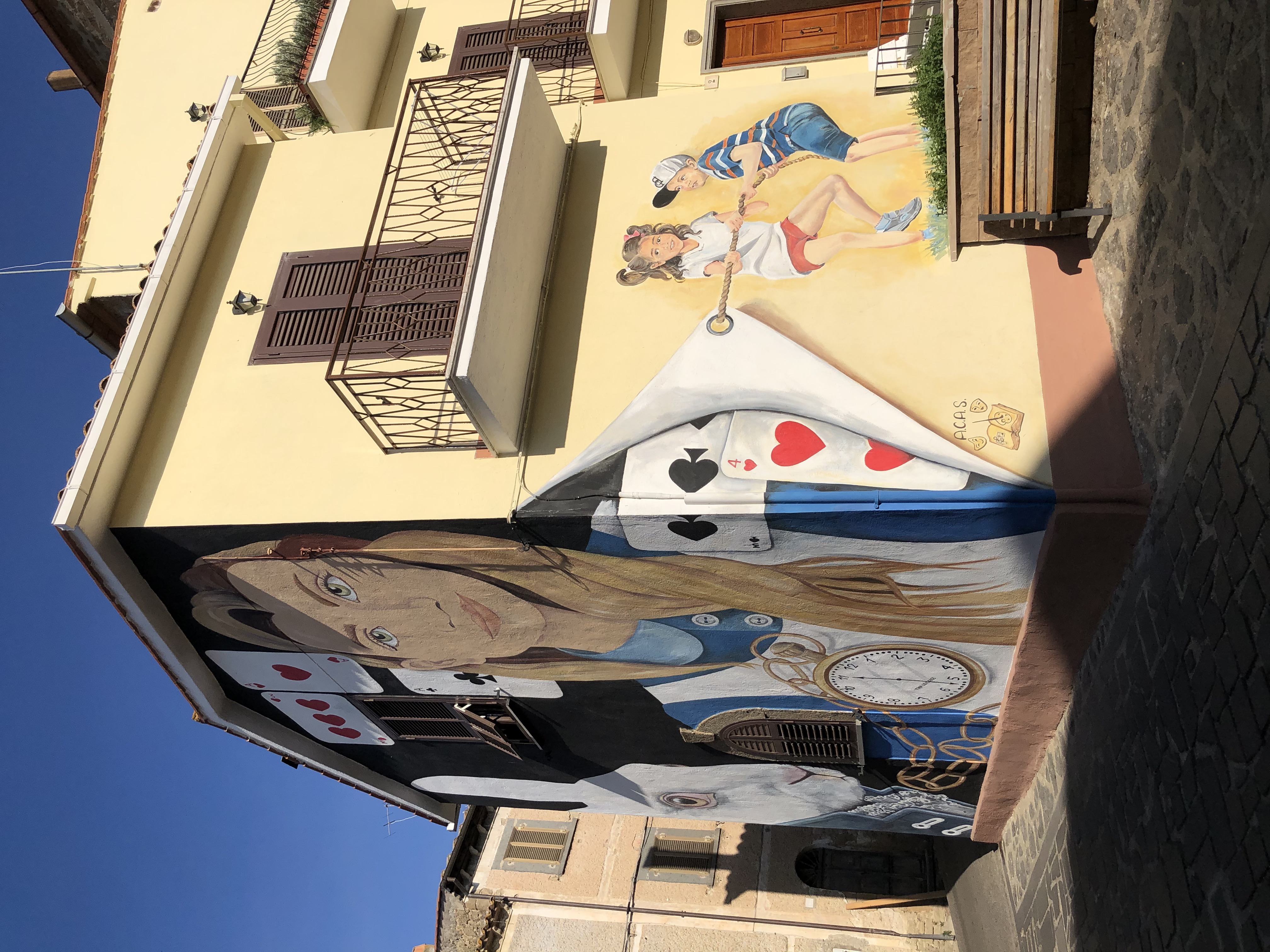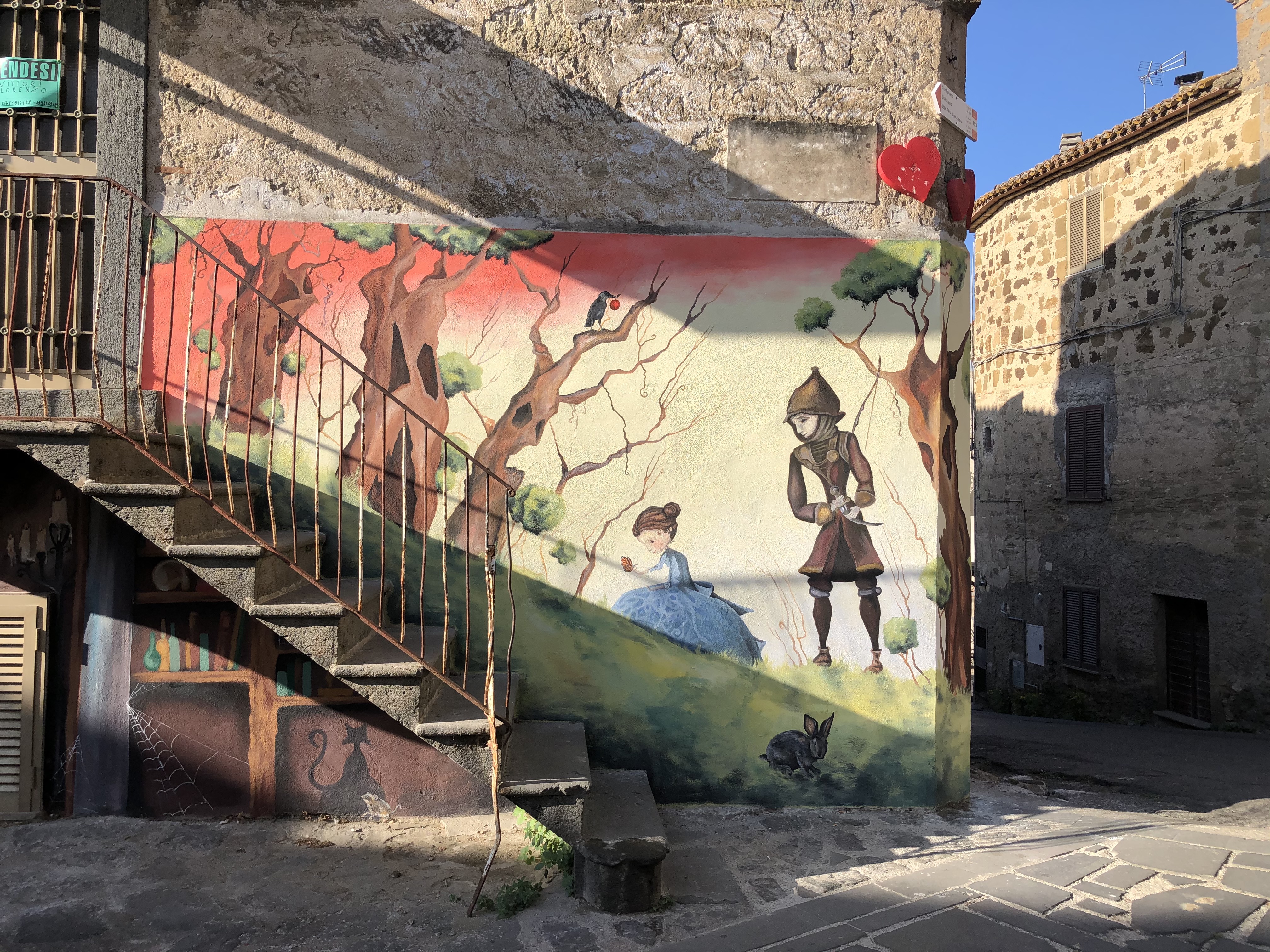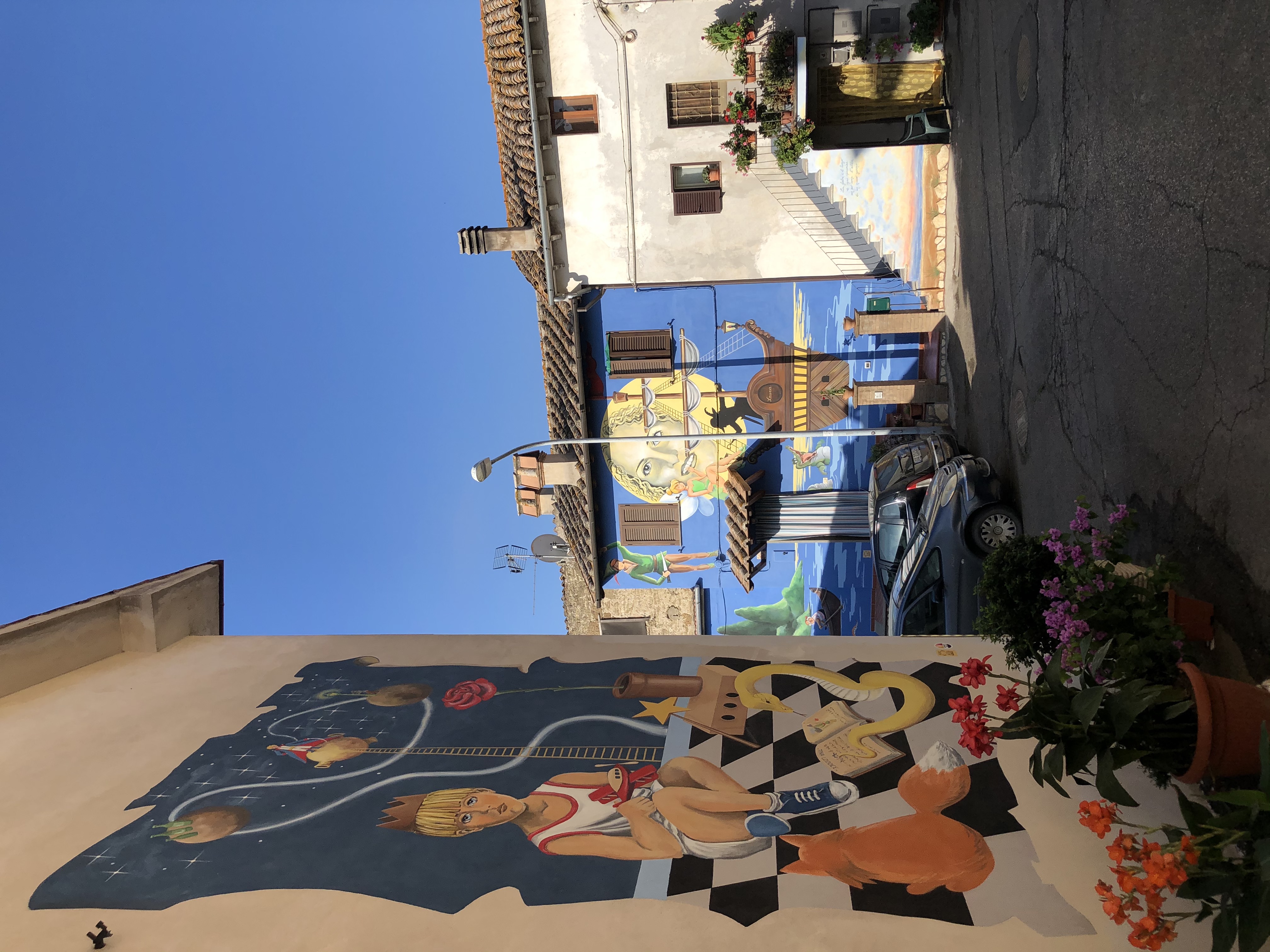 Ricordo Juzcar in Spagna, lì hanno dipinto le case di blu per trasformare la piccola città sull’orlo dell’abbandono e dell’oblio, nel primo e unico paese al mondo dedicato ai Puffi. Qui l’estro italiano si è fatto riconoscere e, seppur l’iniziativa appaia ai miei occhi pressoché simile per intenti e realizzazione, l’idea di rappresentare tutti i personaggi delle favole è molto carina e merita un plauso. Passeggiando lungo il percorso segnalato si riscoprono storie che erano finite in un cassetto in fondo alla memoria. “Come diamine si chiamava l’orso del libro della giungla?” “Come si chiamava il bambino de la spada nella roccia? E perchè non hanno dipinto anche Anacleto? Porca miseria come ci si può scordare di Anacleto e la sua risata isterica!”