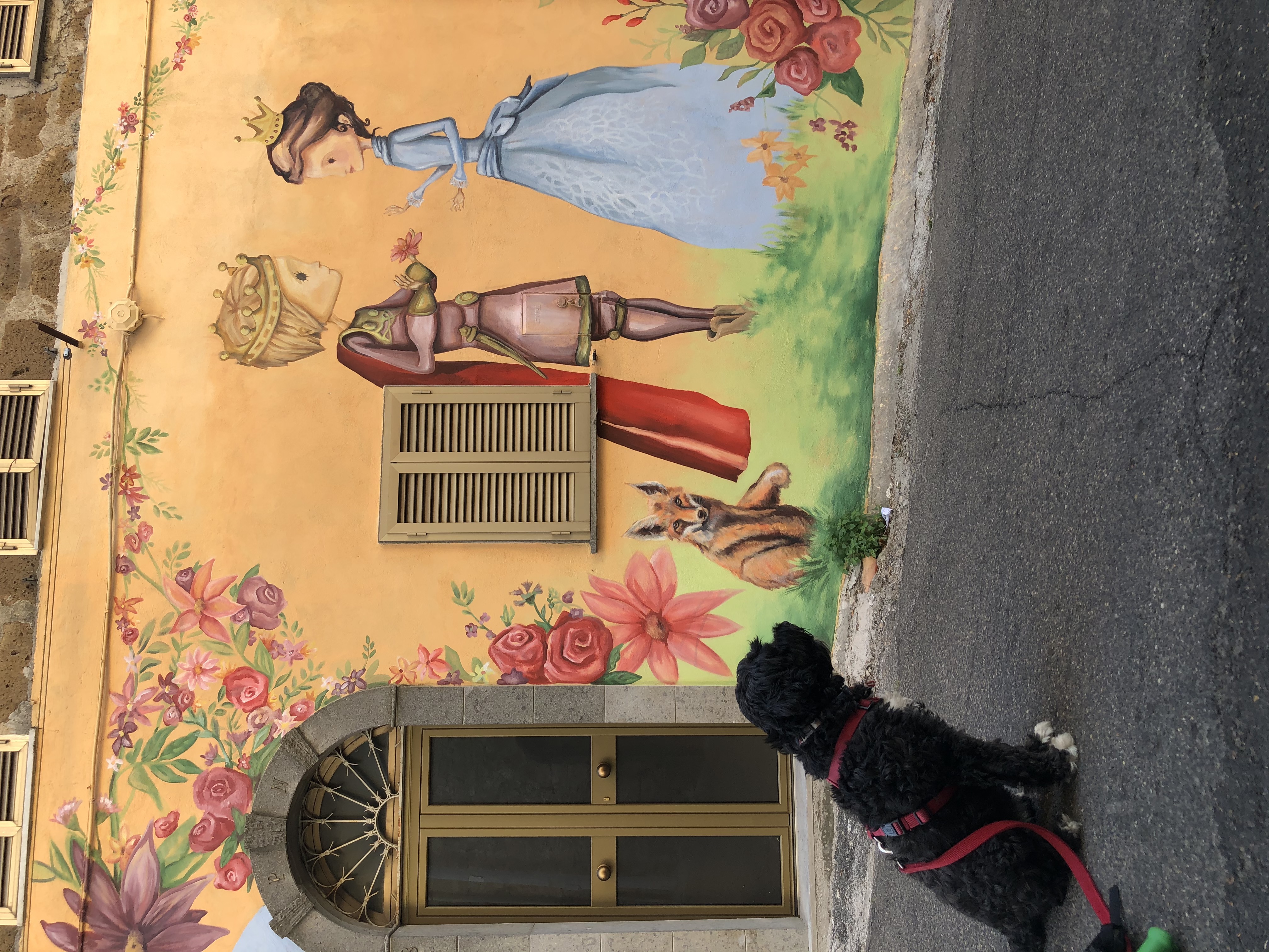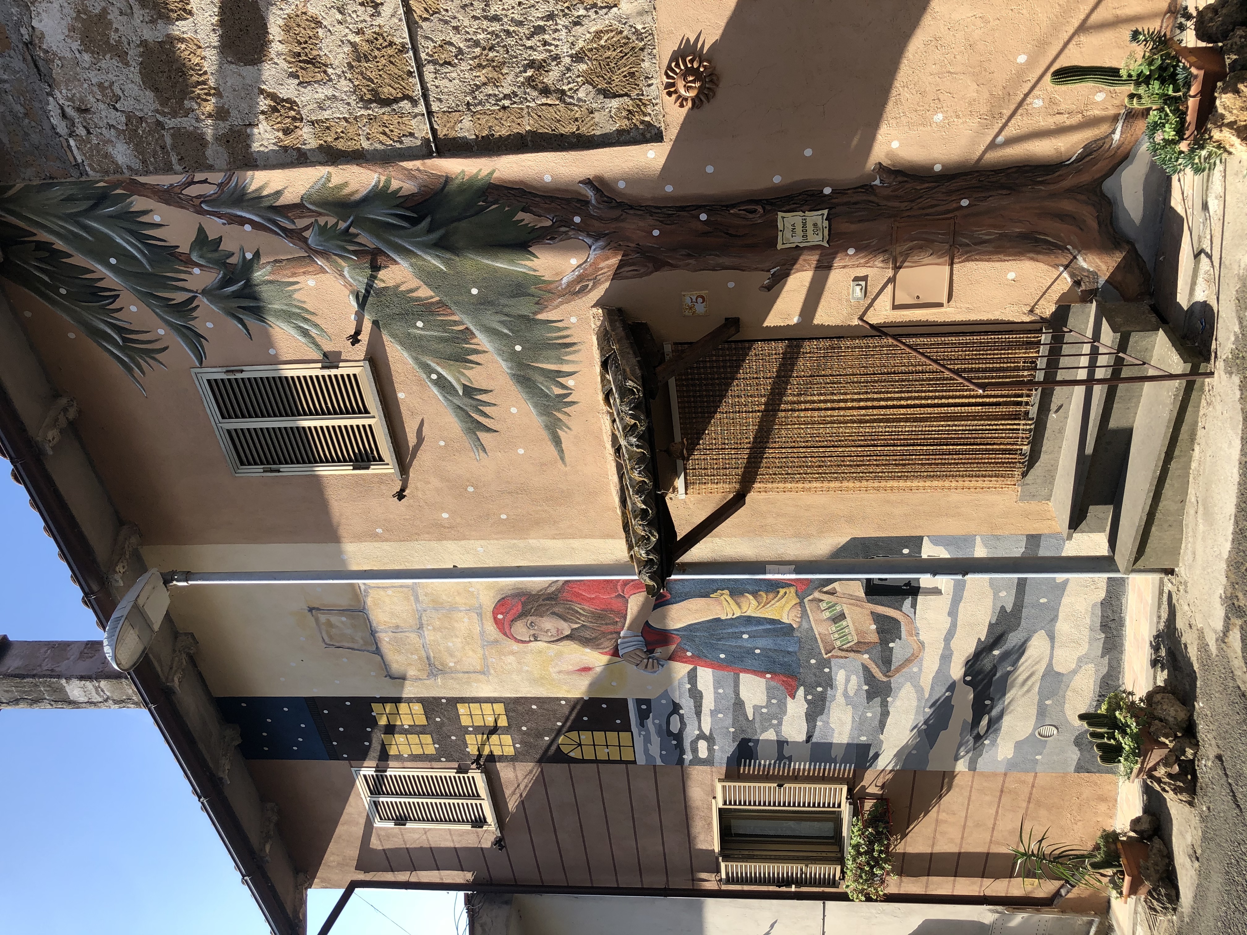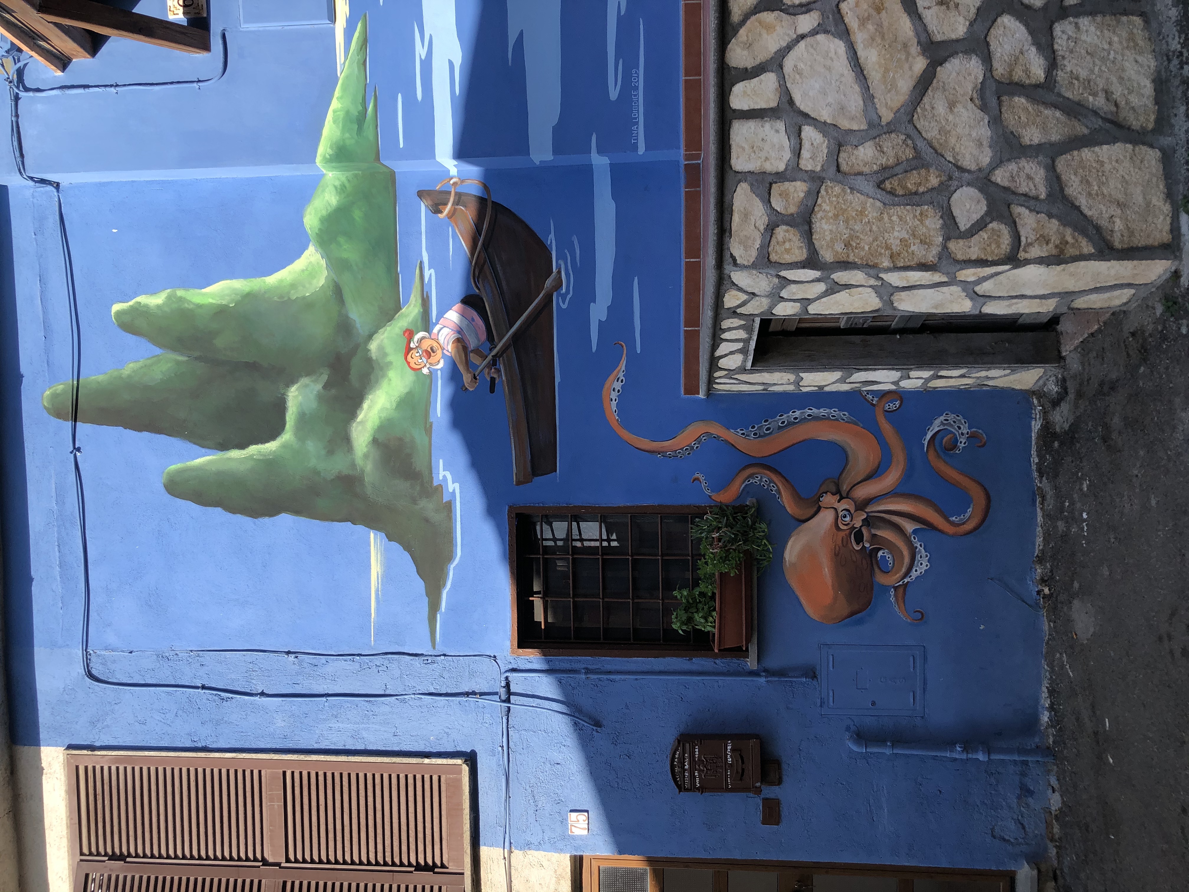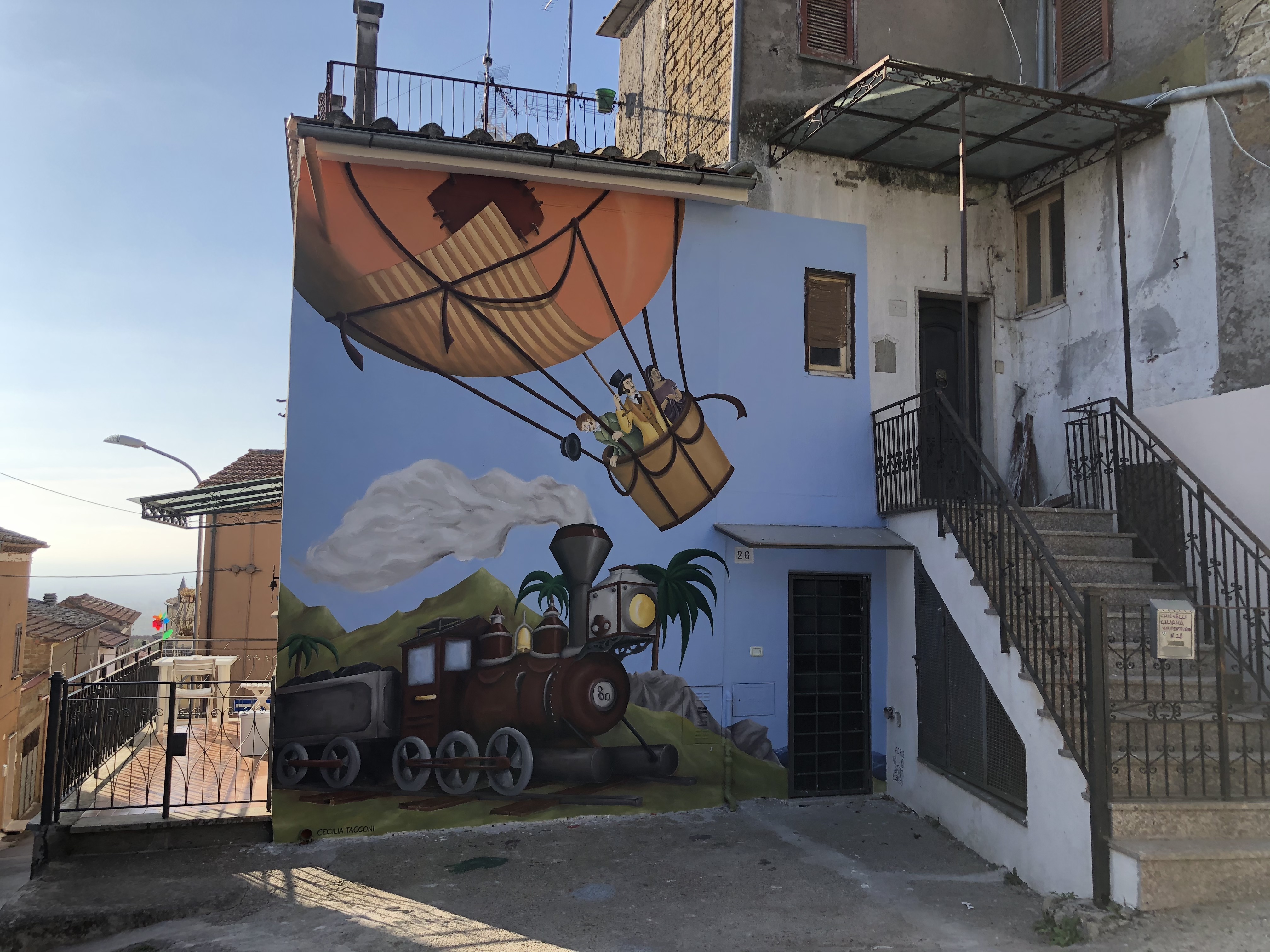Ricordo Juzcar in Spagna, lì hanno dipinto le case di blu per trasformare la piccola città sull’orlo dell’abbandono e dell’oblio, nel primo e unico paese al mondo dedicato ai Puffi. Qui l’estro italiano si è fatto riconoscere e, seppur l’iniziativa appaia ai miei occhi pressoché simile per intenti e realizzazione, l’idea di rappresentare tutti i personaggi delle favole è molto carina e merita un plauso. Passeggiando lungo il percorso segnalato si riscoprono storie che erano finite in un cassetto in fondo alla memoria. “Come diamine si chiamava l’orso del libro della giungla?” “Come si chiamava il bambino de la spada nella roccia? E perchè non hanno dipinto anche Anacleto? Porca miseria come ci si può scordare di Anacleto e la sua risata isterica!”