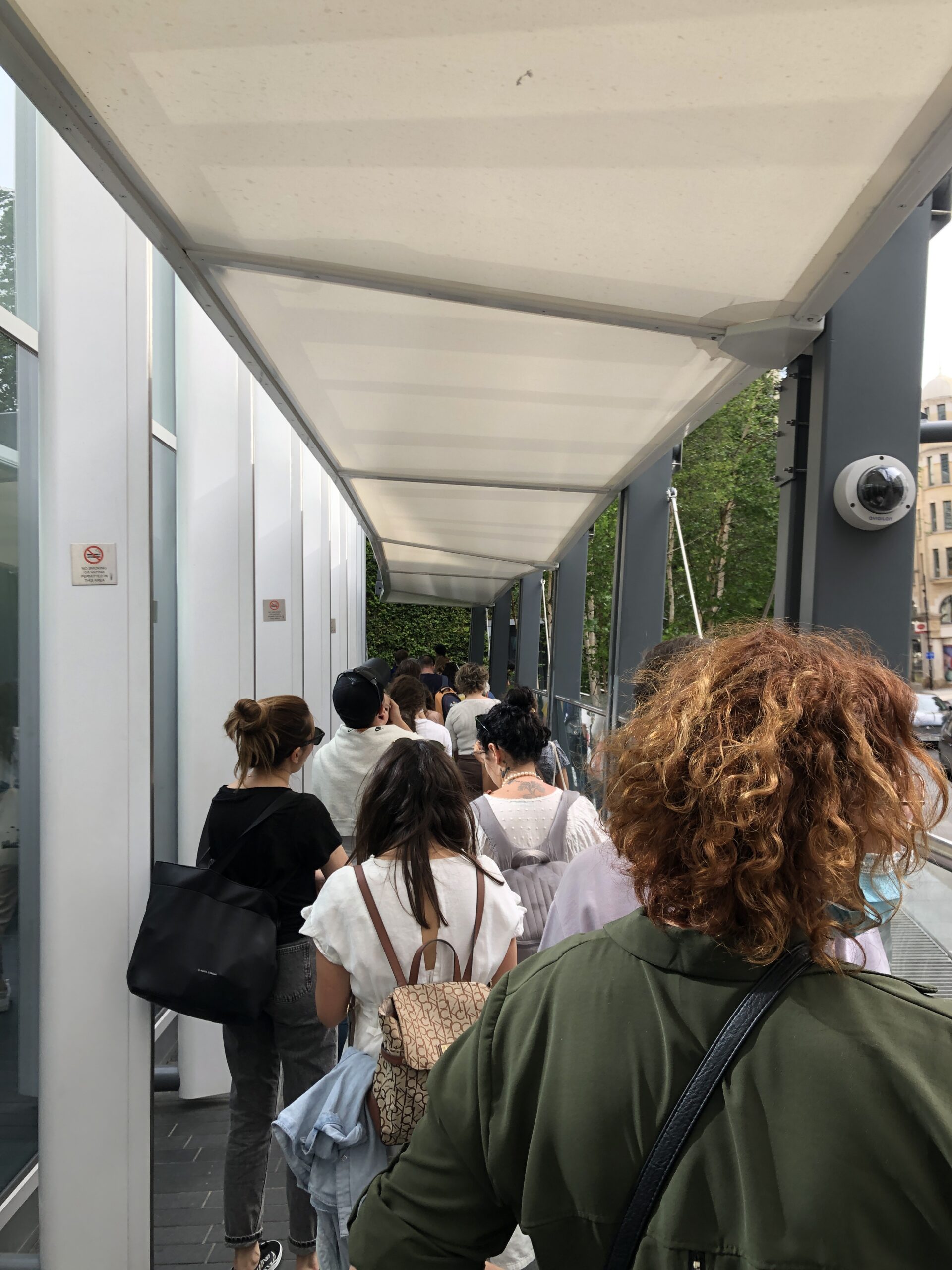 Faccio il check vescica ballonzolando un po’. ‘Mmm, mi sa che non riesco a reggerla per tutto questo tempo’, saranno almeno duecento le persone incolonnate lungo il fianco del grattacielo. Opto per la ricerca di un bagno. Poco distante un bar che fa spremute, centrifughe e frullati mi sembra il posto ideale.