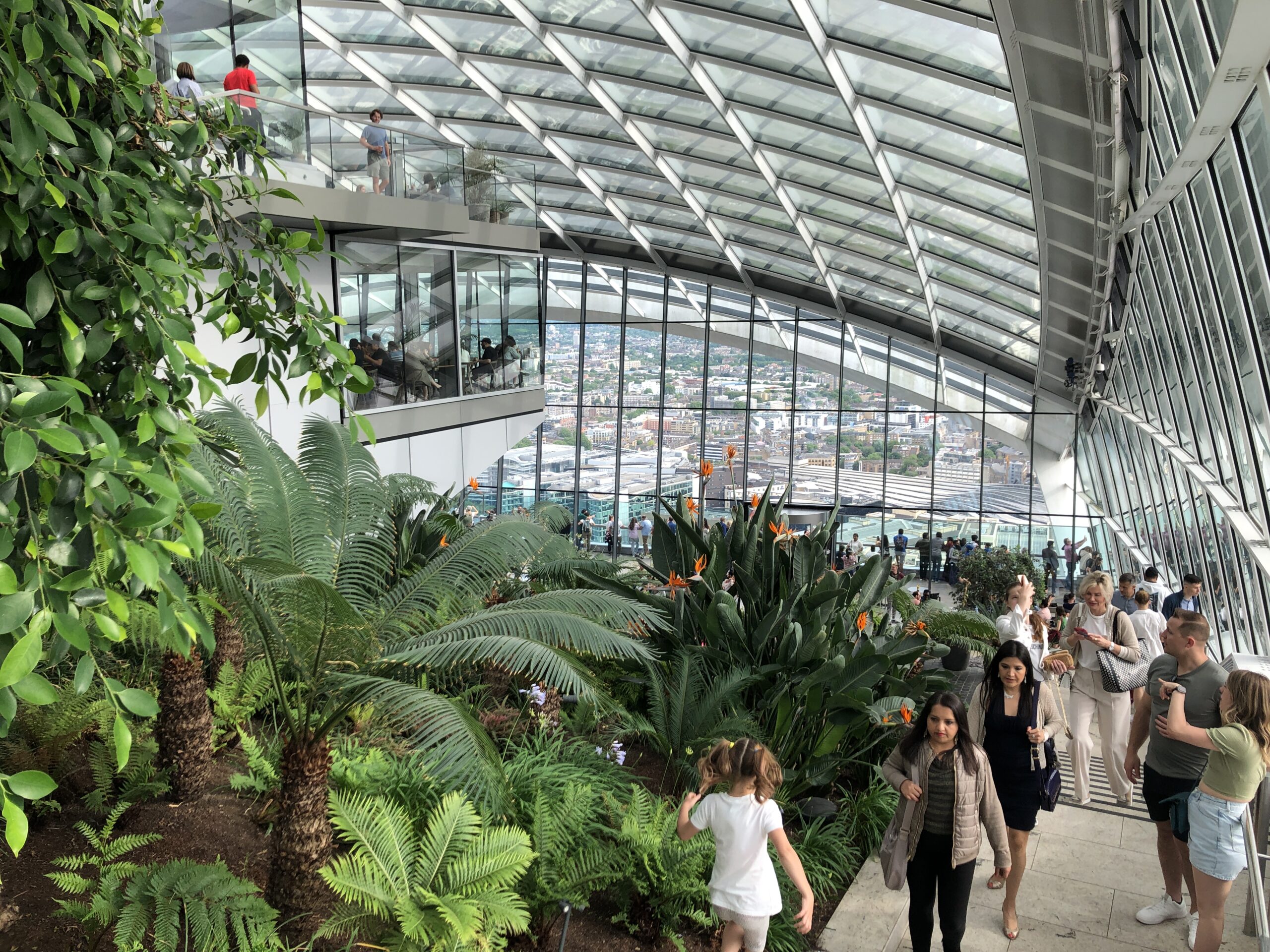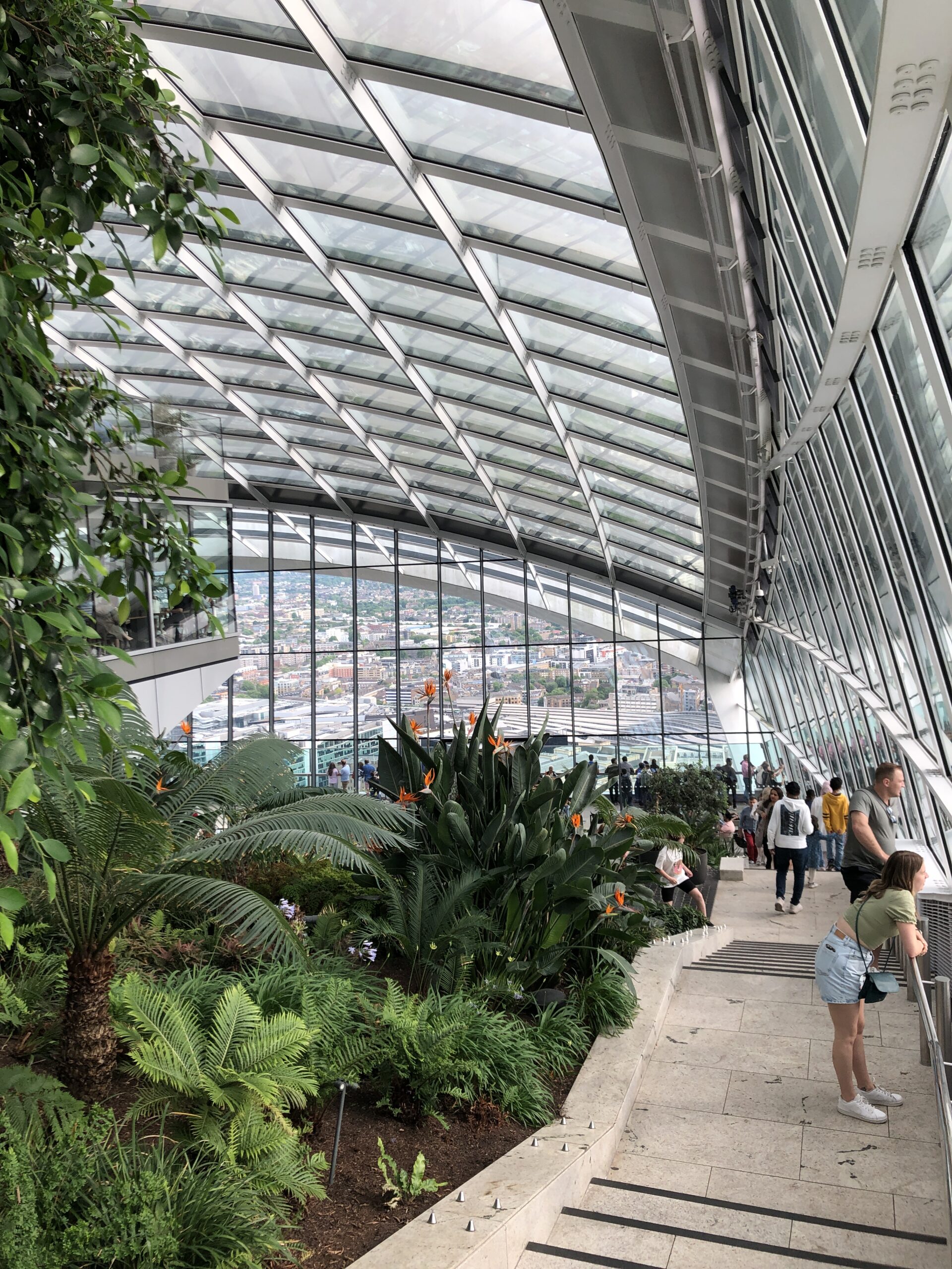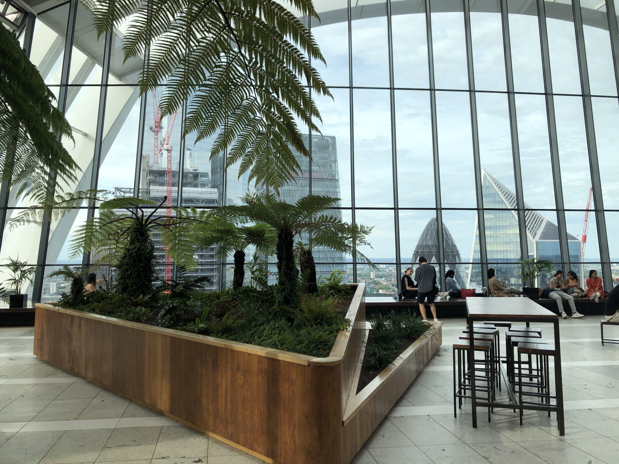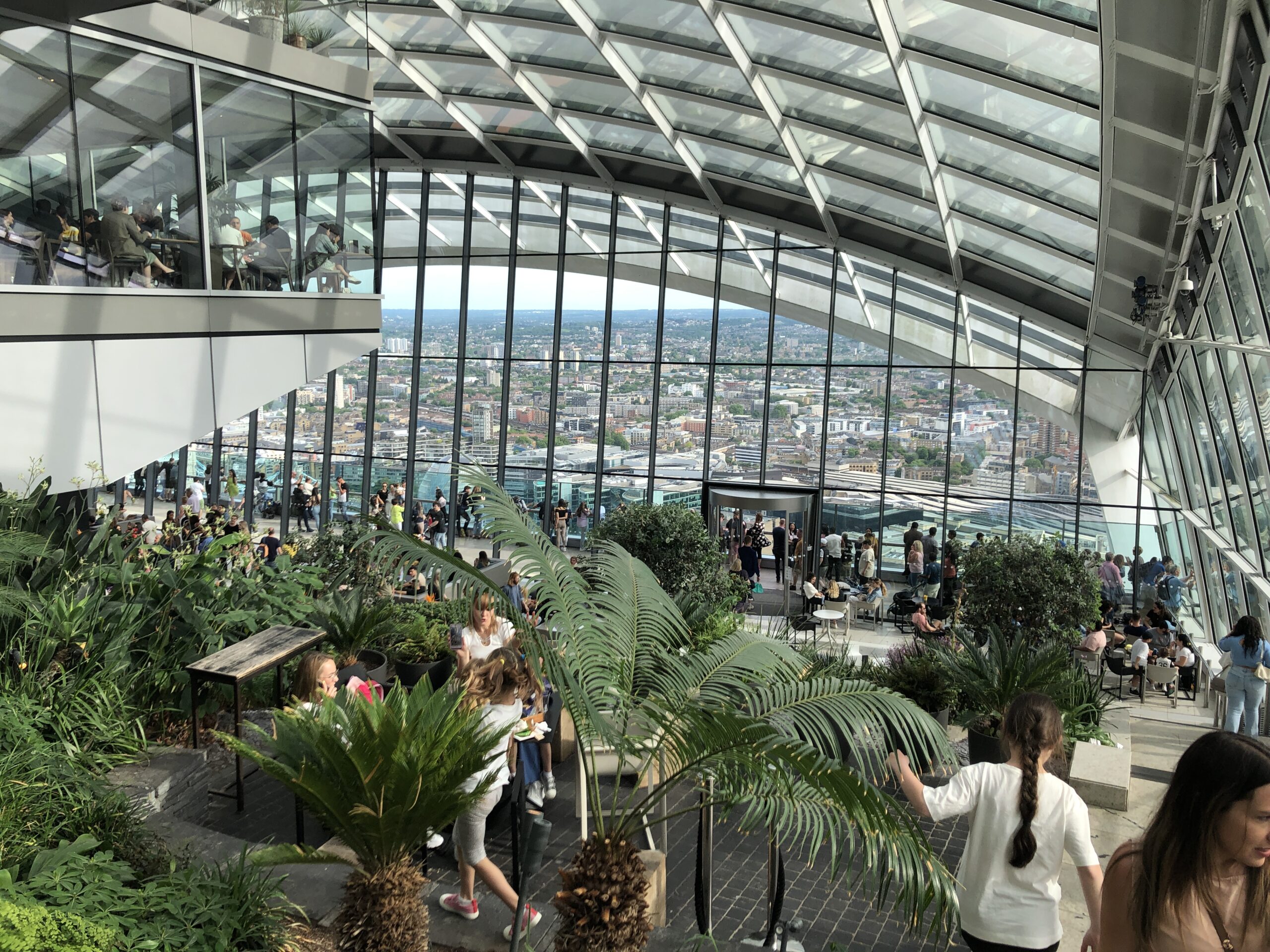 La vista da quassù è pazzesca. Ci sono vetrate enormi, piante di tutti i tipi, tavolini, lunghi banconi bar e, fortunatamente, anche i bagni.