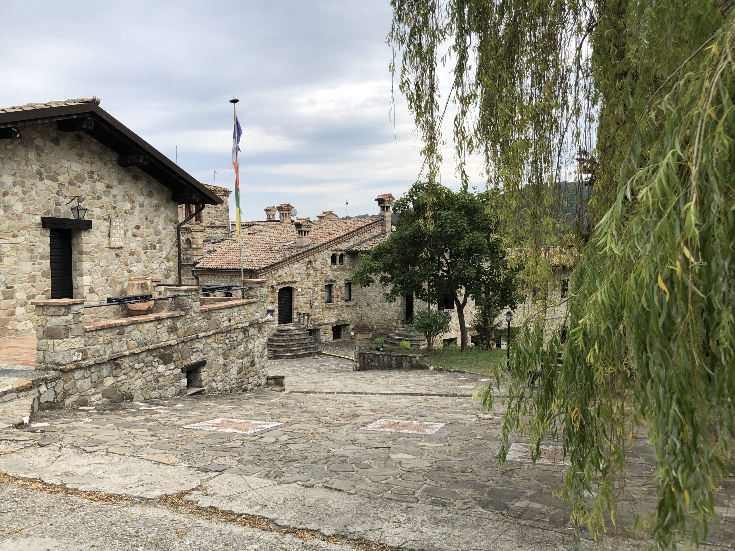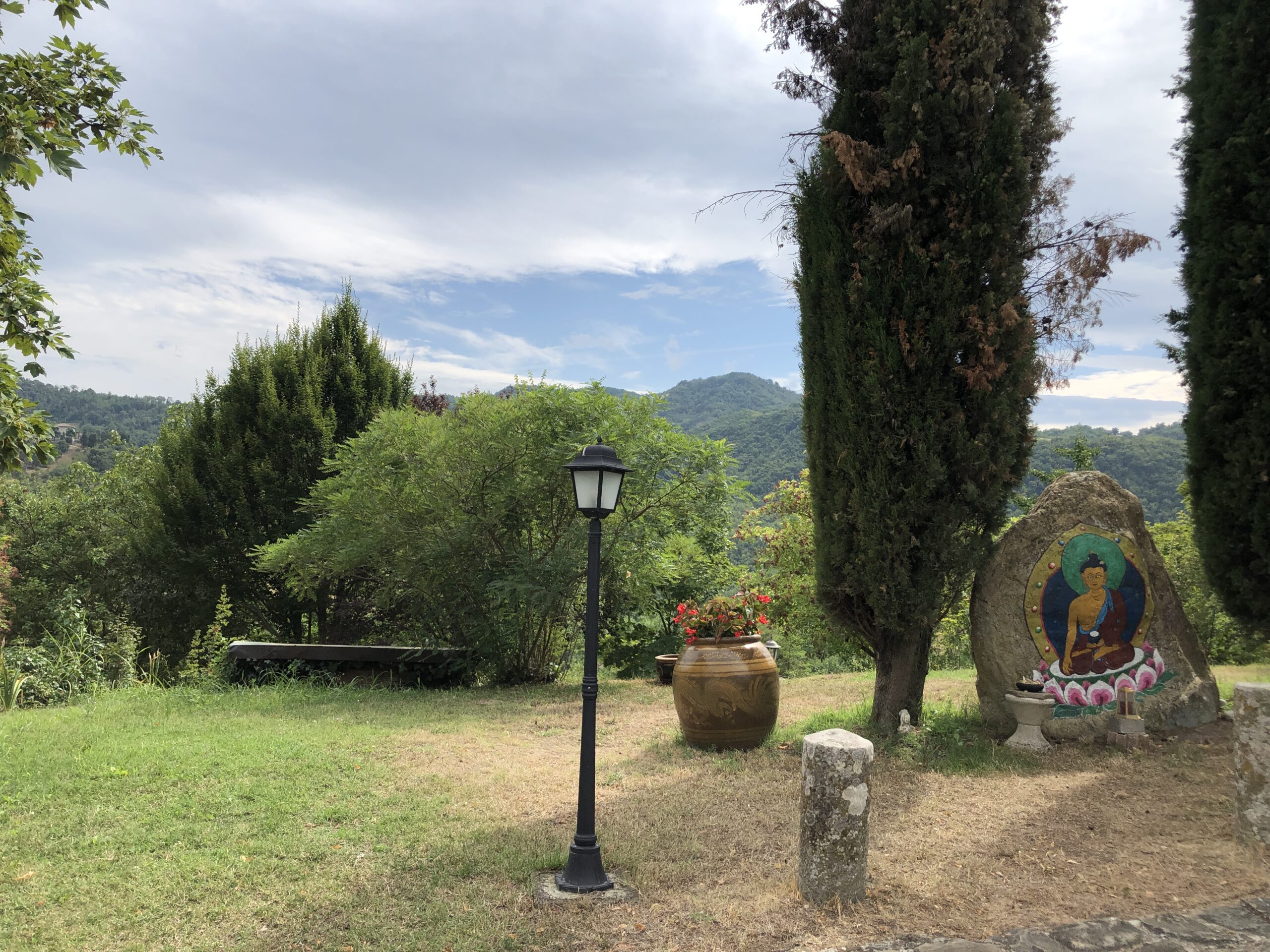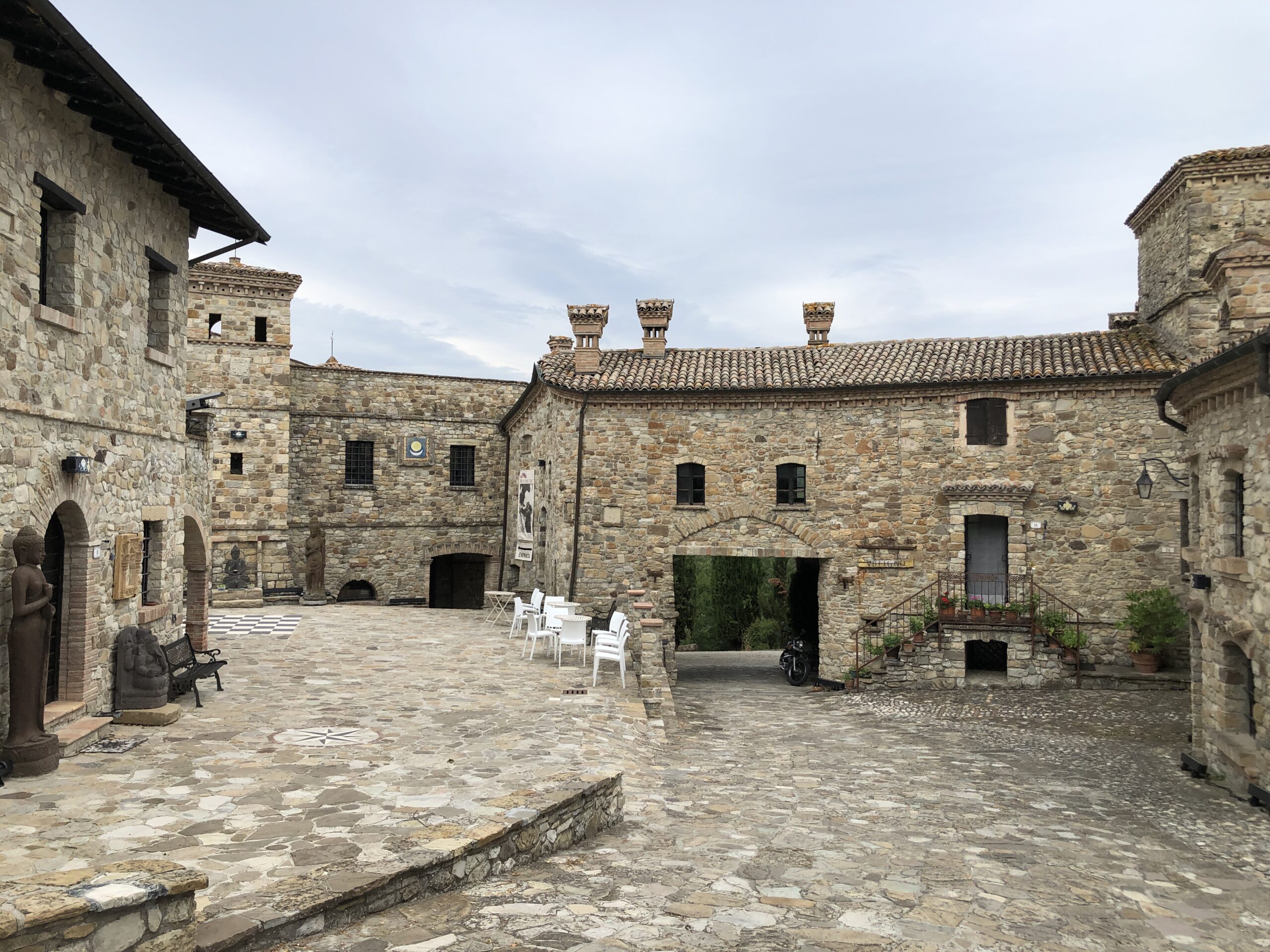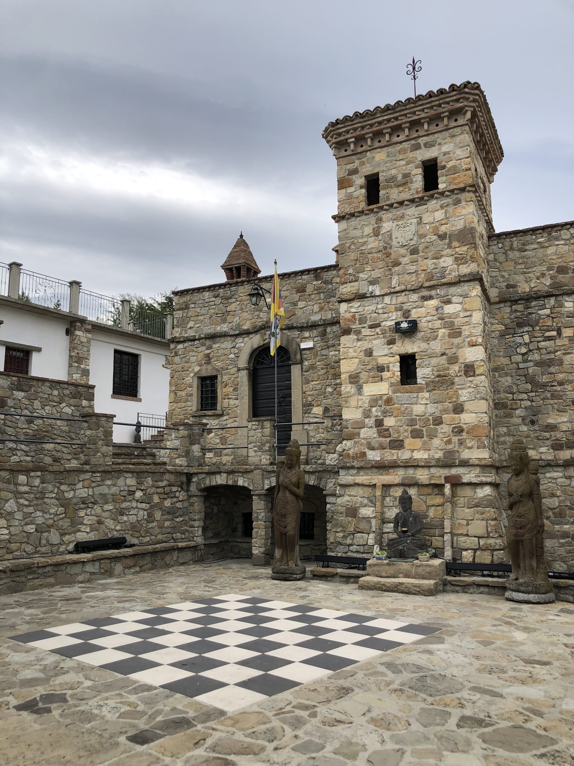 Sono da sola in questa intima piazza dal sapore rustico (nonostante la grande scacchiera a terra). Probabilmente in Tibet ci sarà lo stesso dolce silenzio, gli stessi disegni sacri dai colori accesi, la stessa cura meticolosa per la natura circostante.