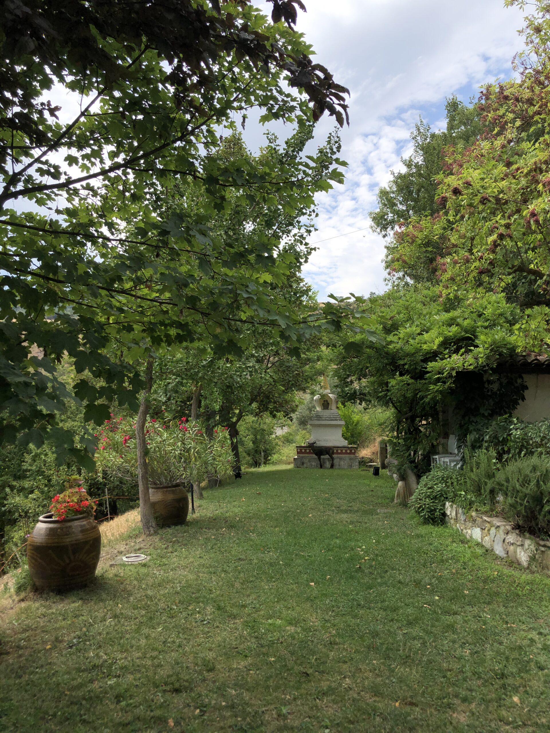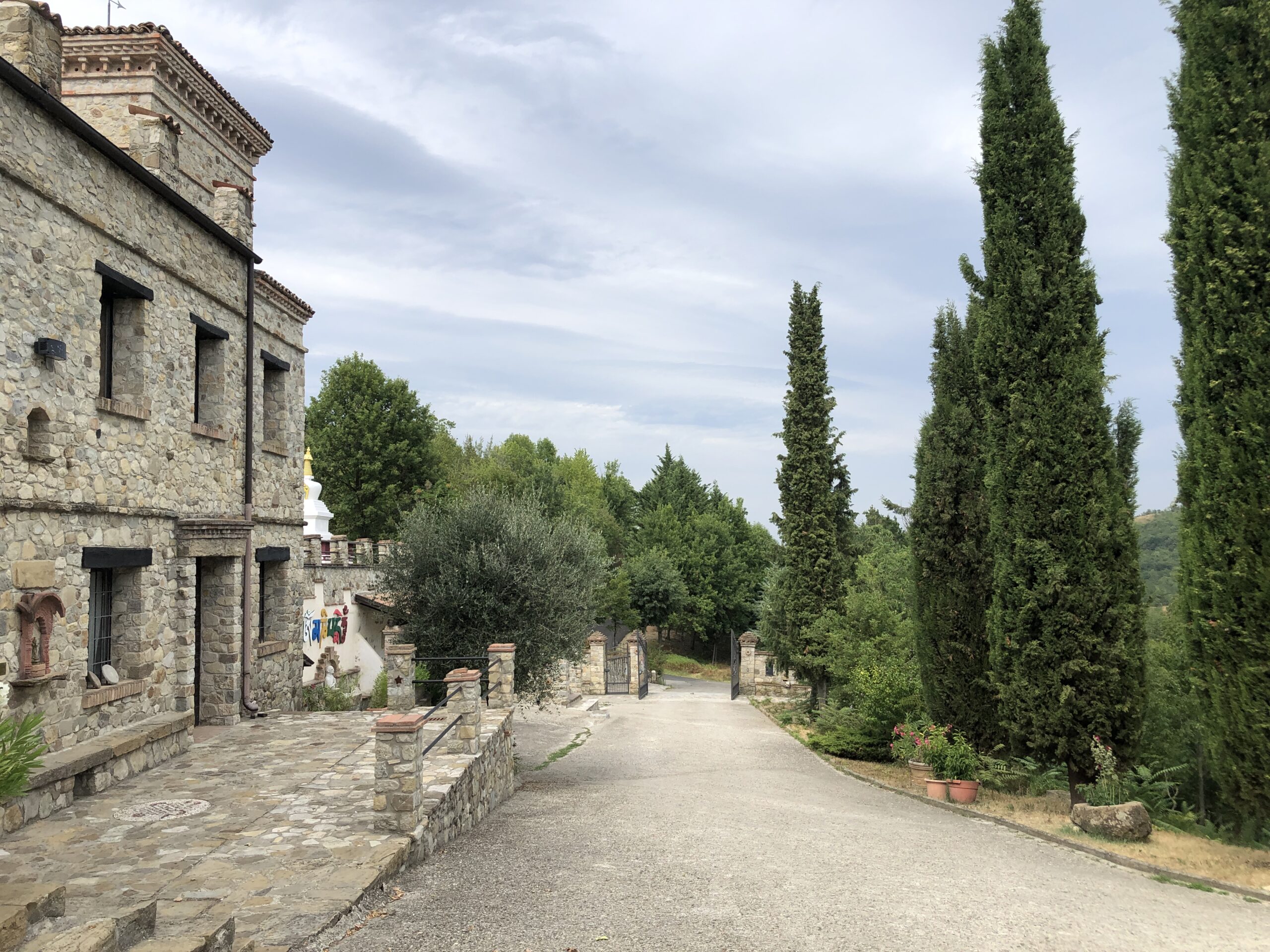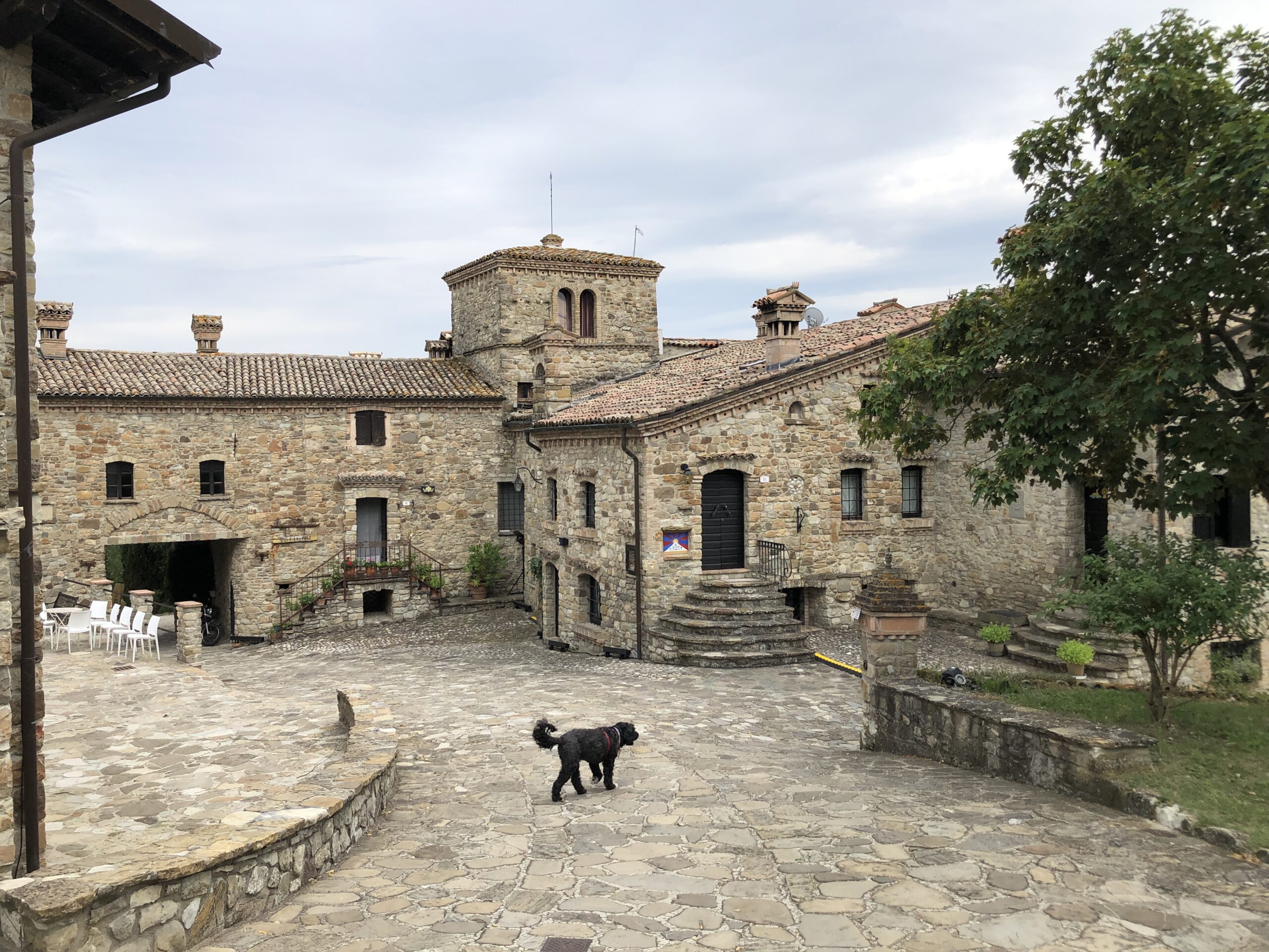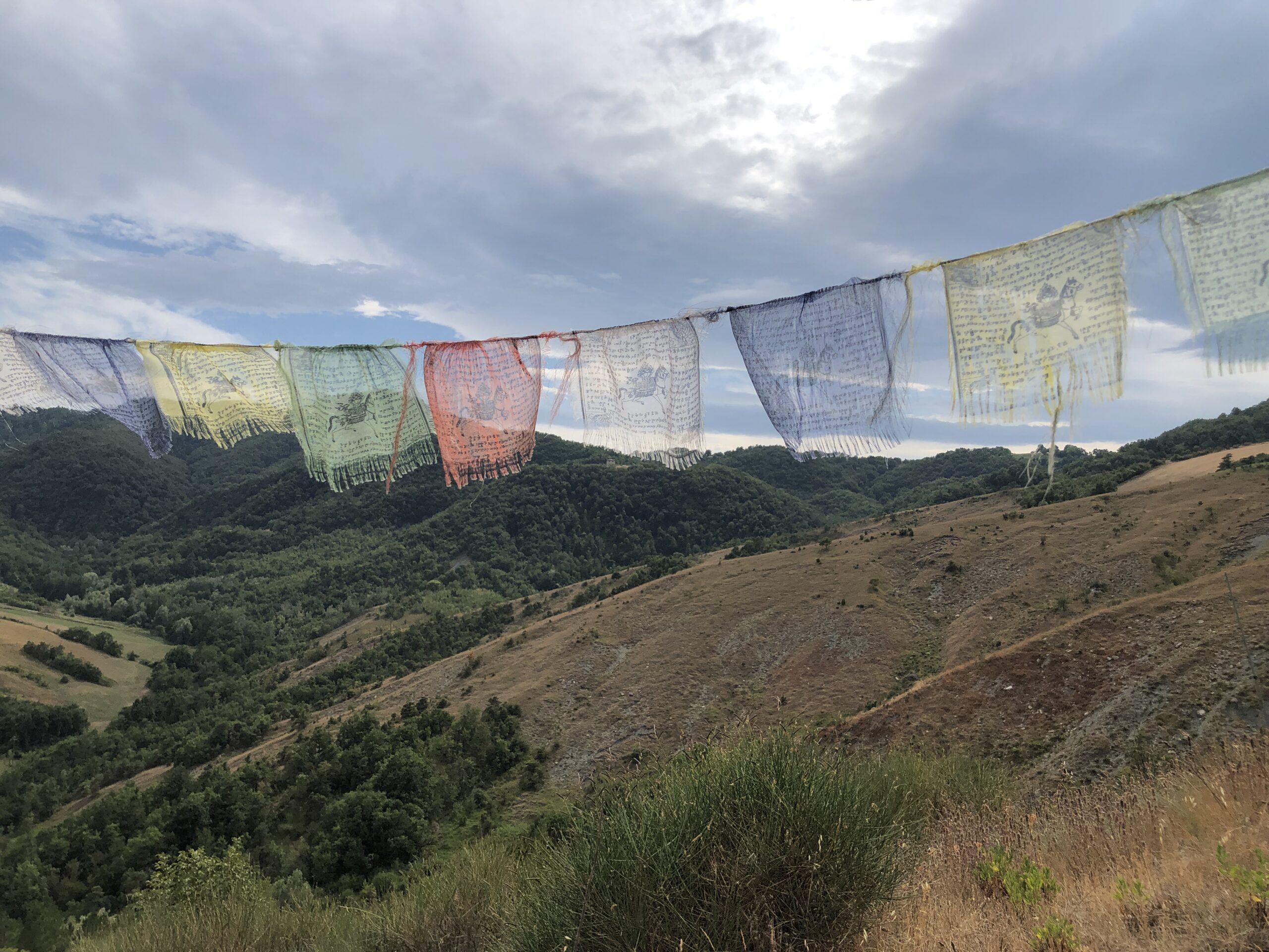Sono da sola in questa intima piazza dal sapore rustico (nonostante la grande scacchiera a terra). Probabilmente in Tibet ci sarà lo stesso dolce silenzio, gli stessi disegni sacri dai colori accesi, la stessa cura meticolosa per la natura circostante.