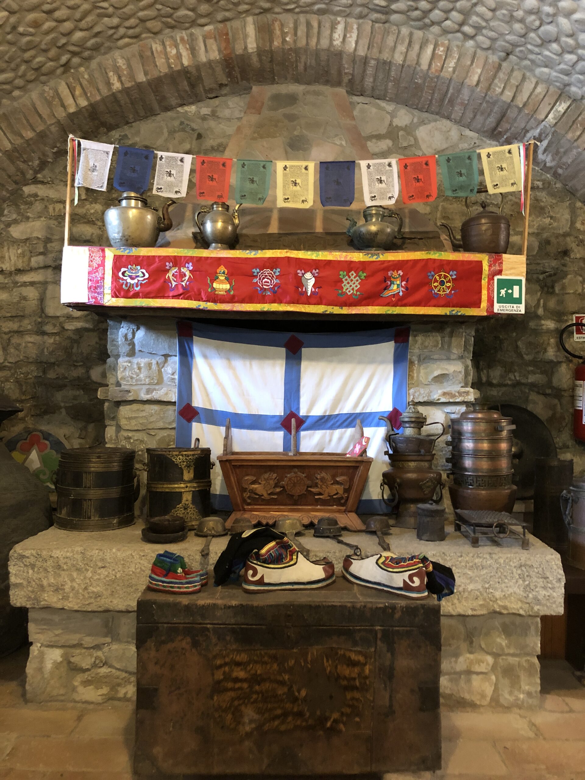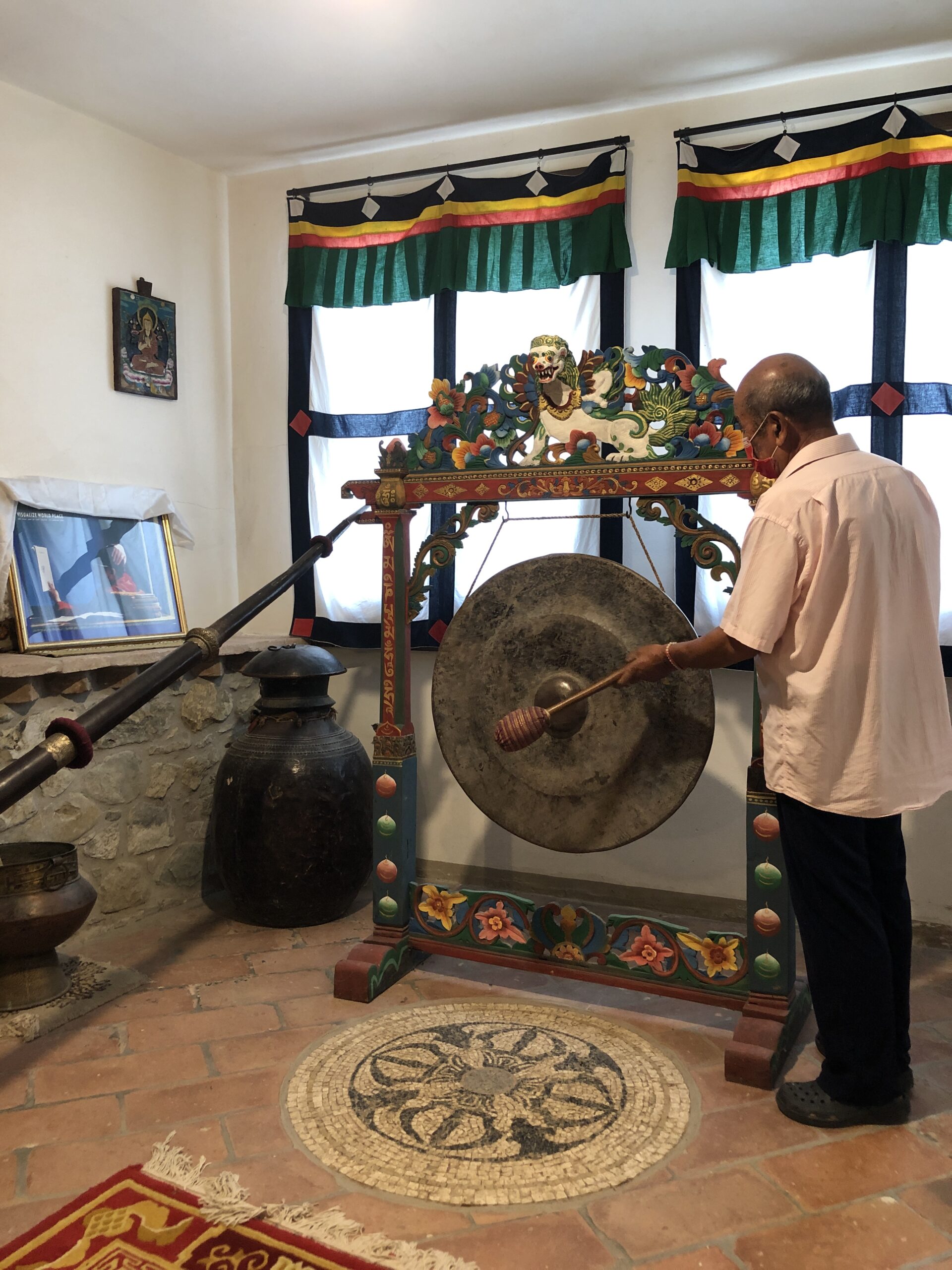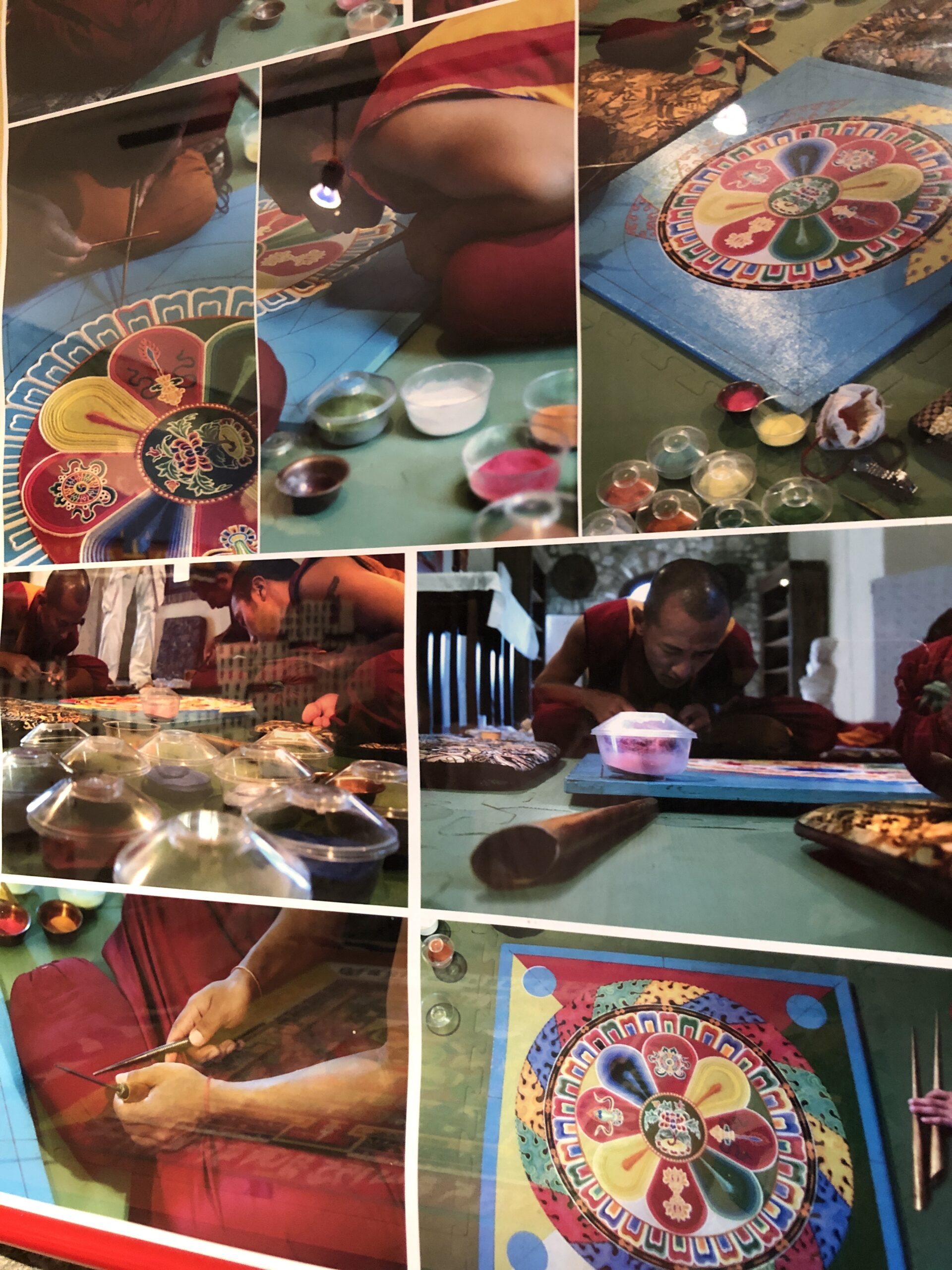 Il museo è ricco di oggetti antichi e costumi tradizionali. Al momento del suono del gong sento ogni fibra del mio essere vibrare come il metallo del grande piatto battuto ripetutamente. Una sensazione accattivante e liberatoria. Nonostante siano molte le cose che non avevo mai visto, almeno non da così vicino, quella che mi ha colpito di più oltre ogni immaginabile aspettativa, è stata il mandala. Un disegno fatto con sabbia colorata da sei monaci tibetani in sei giorni interi di lavoro. Un’opera di una perfezione geometrica impressionante, come fosse un infiorata in miniatura. Si chiama mandala della medicina e, nonostante ne sconosca le virtù religiose, resto stupefatta dall’esecuzione.